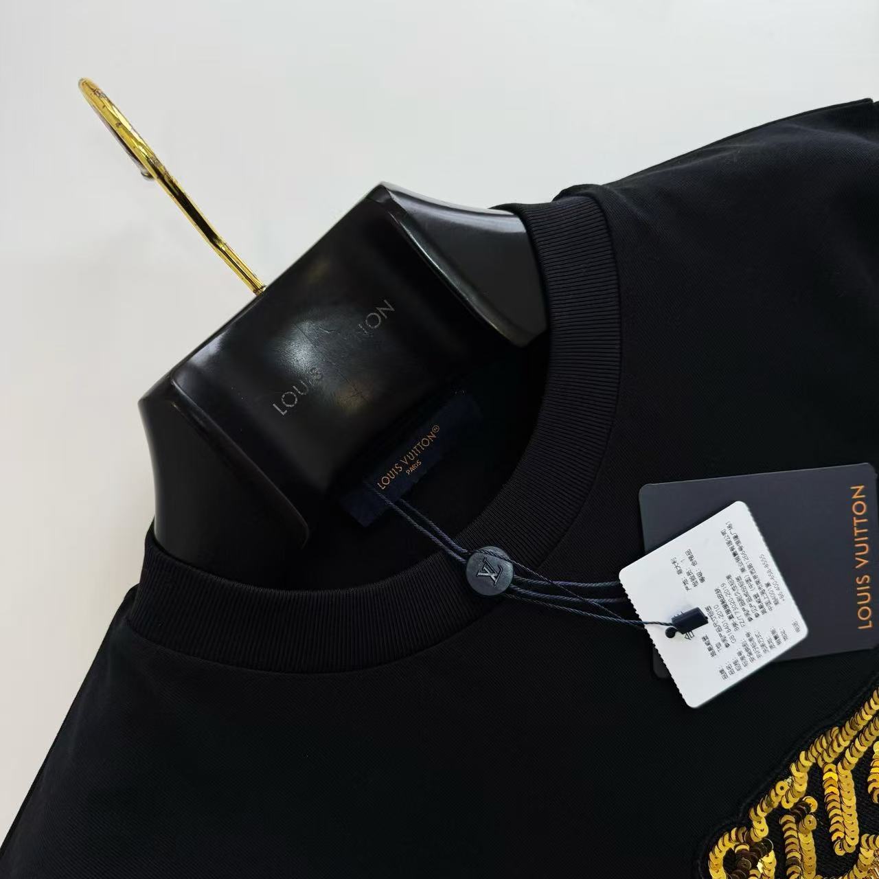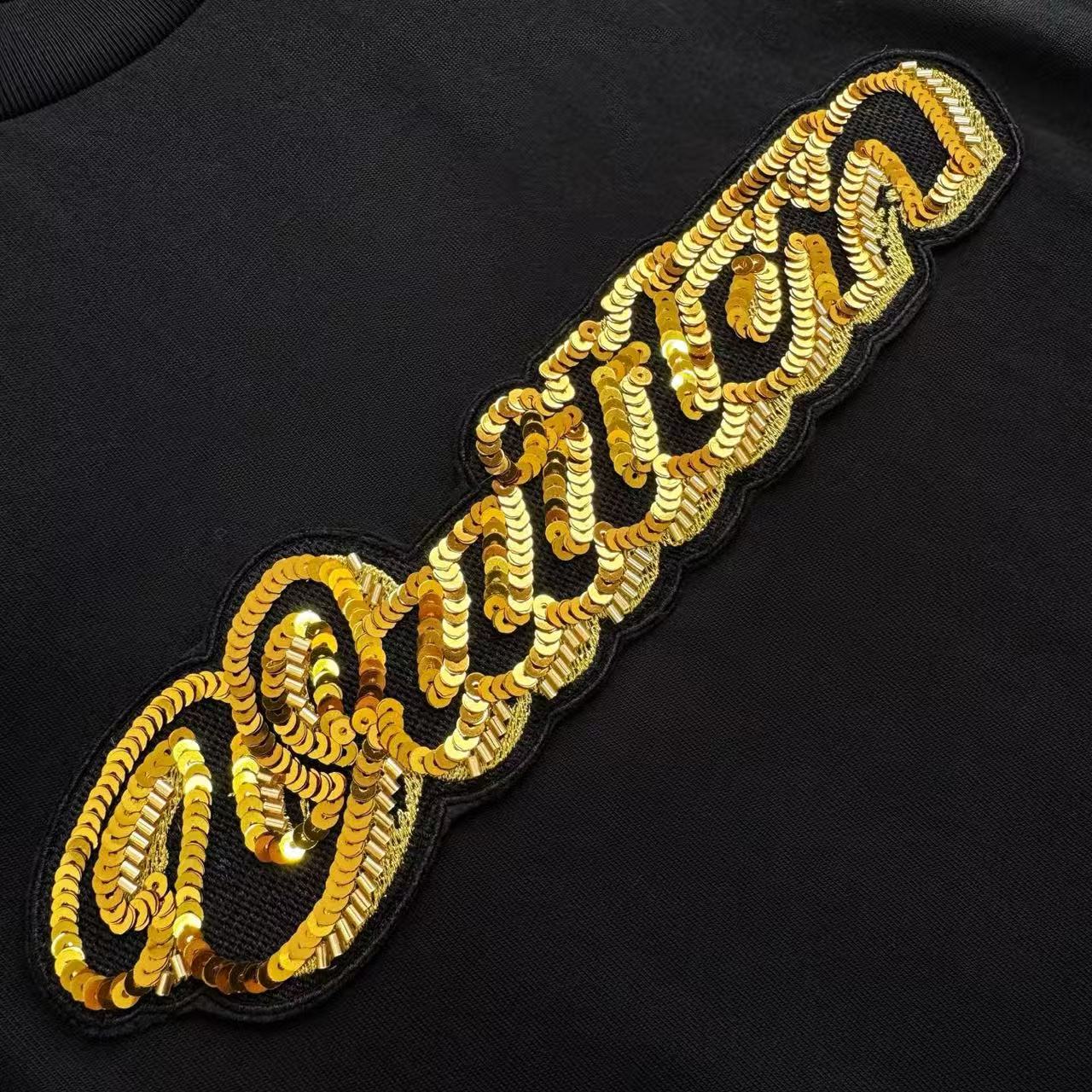 這款短袖最迷人之處在於其雙面視覺的層次感。正面以極致精密的亮片刺繡勾勒品牌標識,在不同光線下閃爍著細緻的光澤;背部則更進一步,採用了工序繁瑣的珠飾珠片繡章技術,將細小的珠粒與片材立體堆疊,營造出如同裝置藝術般的浮雕質感。
