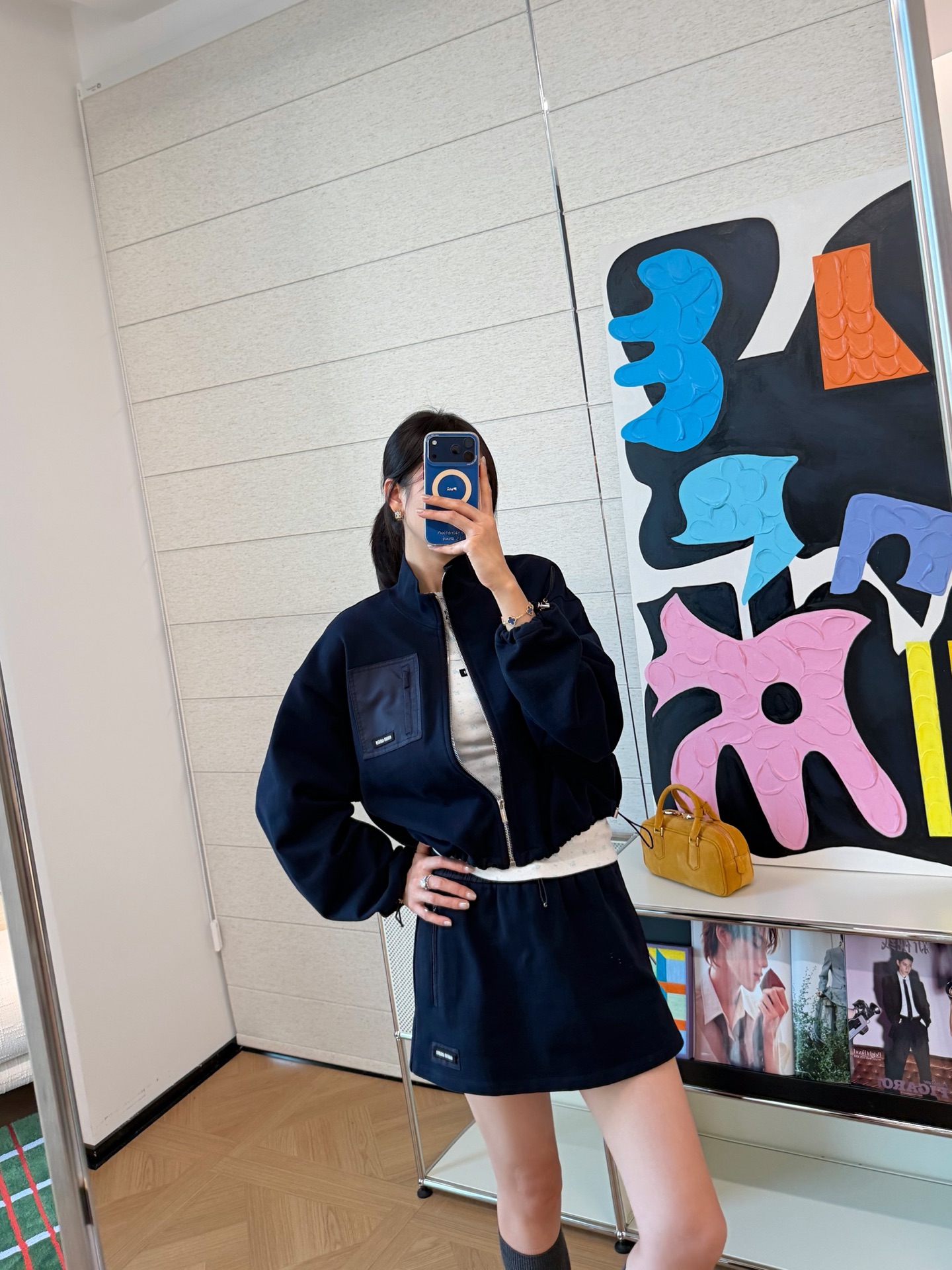 這款一眼就讓人留下深刻印象。低調卻很有存在感的深藍色調,結合短版剪裁與運動元素,穿起來俐落有型,輕鬆詮釋現代休閒風格。