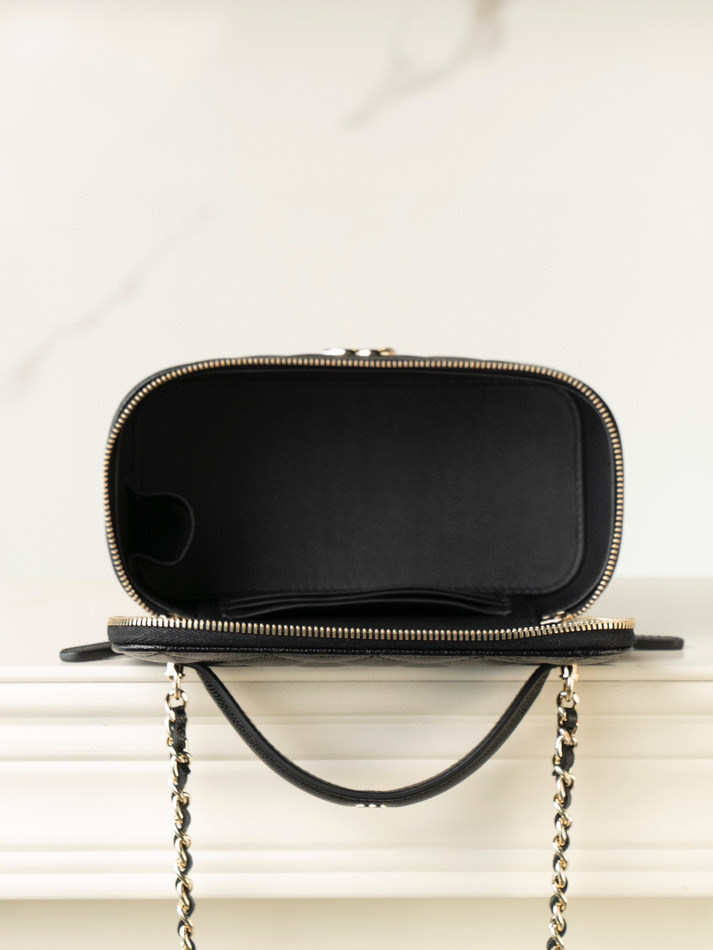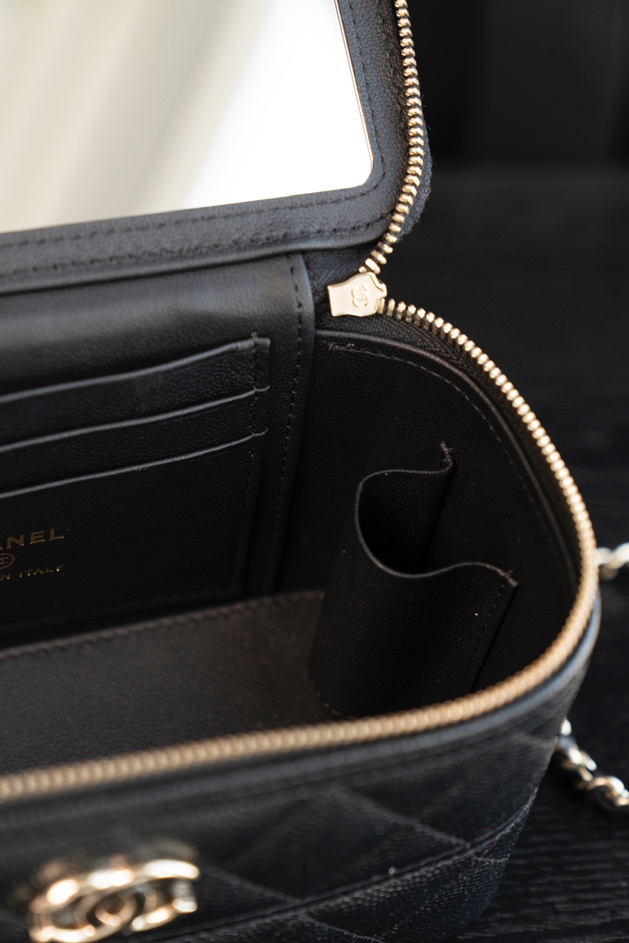 內裡: 黑色牛皮, 多夾層設計,加上內建鏡子,實用性滿分。