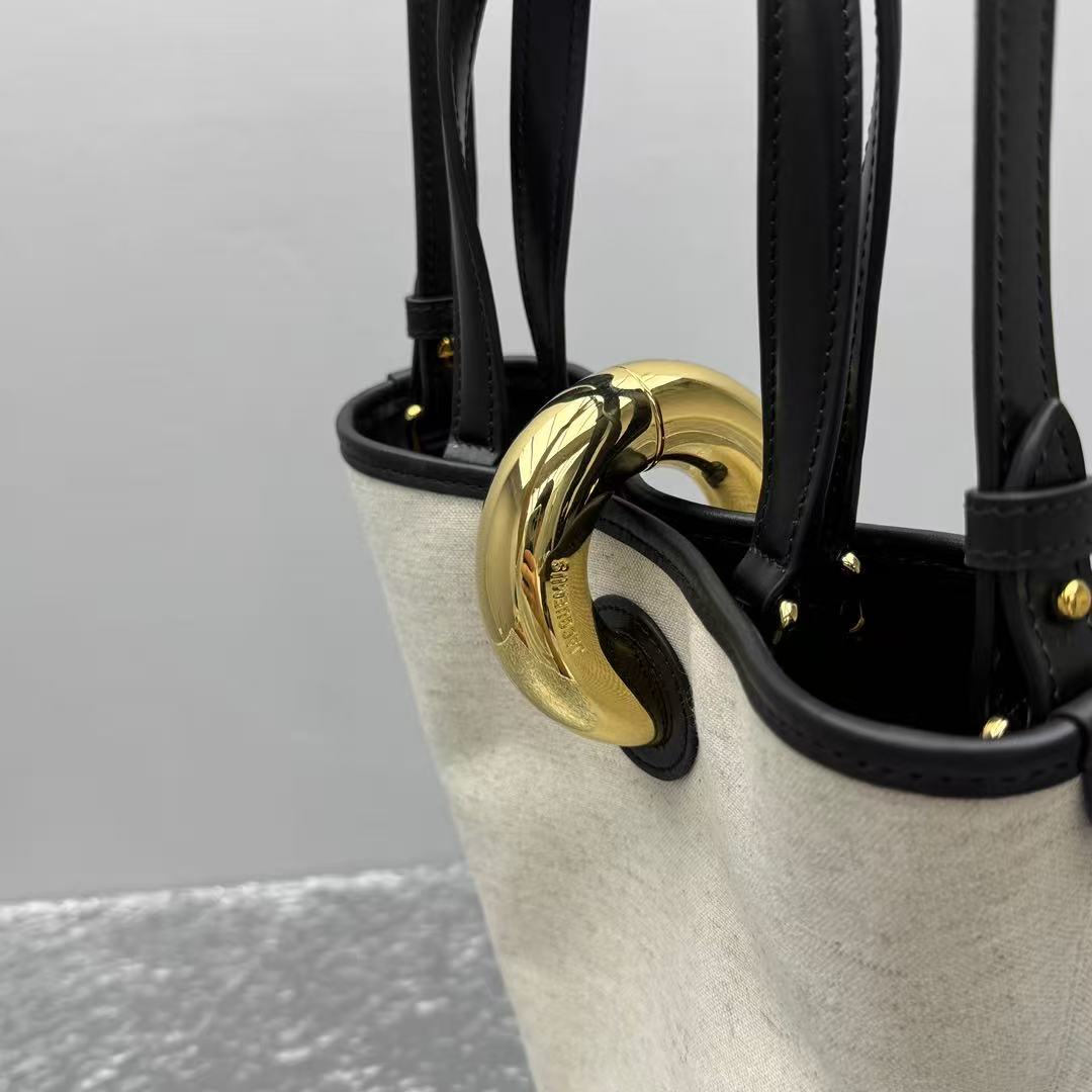 這款Le Petit Bambo手提包以不對稱菜籃子造型顛覆傳統,打破常規的設計感讓人一秒愛上!標誌性大金屬扣飾是全包的吸睛亮點,閃耀的金屬光澤為簡約造型增添一抹奢華氣息,視覺效果直接拉滿!尺寸(底長10cm x 寬10cm x 高20cm)小巧精緻,容量卻足夠日常使用,輕鬆收納手機、錢包和化妝品等隨身物品。帆布拼皮設計打造出簡約而不簡單的質感,無論是手提還是單肩背,都能輕鬆拿捏優雅與隨性的完美平衡。從日常通勤到週末約會,這款包都能為你的造型加分,展現獨特的時尚態度!