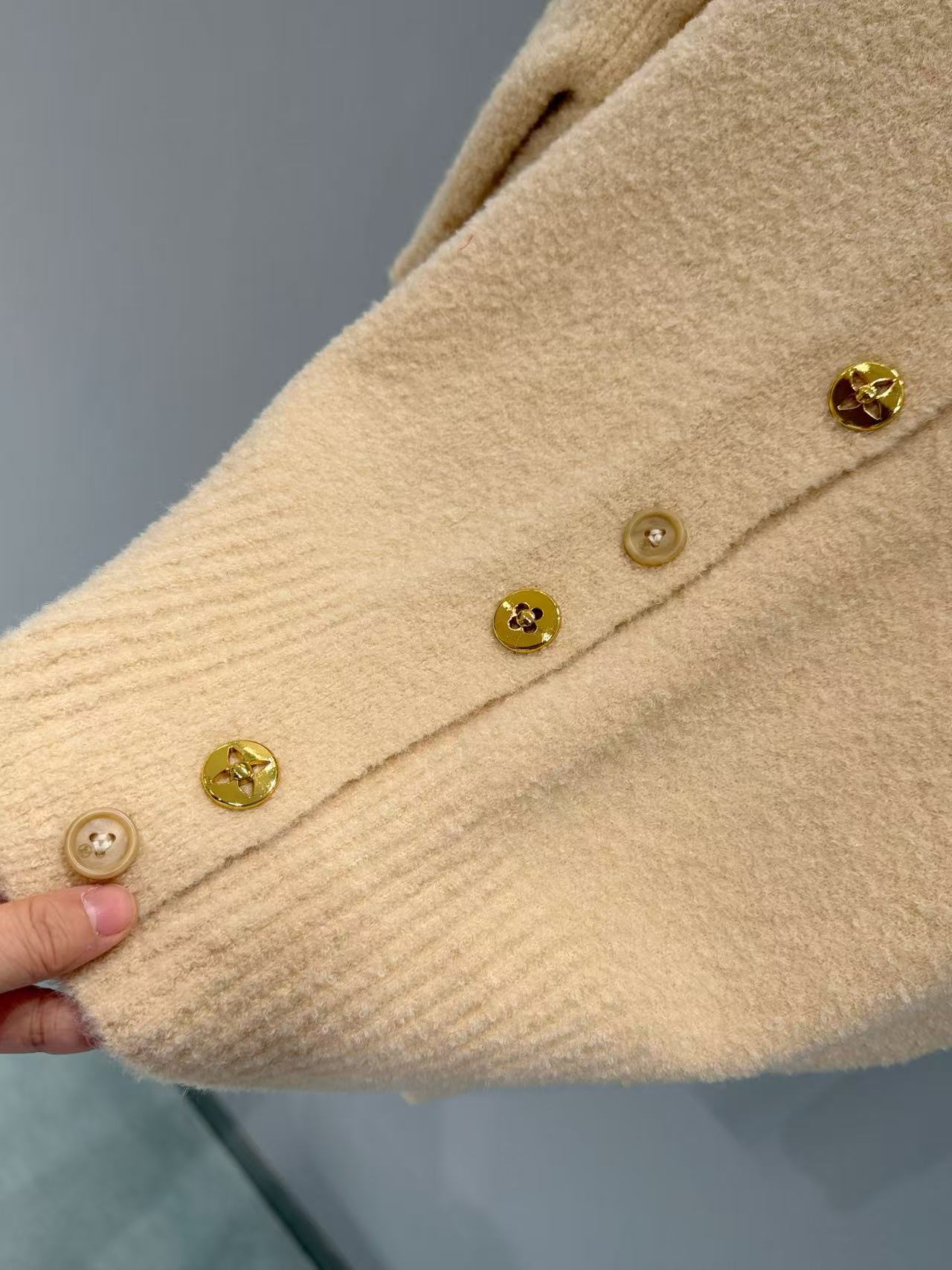 五金配件: 門襟處採用訂製金屬紐扣,表面刻有經典 Logo,手感厚實有份量。