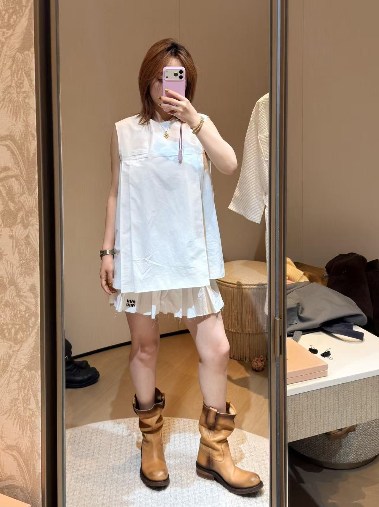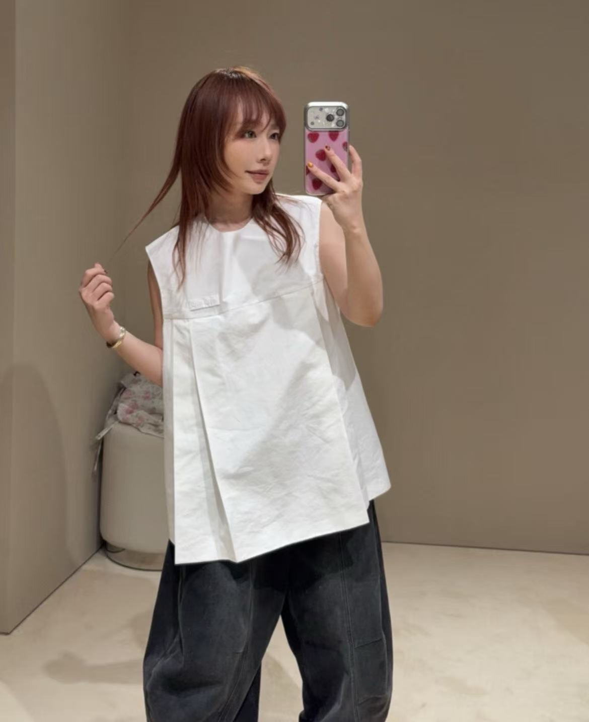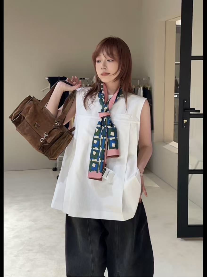 無袖剪裁搭配稍微寬鬆的廓形,不論什麼身形都能穿出那種慵懶隨性的 Miu 系調性。