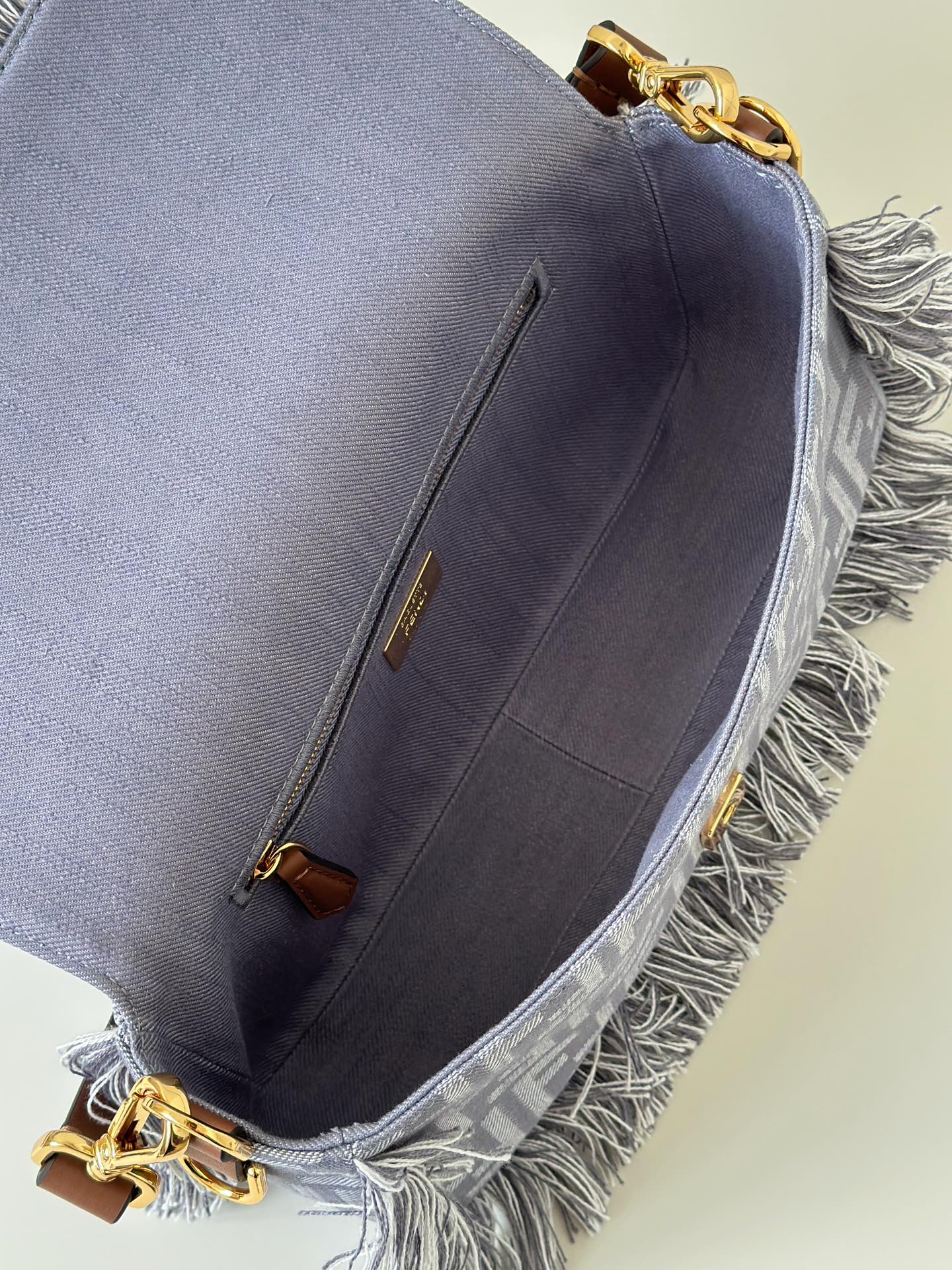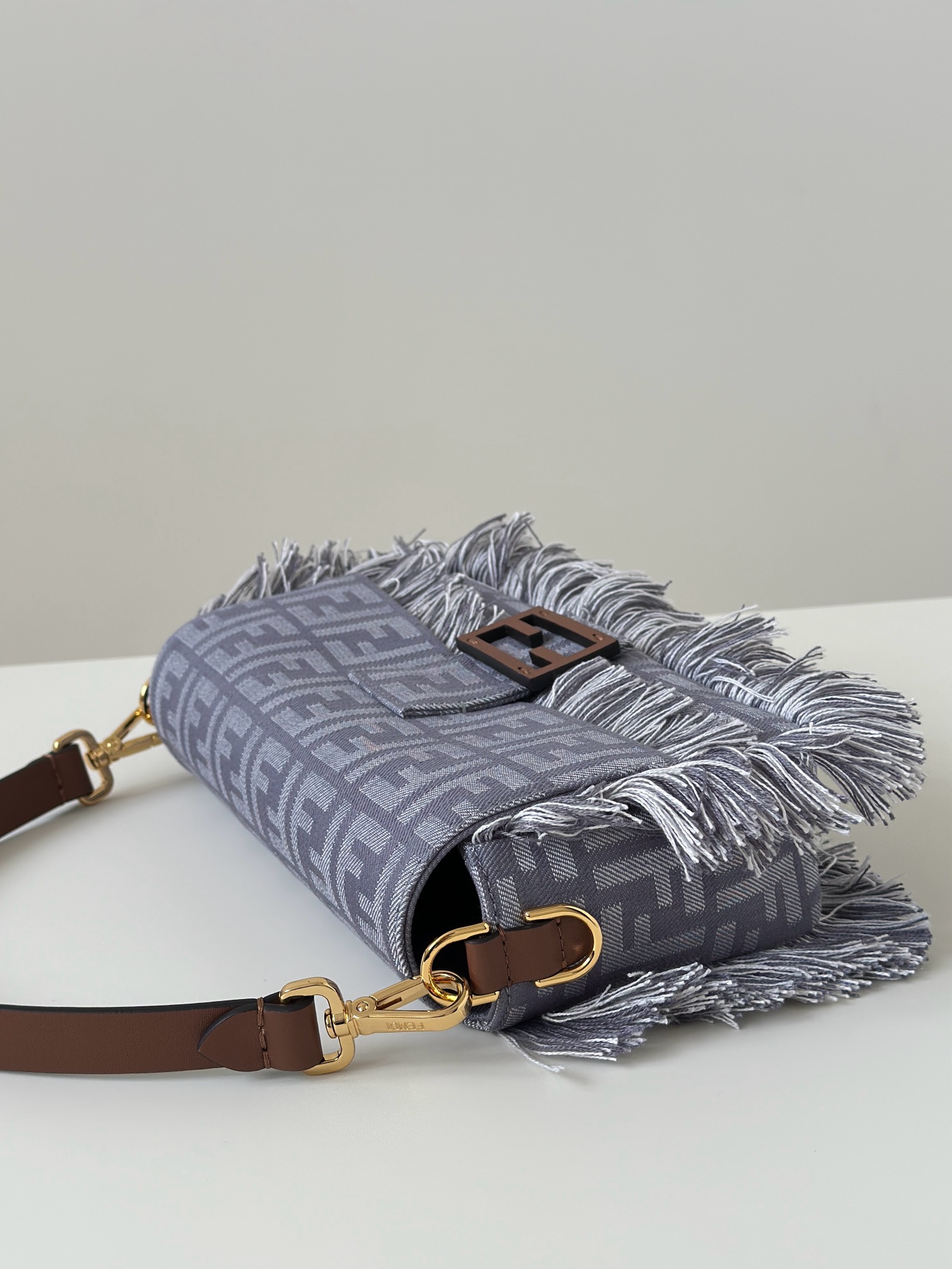 採用高質感牛仔提花材質,紋理清晰、層次感豐富,觸感挺實且耐用。搭配經典 FF monogram 元素,結合流蘇裝飾,展現品牌獨有的精緻與玩心。