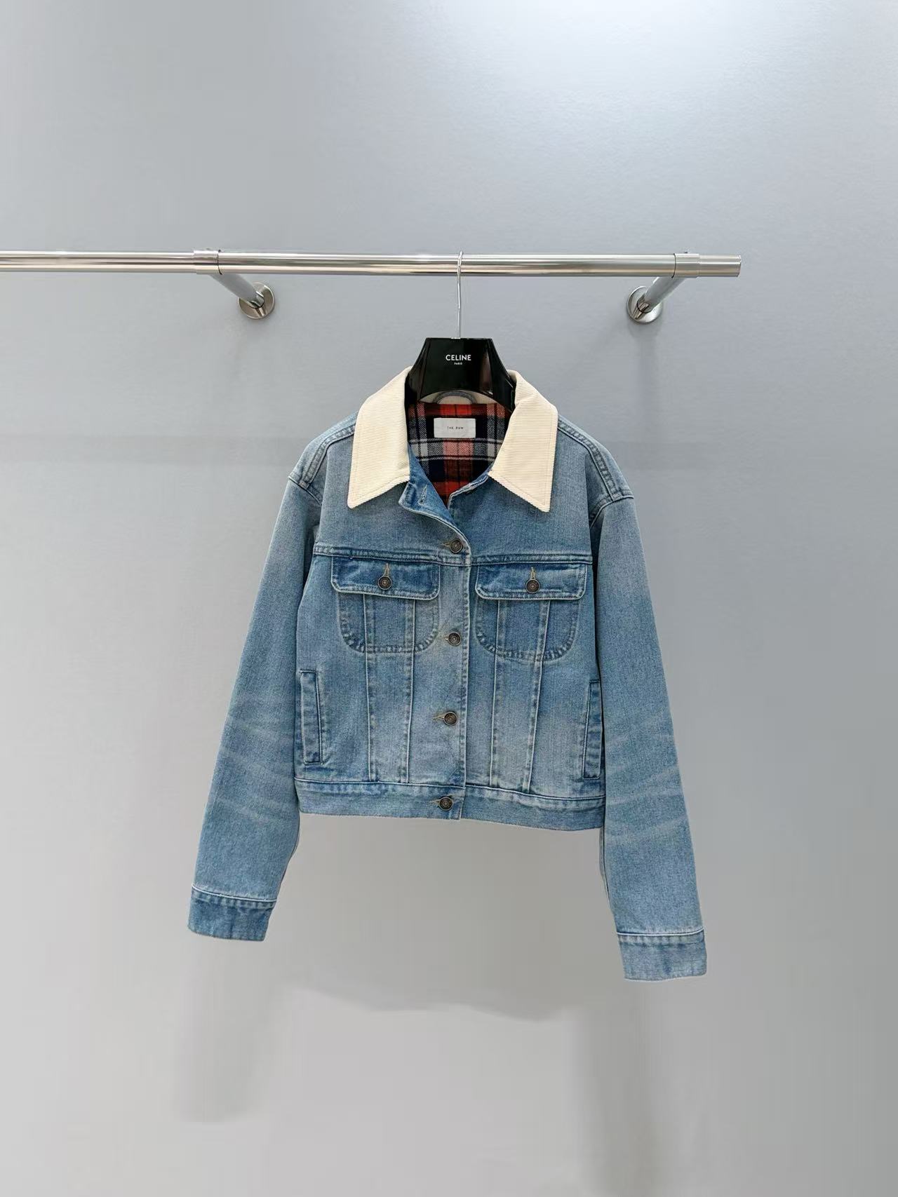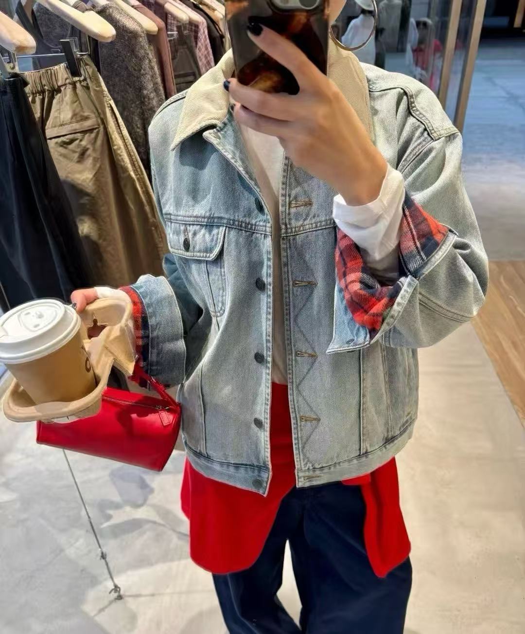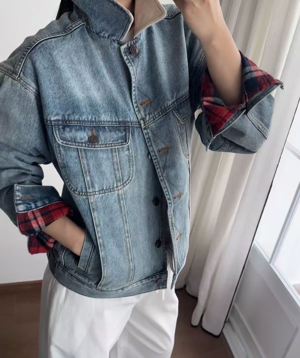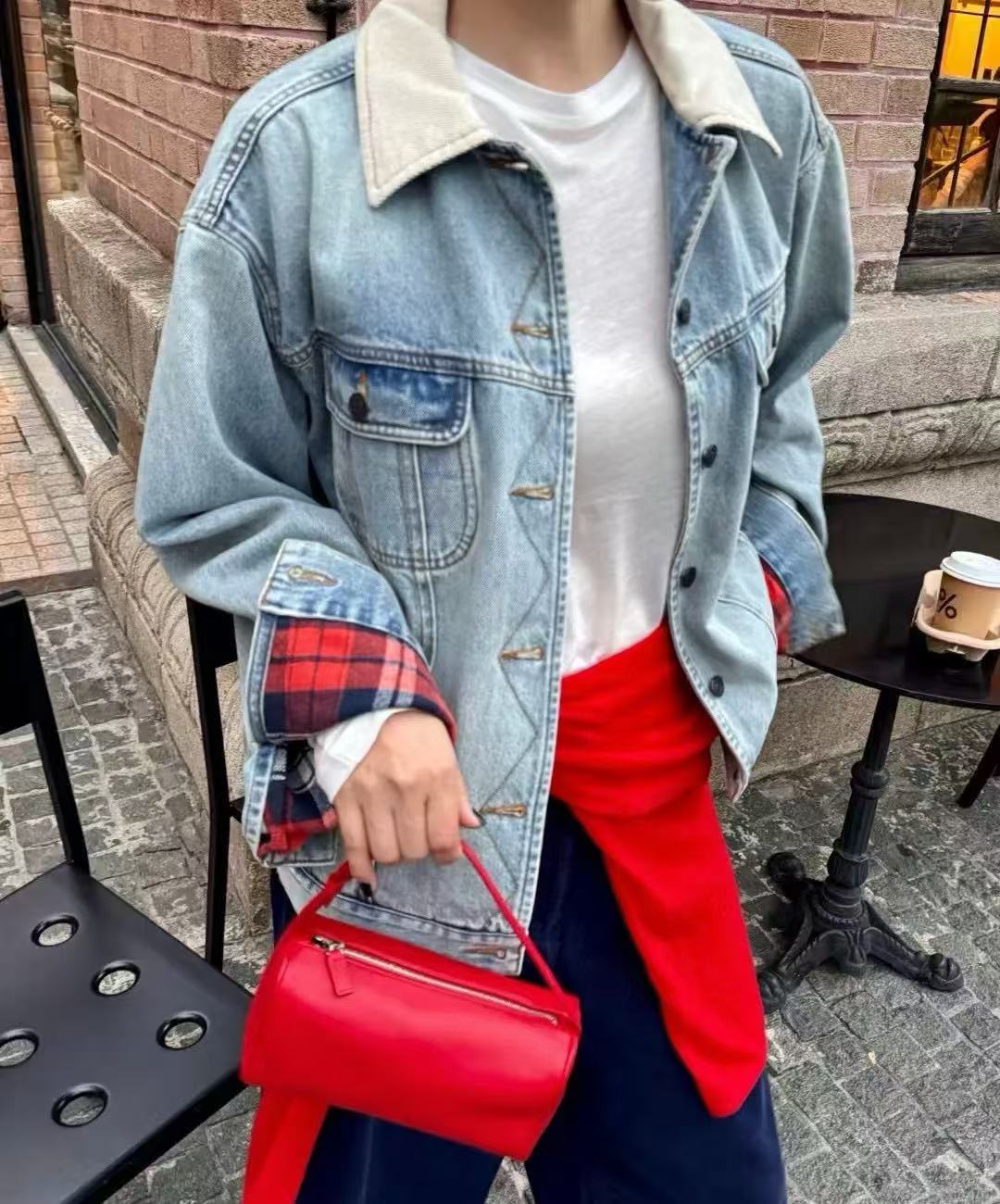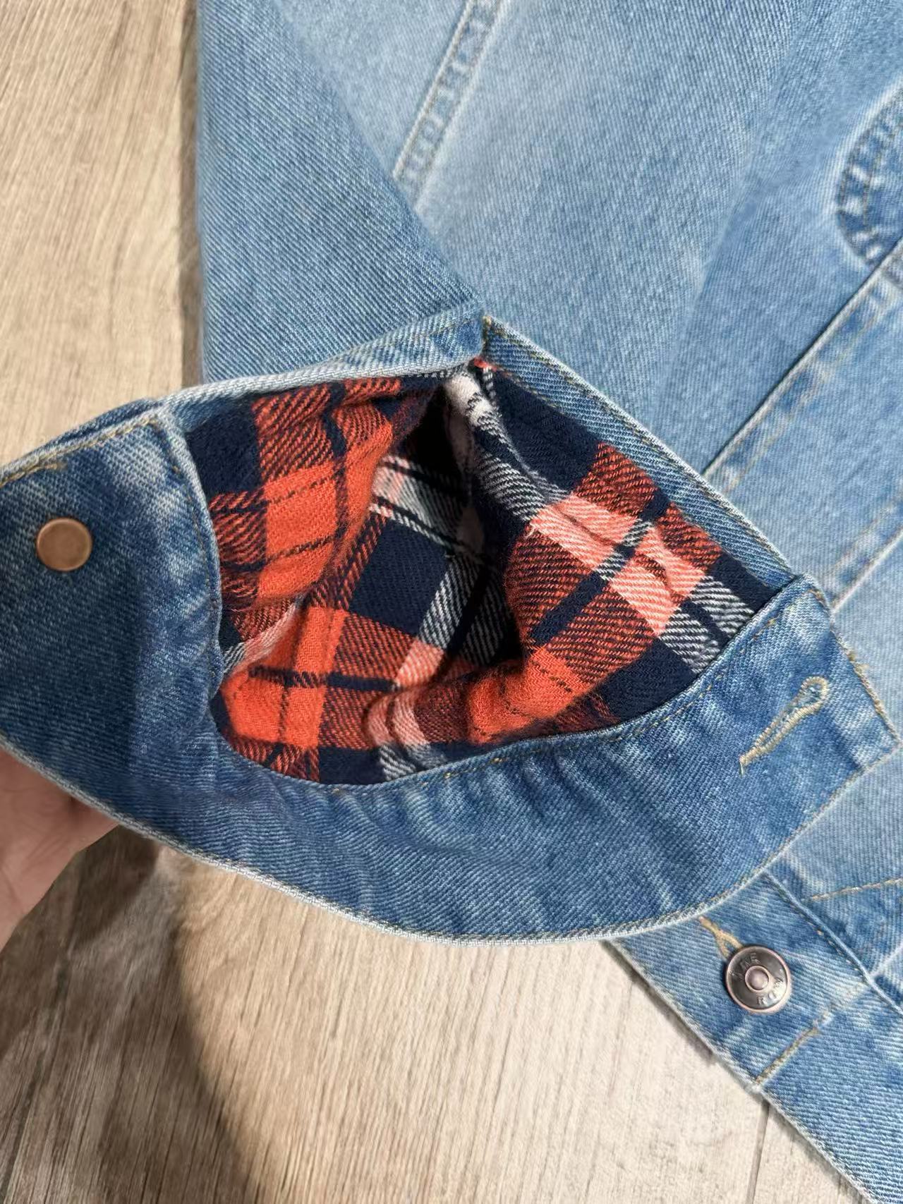 外層是經典 洗水牛仔材質,內裡拼接 格紋襯裡,厚實保暖卻不顯笨重。