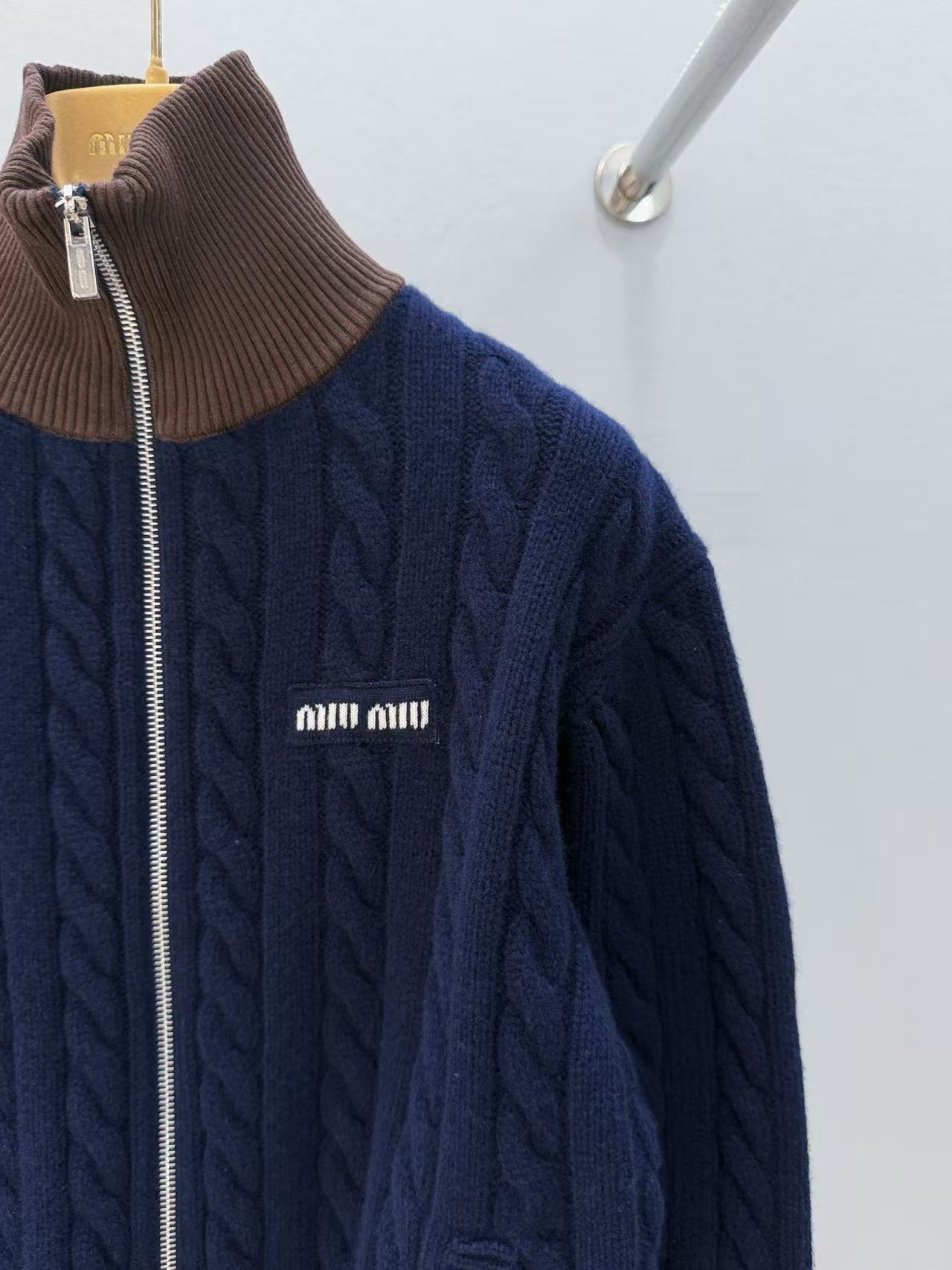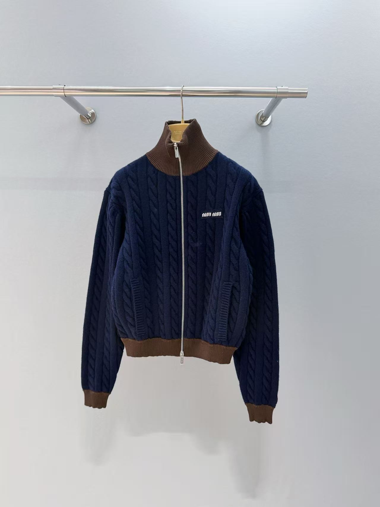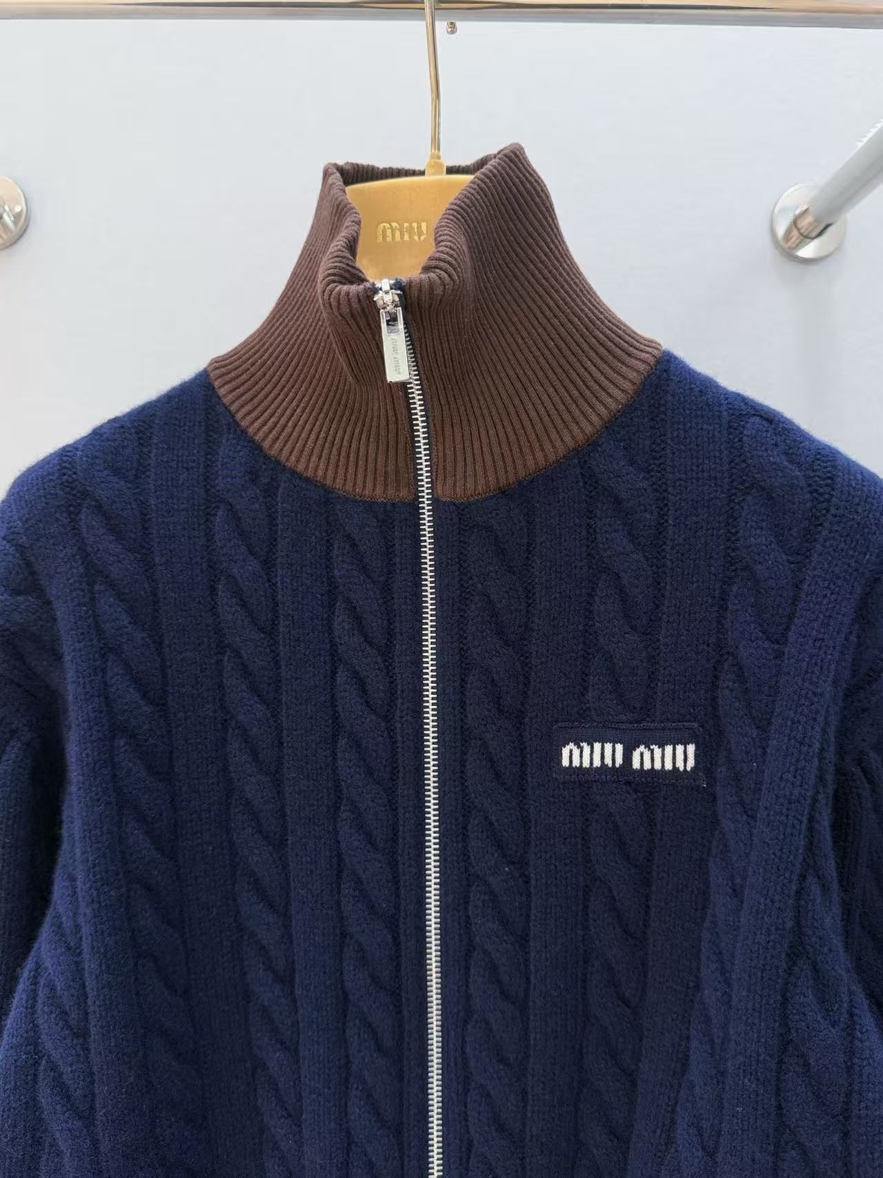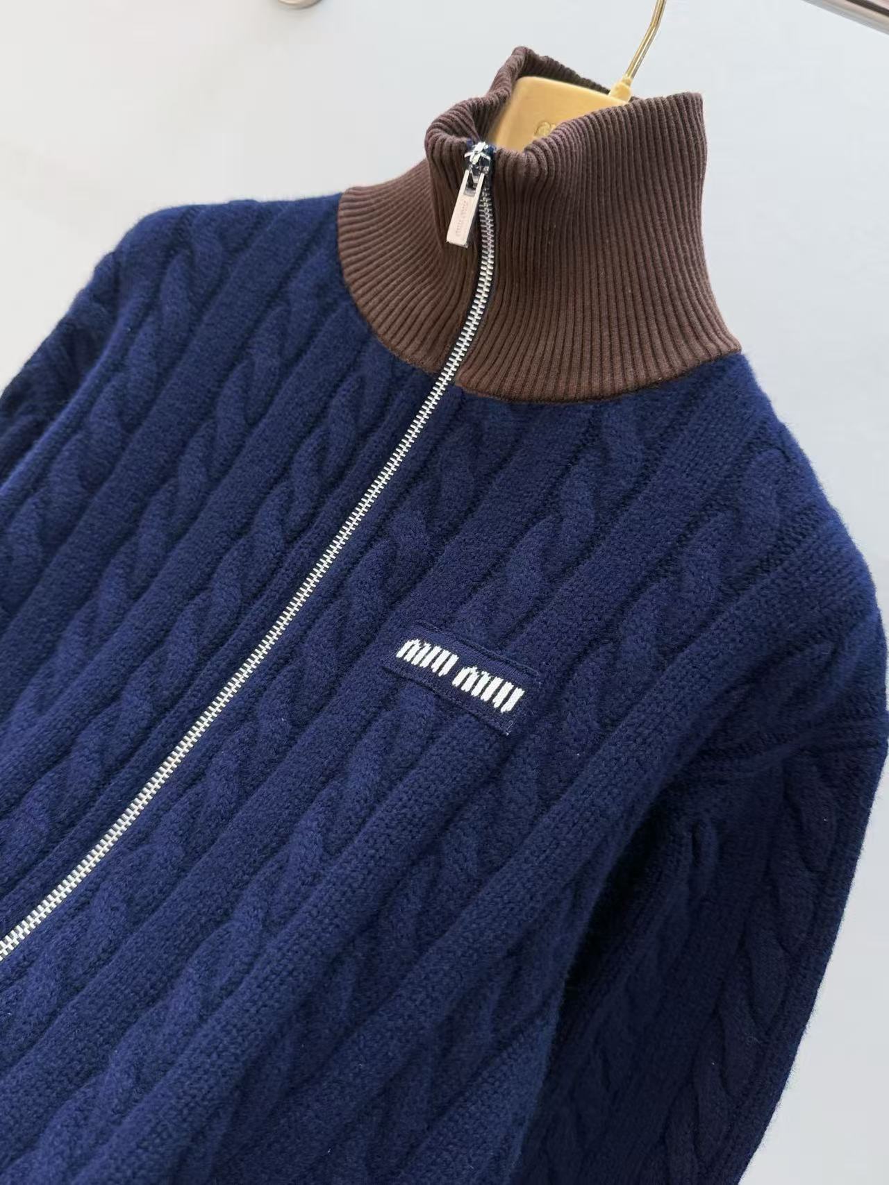 2025早秋 Miu家 棕色撞色針織立領拉鏈外套