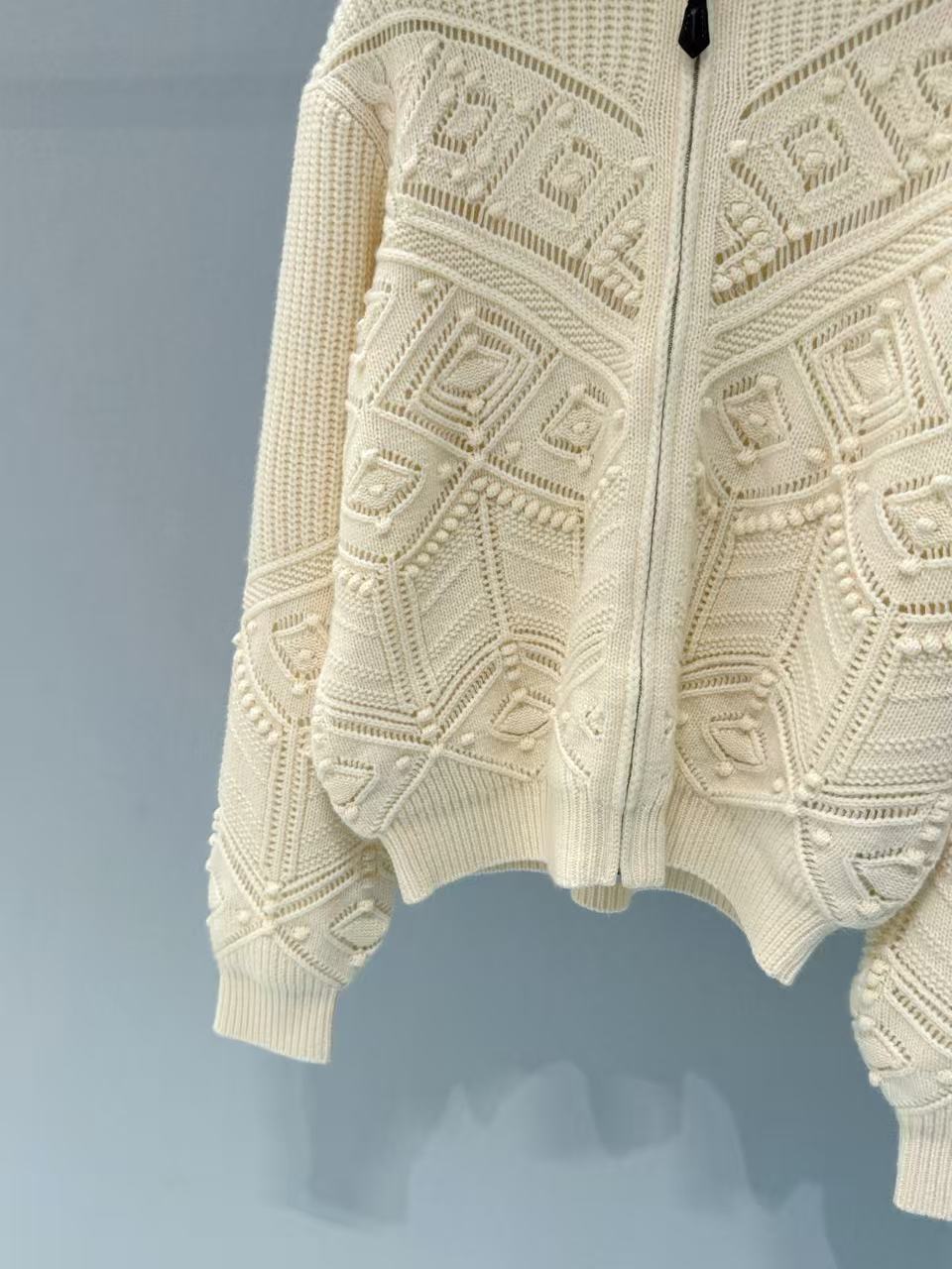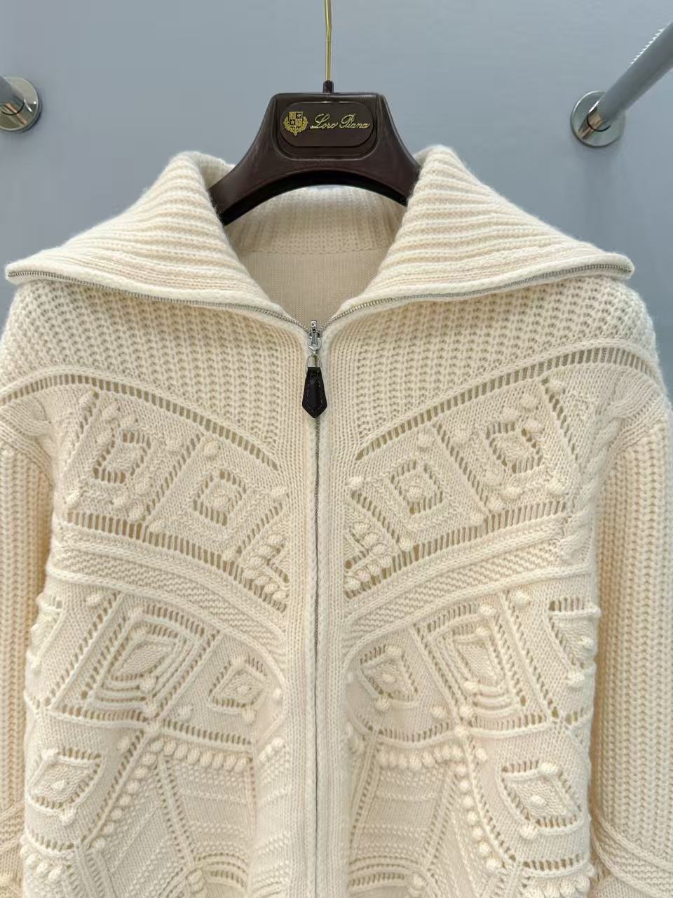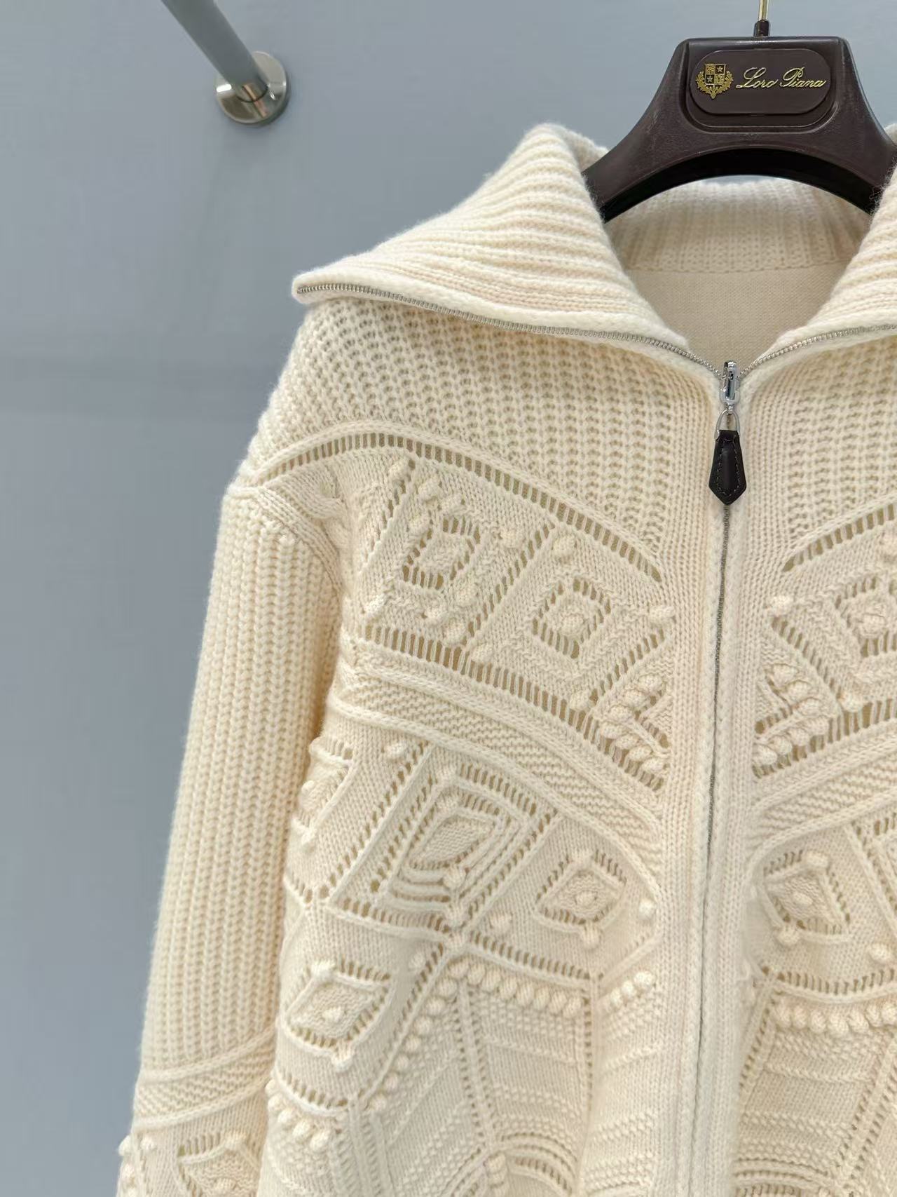 領子可立領擋風保暖,也能翻折成休閒翻領,拉鍊頭的皮質掛墜是品牌經典的低調奢華標誌,針織紋理對稱工整,做工細膩到每一處都挑不出毛病,質感完全藏在看不見的工序裡!