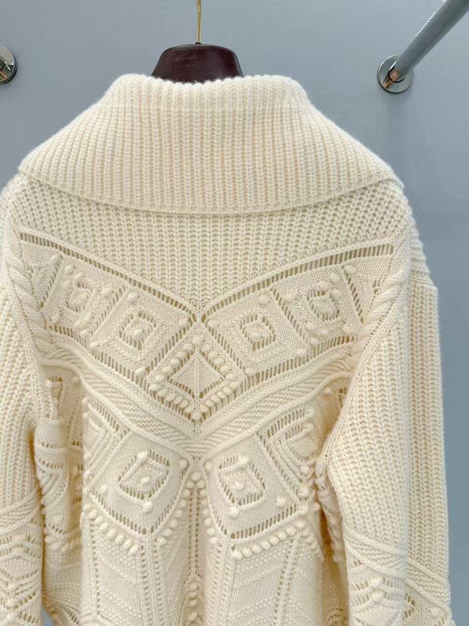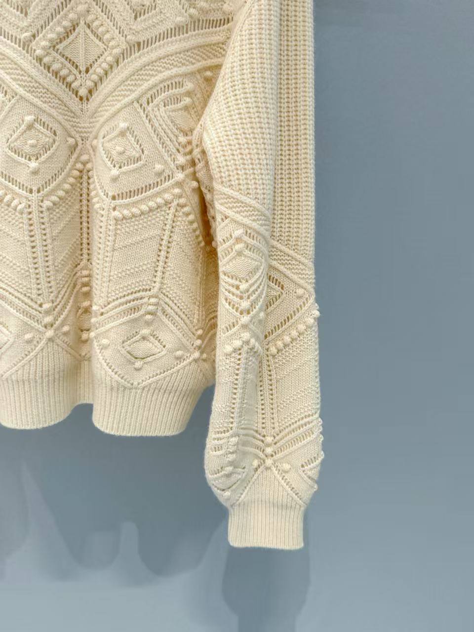 衣身滿版的菱形格紋搭配立體毛球肌理,遠看低調近看超有質感,每一顆毛球都是手工定位,摸得到那種精緻的立體感,比一般針織衫更有辨識度。