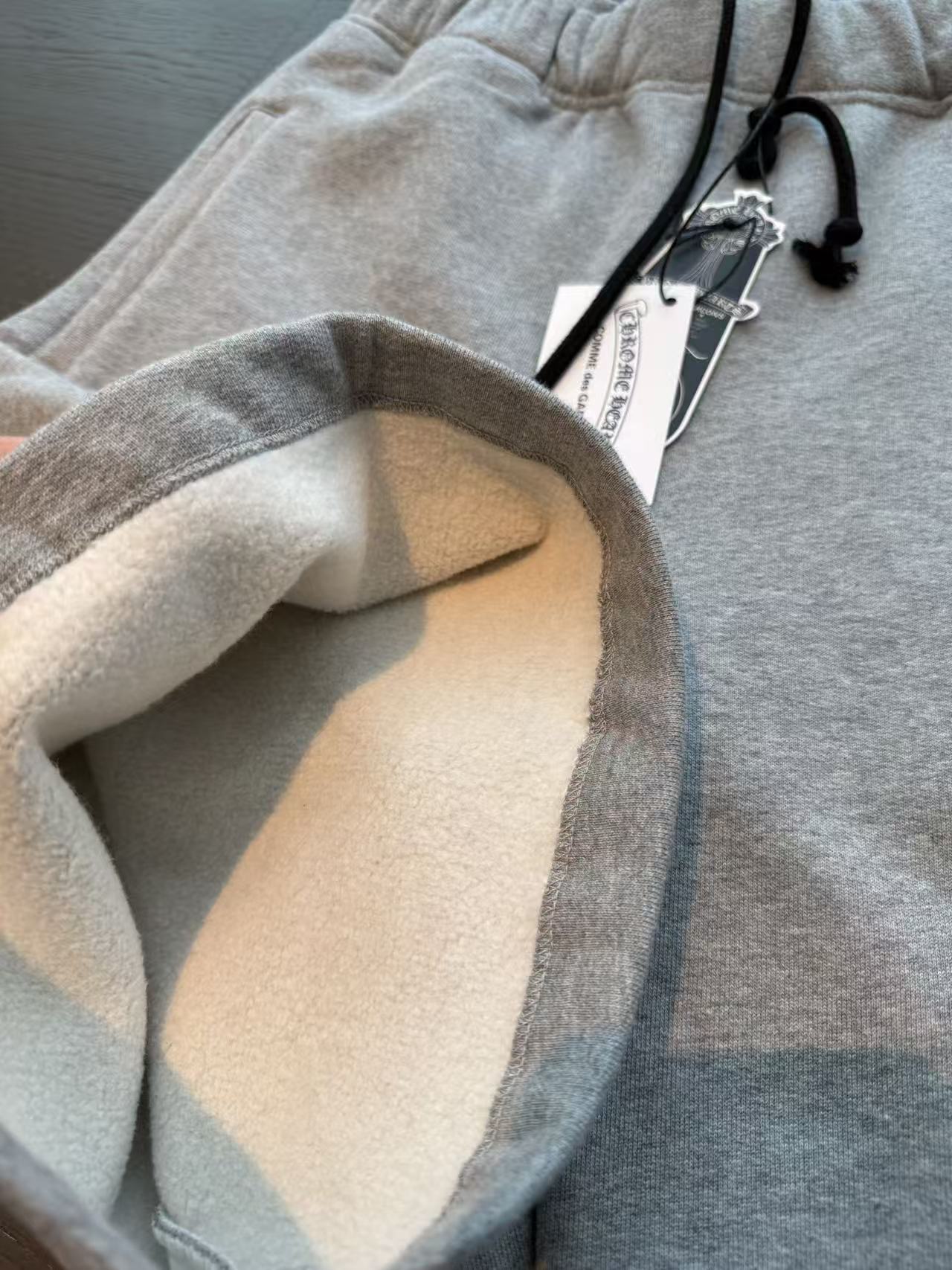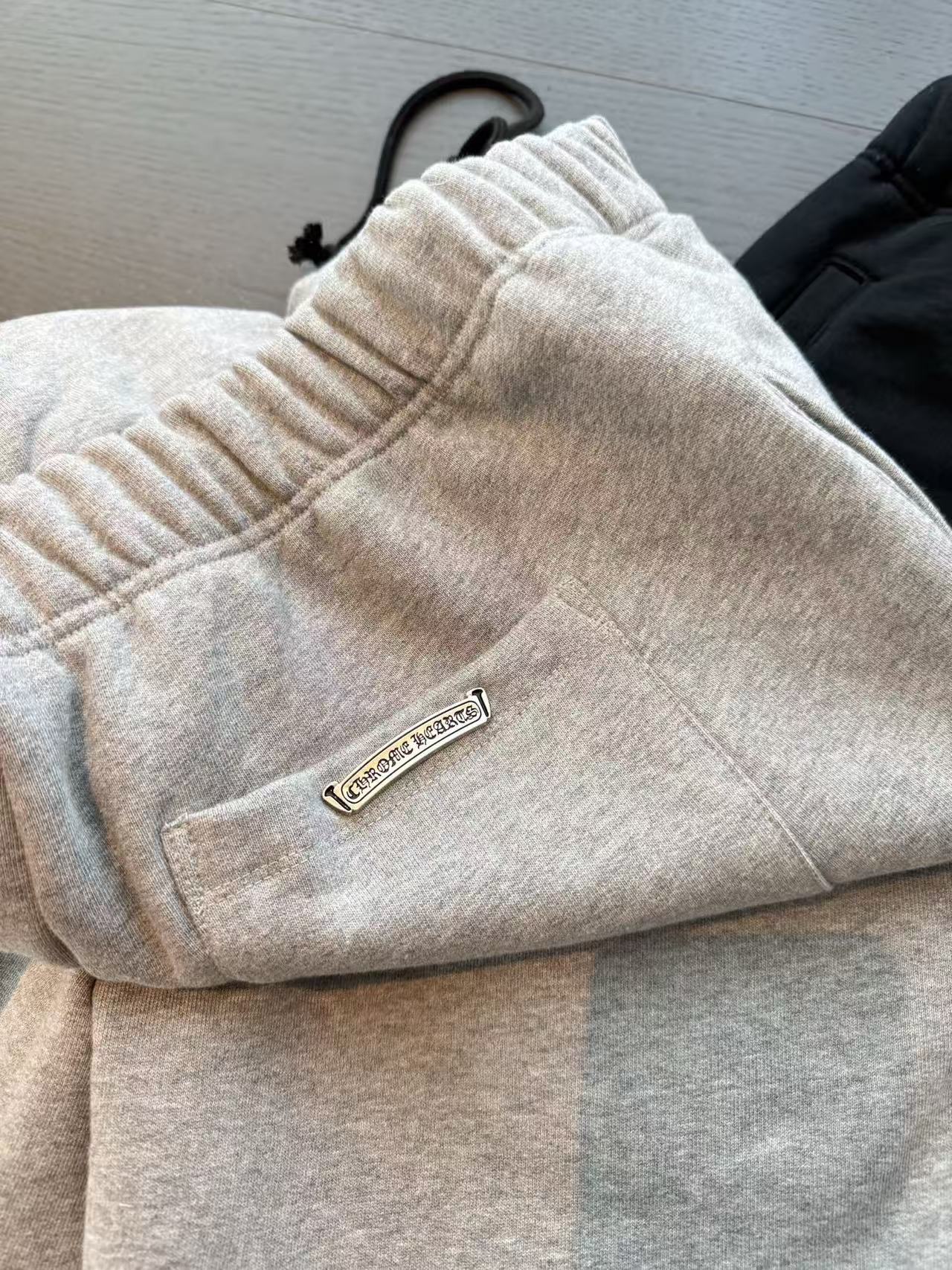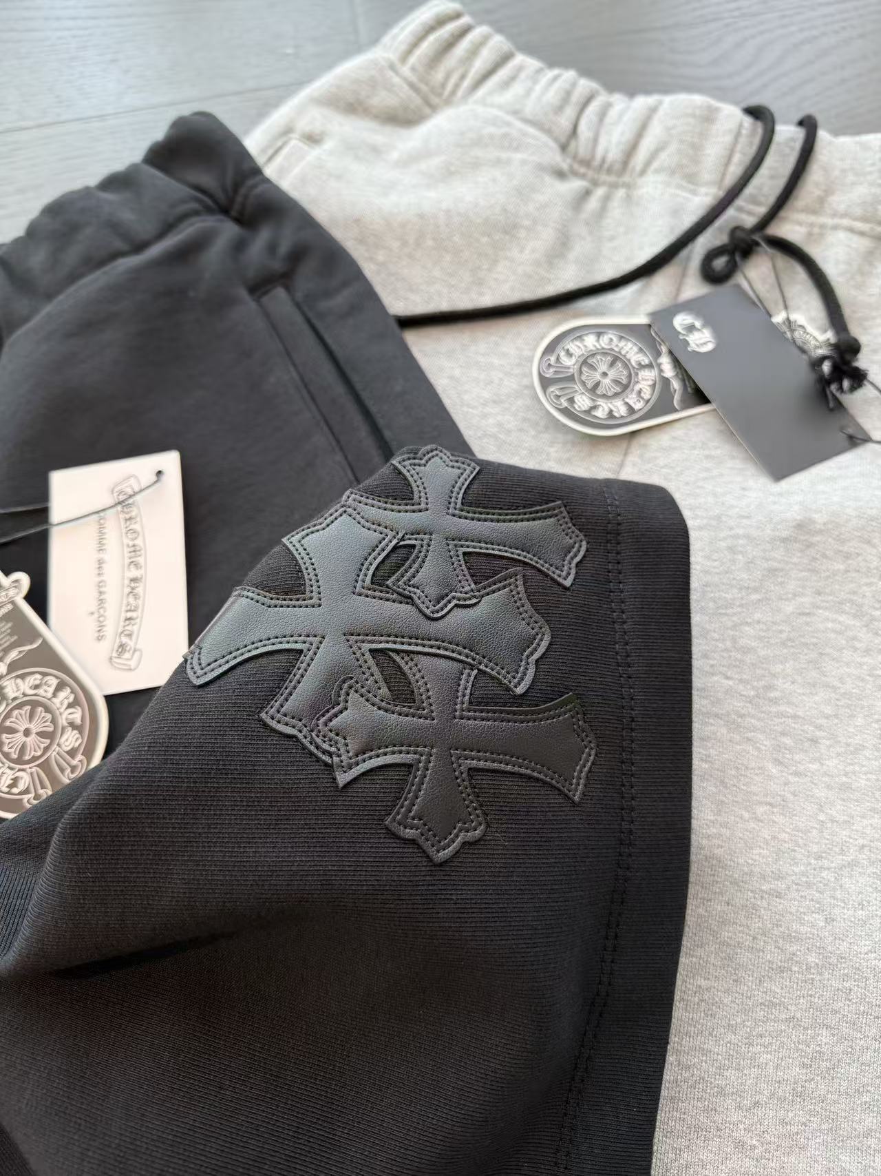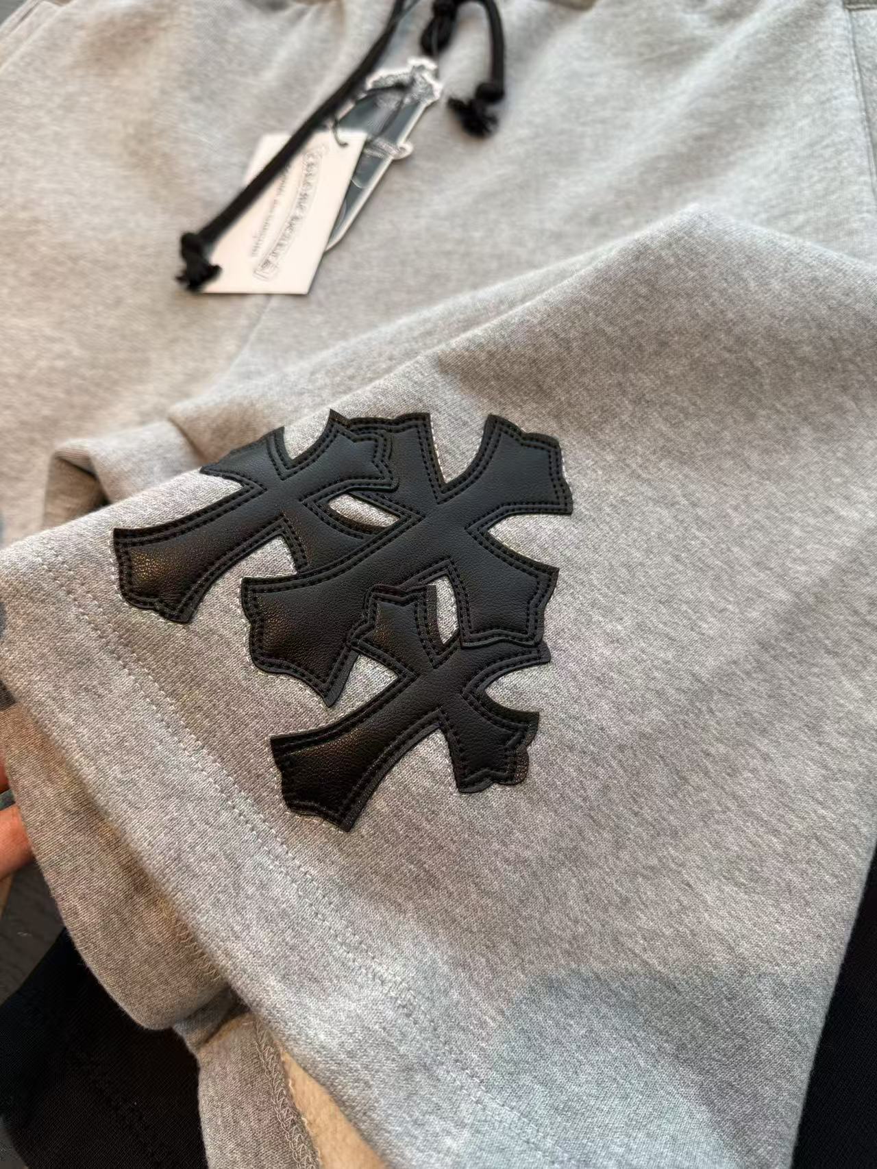 十字架符號始終是不可撼動的靈魂。這次分享的 三叉戟拼皮十字架毛圈抓絨衛褲,將品牌最核心的叛逆基因,透過極致的重磅材料與複雜的異形貼布技術重新詮釋。