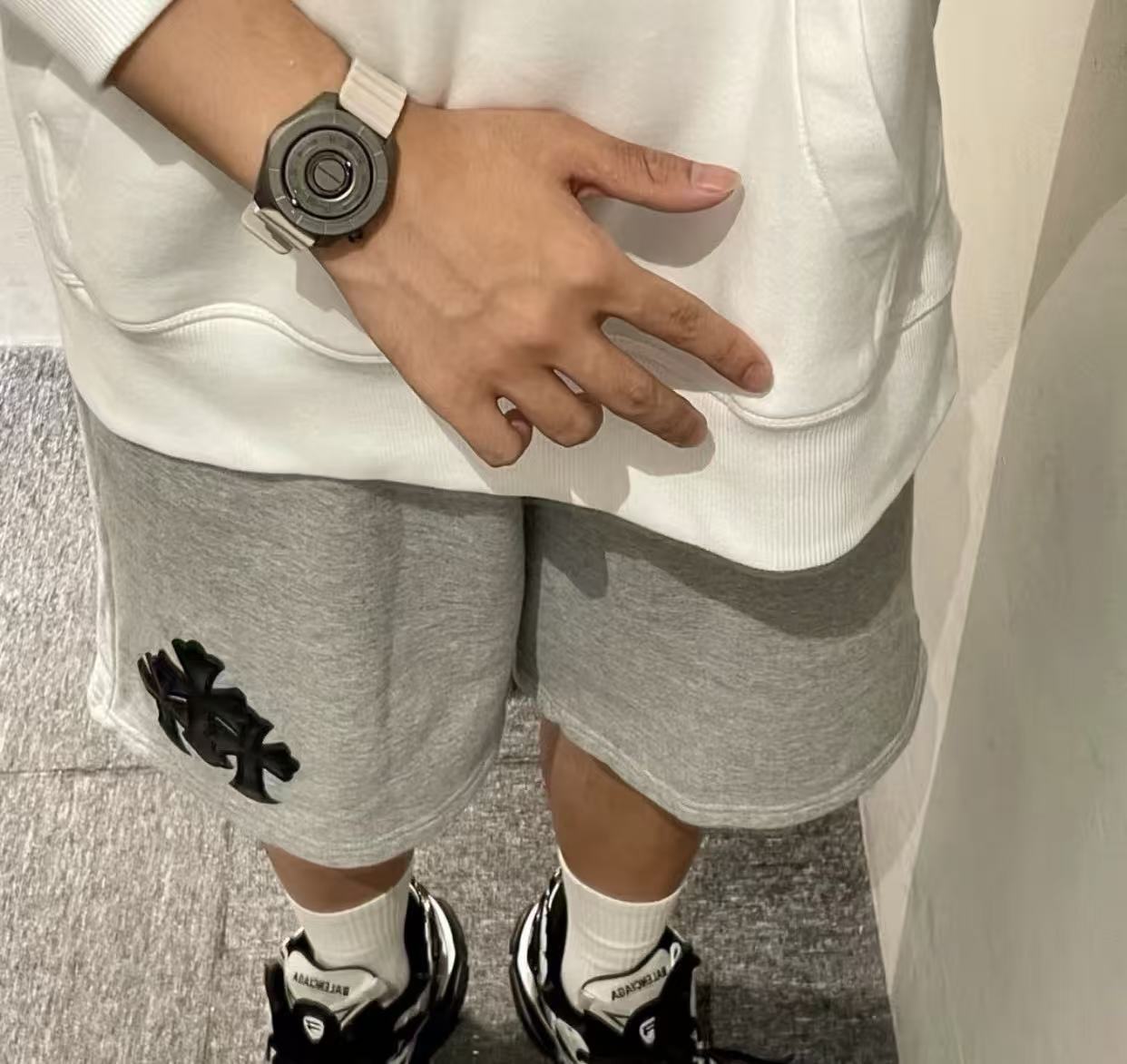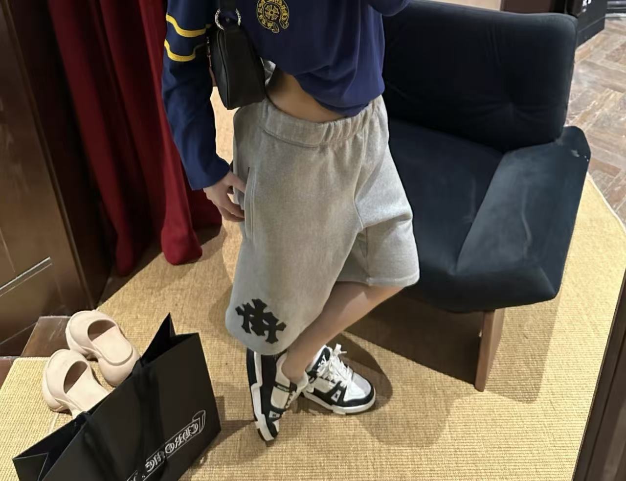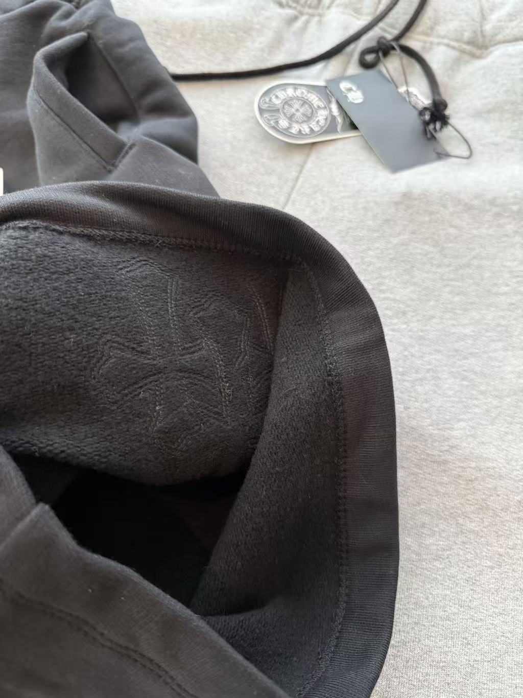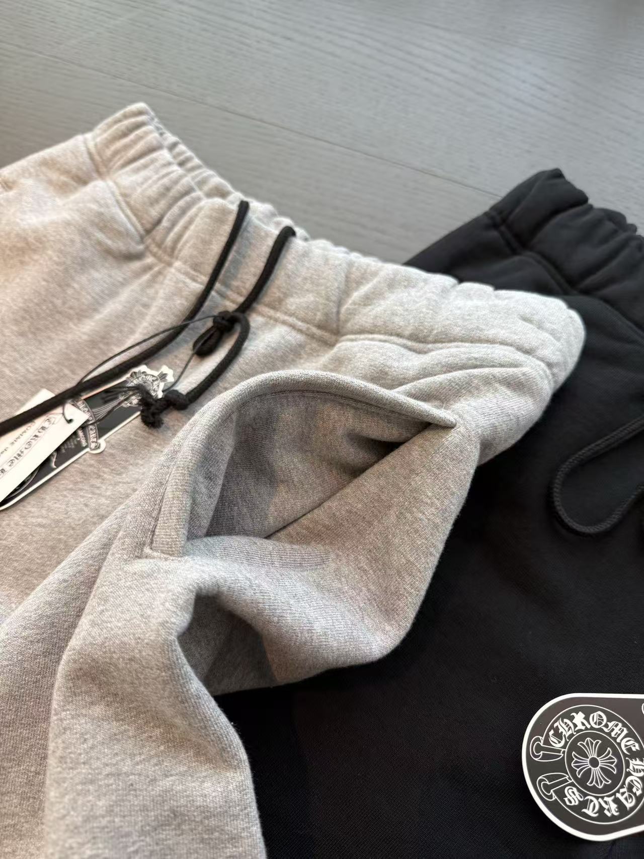 十字架符號始終是不可撼動的靈魂。這次分享的 三叉戟拼皮十字架毛圈抓絨衛褲,將品牌最核心的叛逆基因,透過極致的重磅材料與複雜的異形貼布技術重新詮釋。