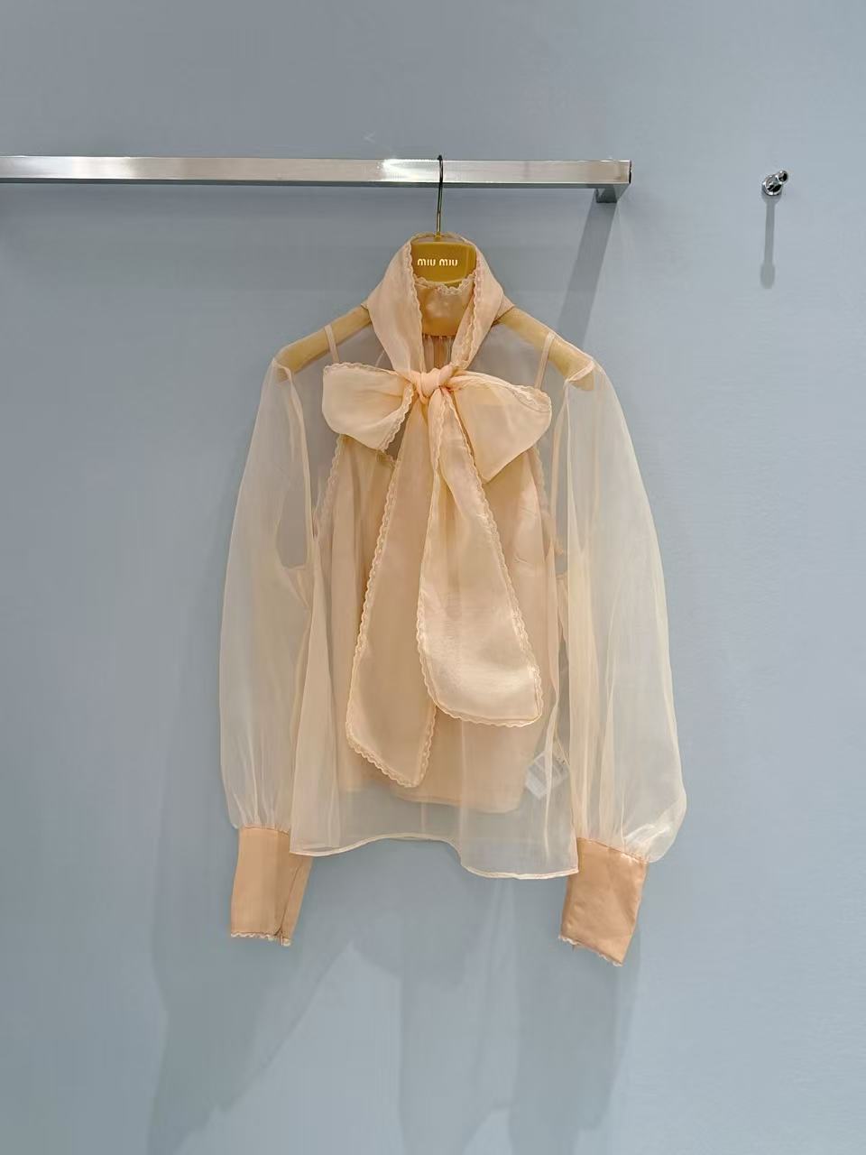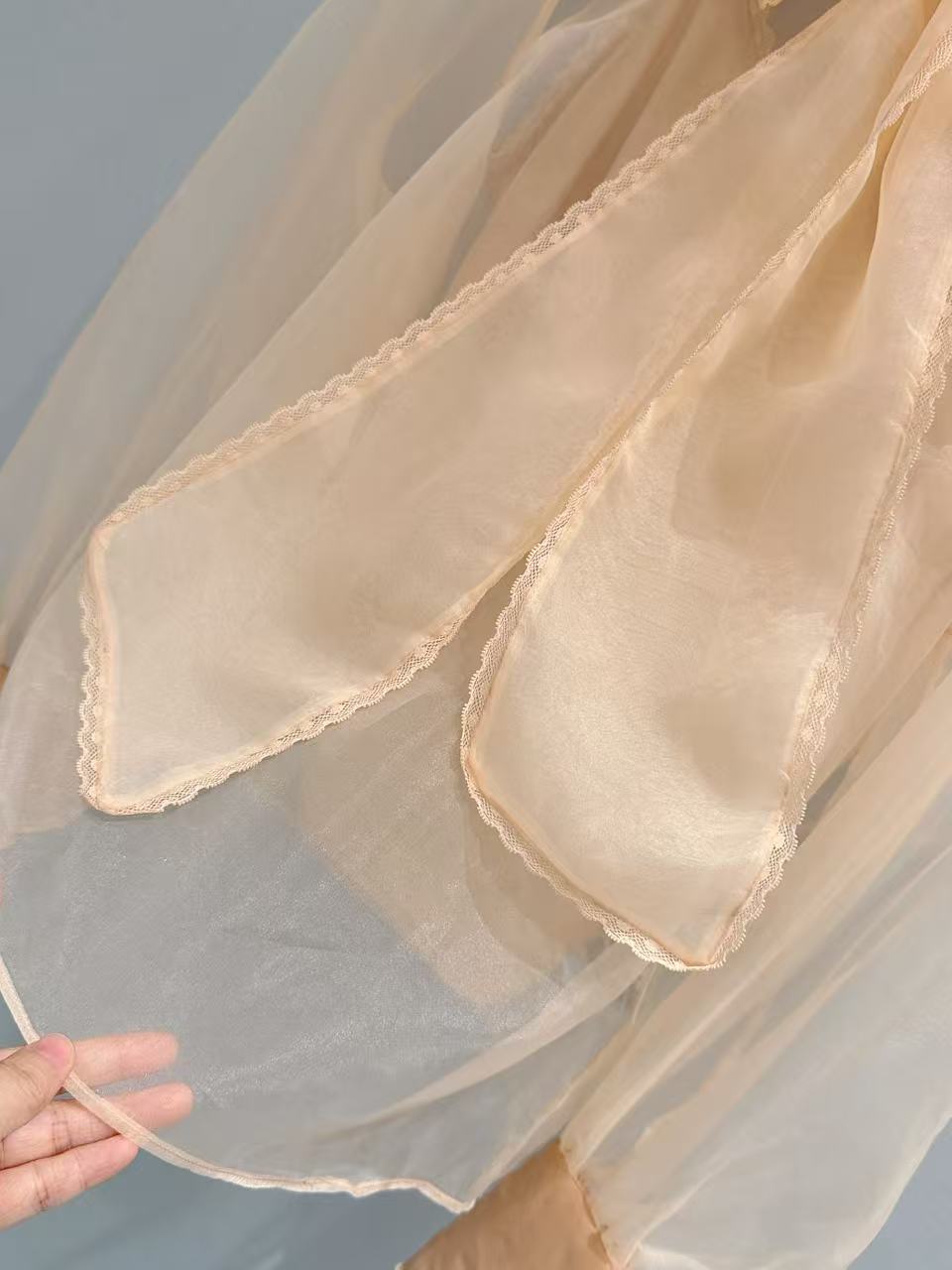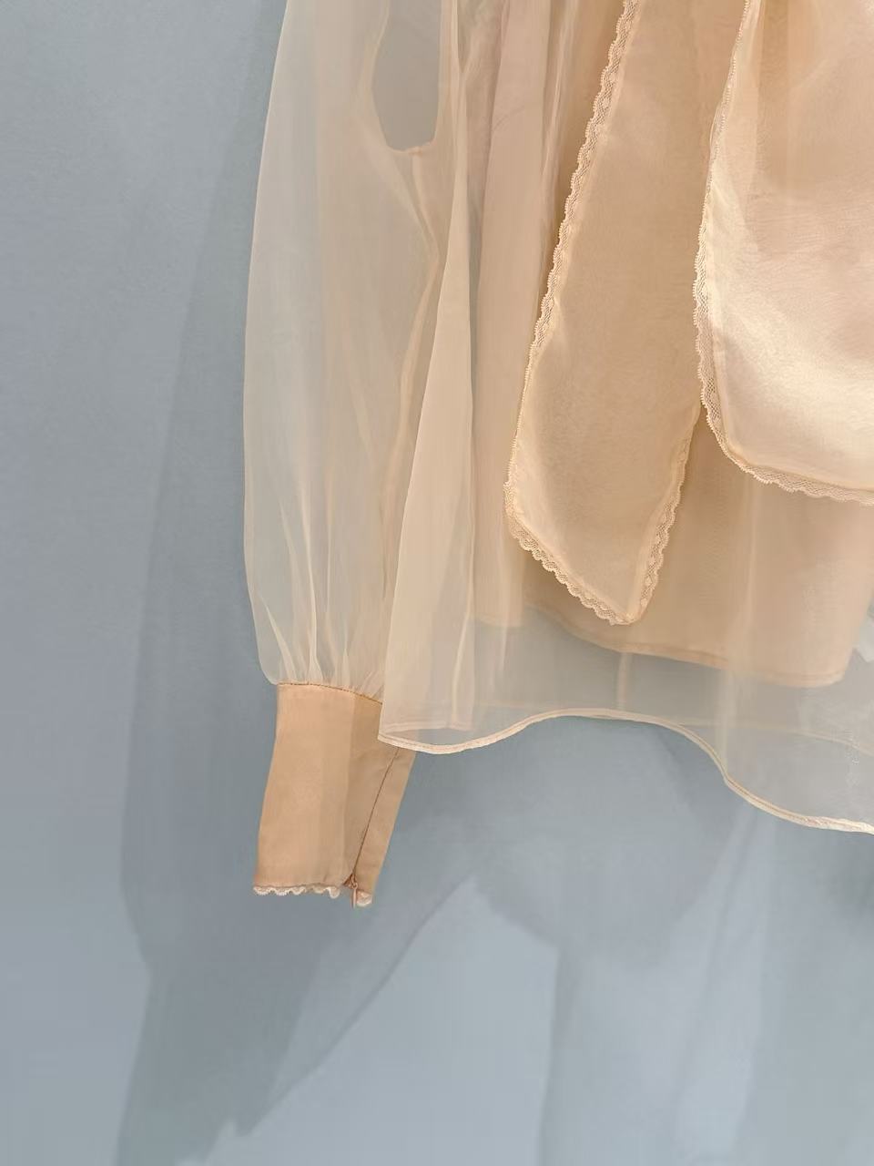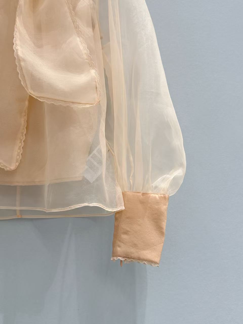 立體挺括版型: 歐根紗特有的支撐力,讓這款襯衫的宮廷袖與領口能維持漂亮的廓形,不會因為穿久或洗滌而軟塌無力。