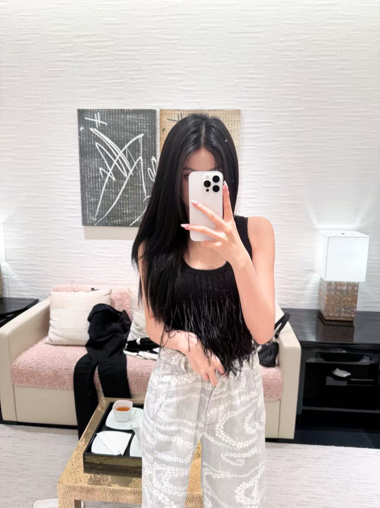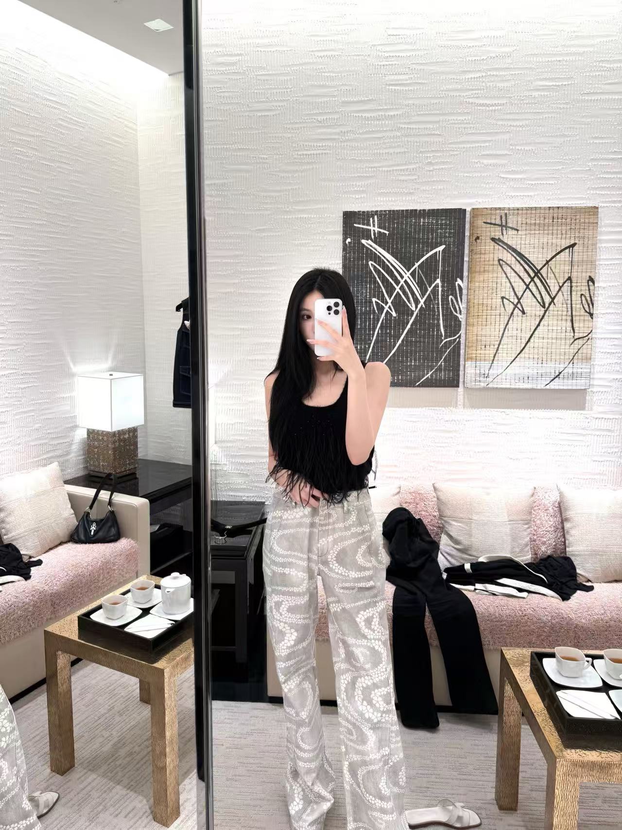 淺灰色丹寧布上鋪陳著流動的白色波浪印花,散發出一種如畫作般的優雅氣息。