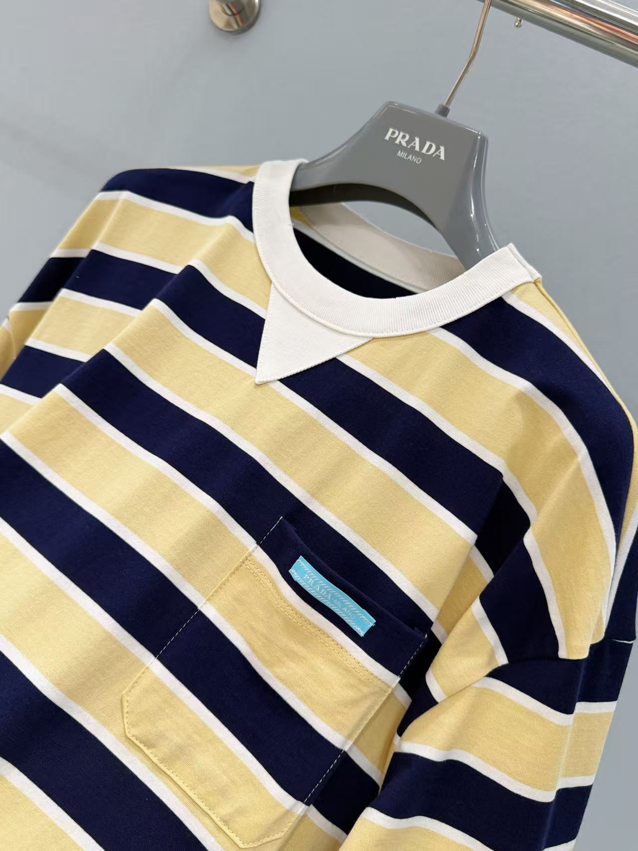 藍、黃、白三色交織的橫條紋設計,視覺上非常清爽且充滿活力。細節處更是亮點:左胸前設有精緻的小口袋,並點綴了標誌性的藍色品牌標籤,低調卻極具辨識度。