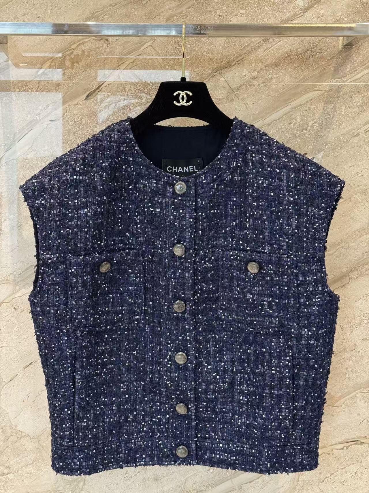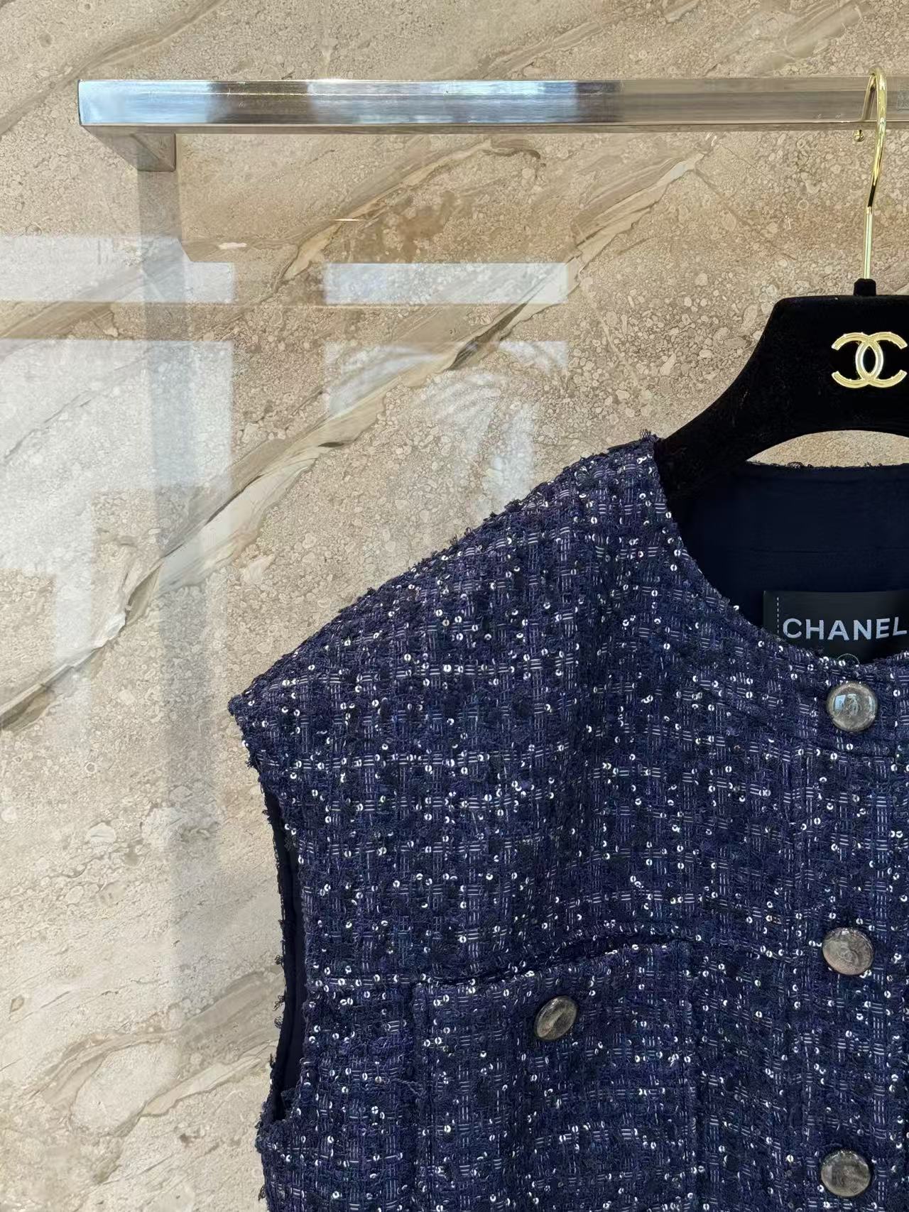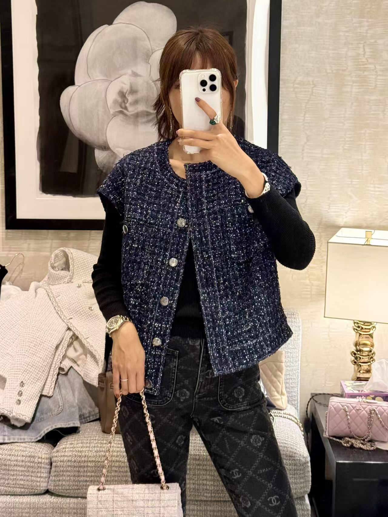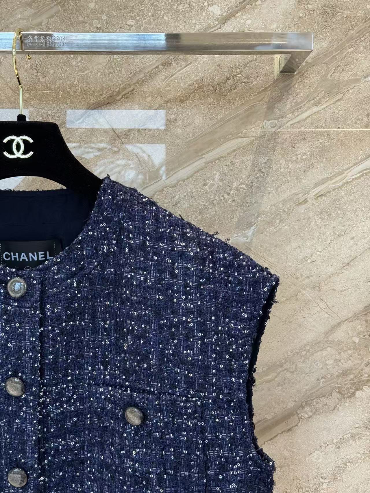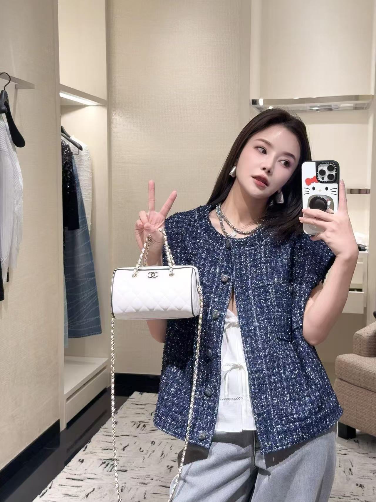 版型是經典圓領無袖廓形,前排一整列金屬logo鈕扣,低調中帶著滿滿的貴族氣息。