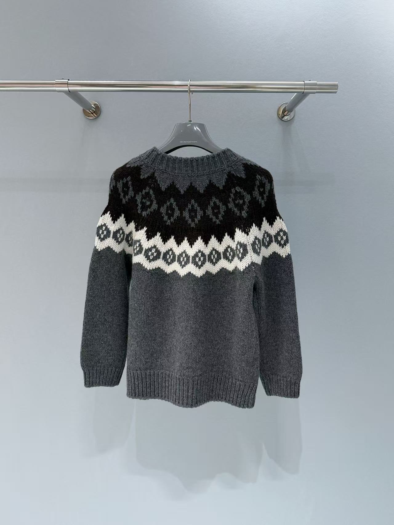 配色質感滿分: 以沉穩的深灰色為底,疊搭上棕色與白色的經典費爾島幾何花紋。這種北歐風的圖騰自帶一股高級又鬆弛的氛圍感,隨便一套都時髦!