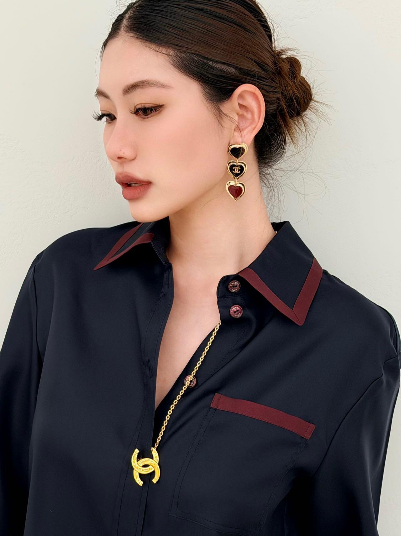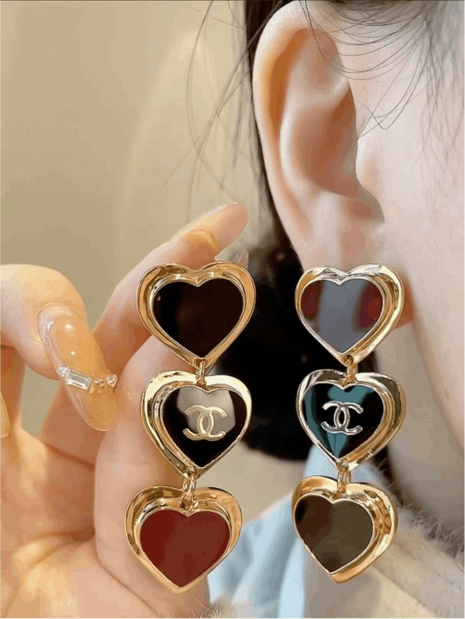 三顆愛心垂墜排列,比例拿捏得剛剛好,不會過於誇張,卻能自然修飾臉部線條,讓整體輪廓更顯精緻。