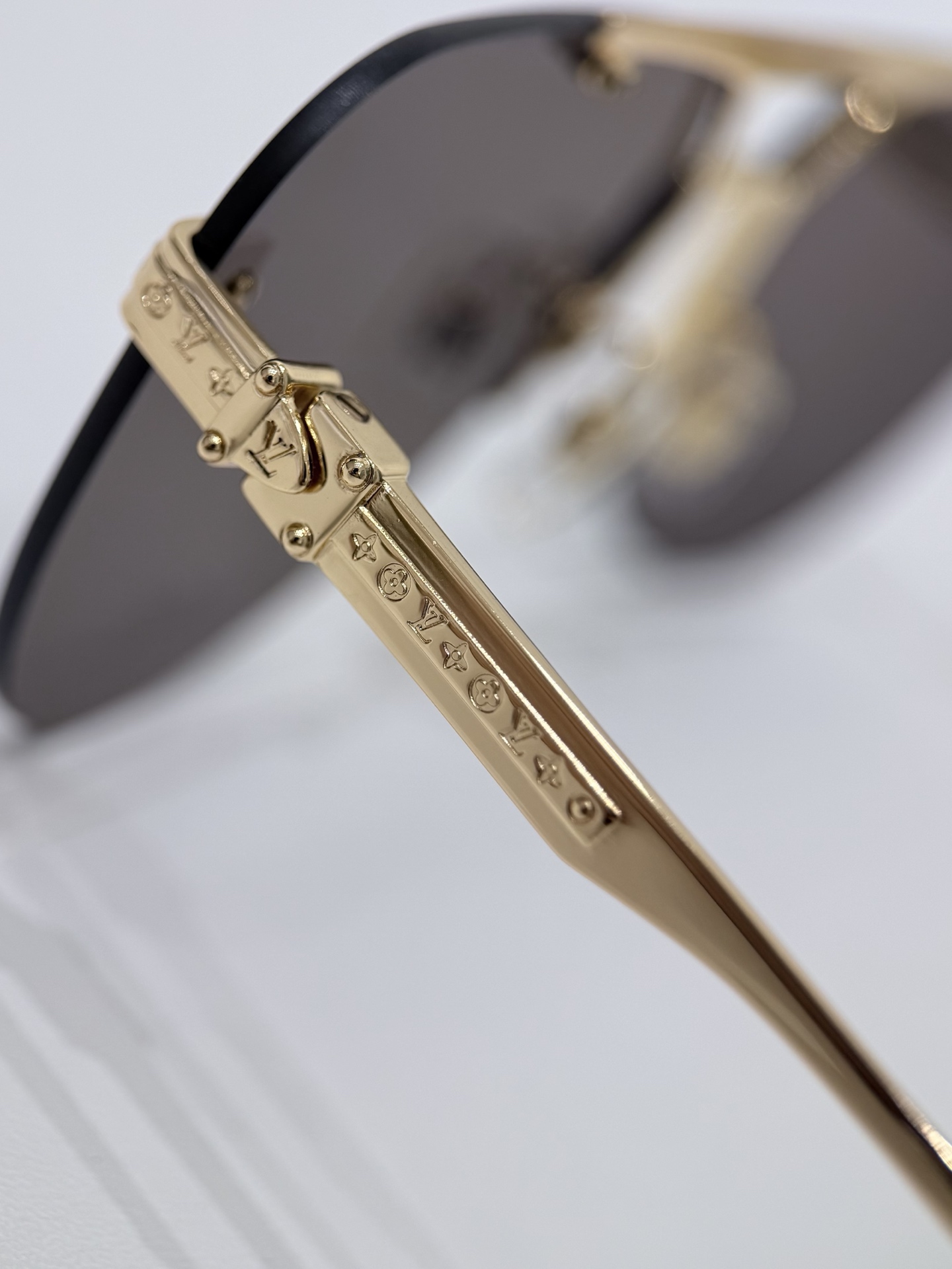 上橫梁、鏡腿與鏡腳末端皆刻有品牌經典字母標誌與細緻暗紋圖騰,在不經意的細節之中展現品牌獨有的奢華氣息。