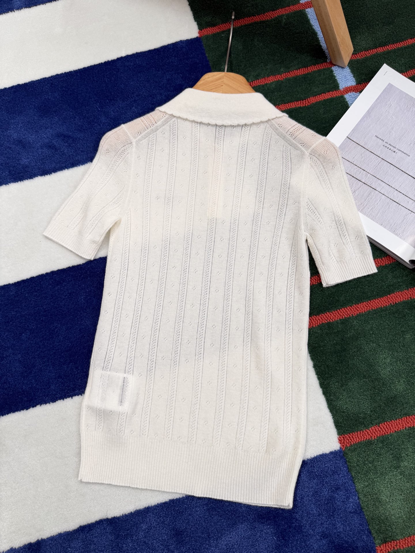 整件採用細緻鏤空針織工藝,織紋層次分明,視覺上輕盈又不單調,讓原本簡約的 POLO 版型多了一份時髦感。