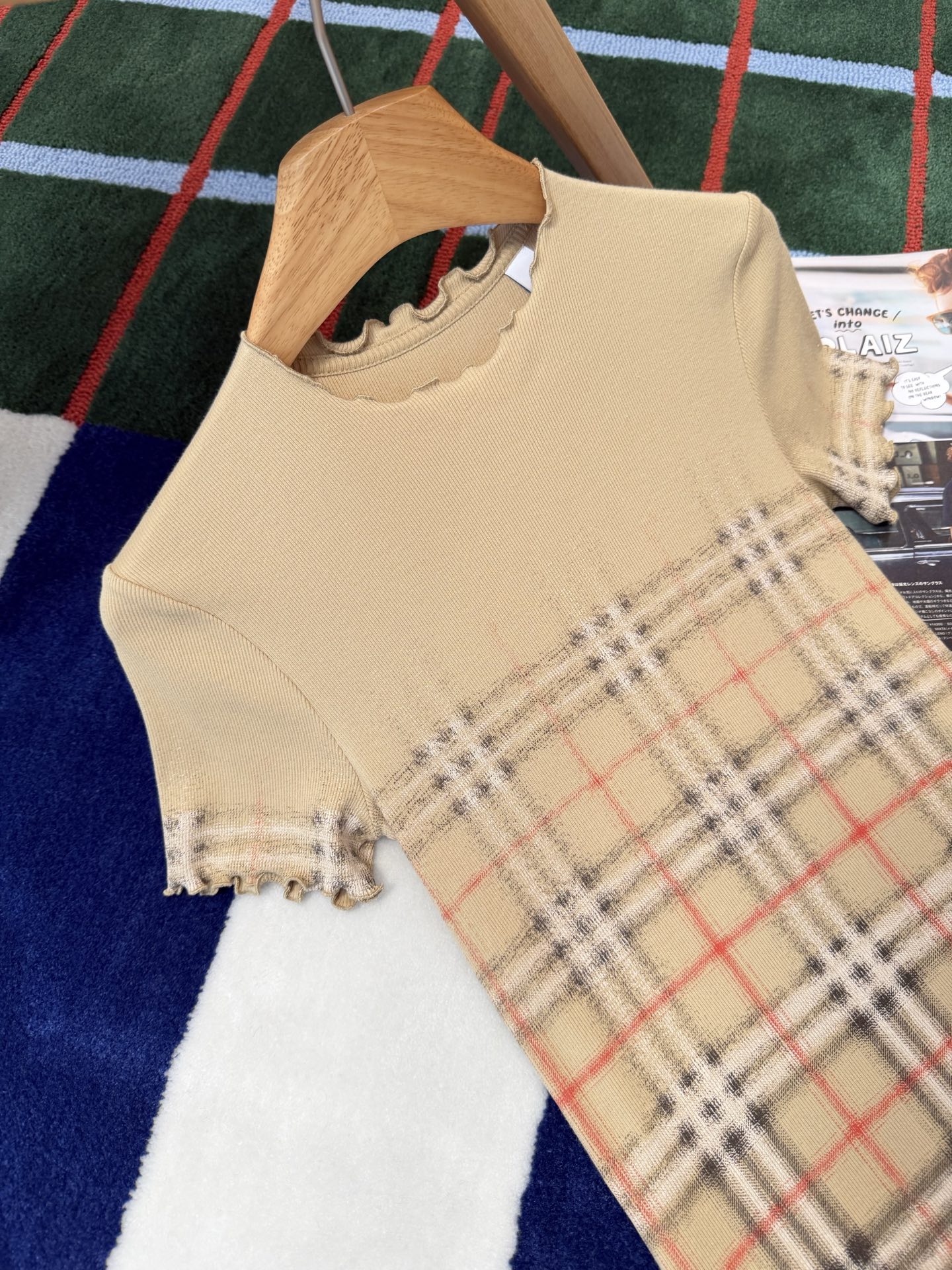 領口採用羅紋設計,細節處加入荷葉邊收邊,柔化了格紋原本偏中性的印象,讓整體風格多了一點精緻感與設計巧思。