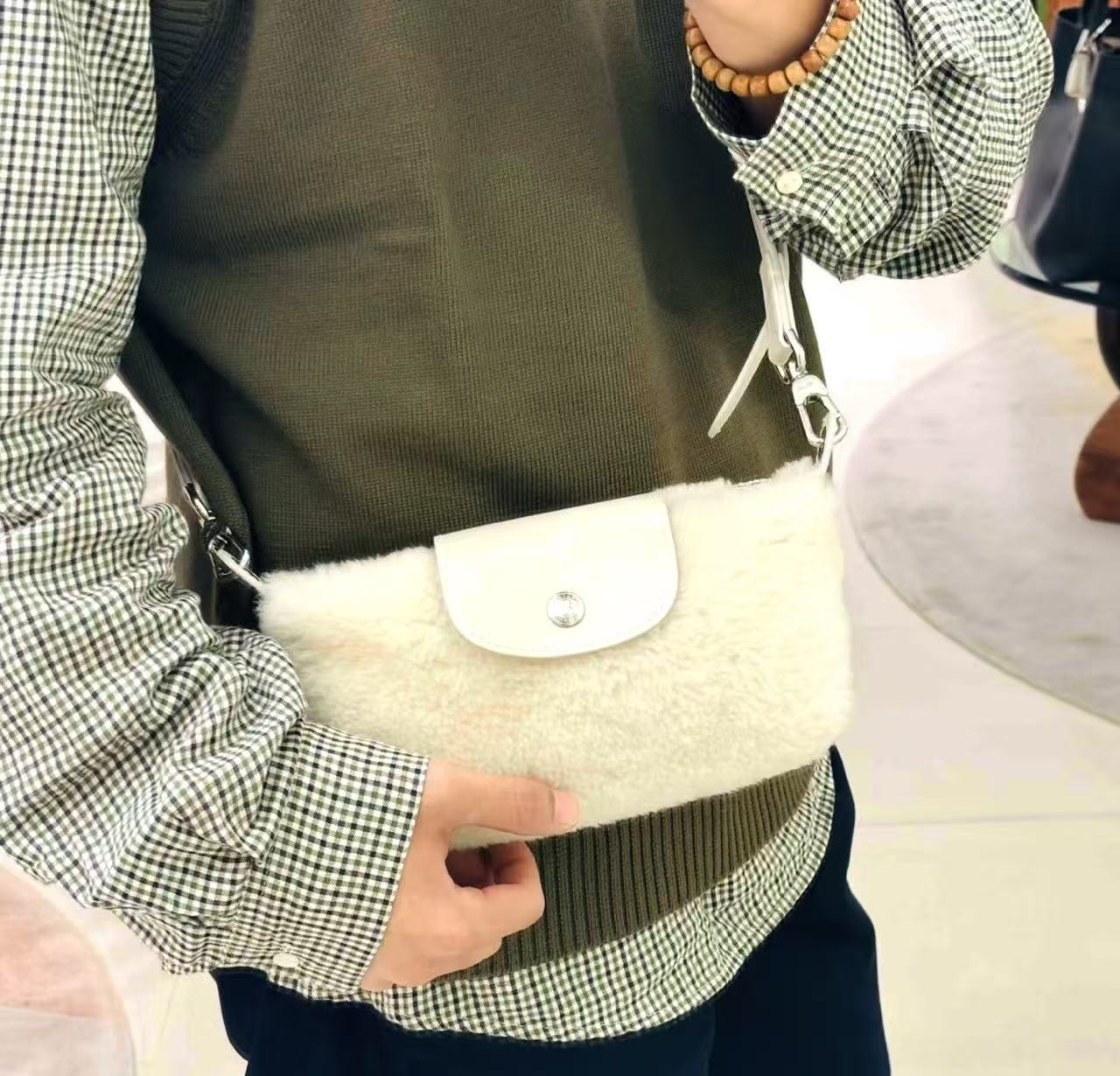 Mini 餃子包完美結合了時尚外觀和實用機能:羊羔毛萌感外觀: 包身覆蓋著柔軟的羊羔毛,充滿了秋冬的溫暖氛圍,一揹上身吸睛度滿分!