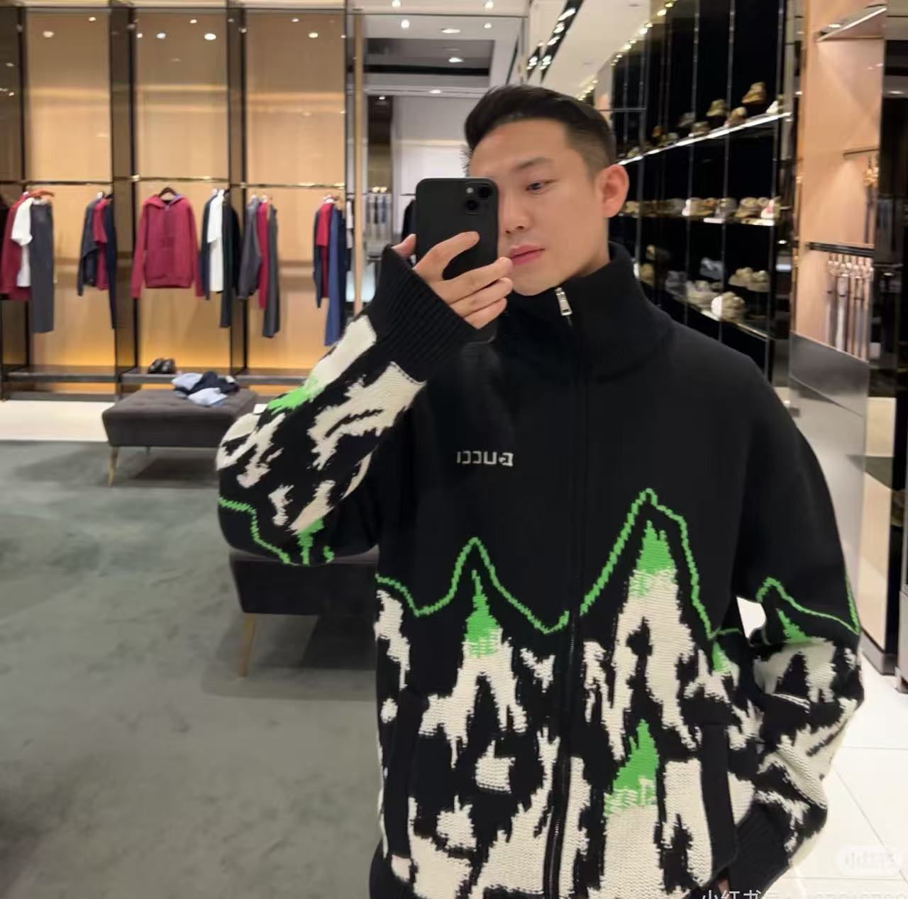 這款外套以細膩的拼色嵌花工藝呈現出一幅生動的山景圖騰,並巧妙融入品牌字母元素,打破了傳統針織衫的單一框架。