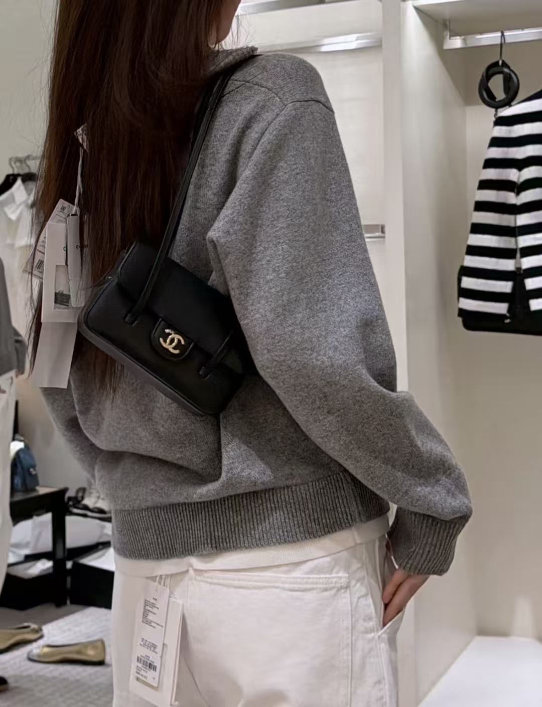 最時髦的穿法就是在裡面疊穿一件白邊內搭,領口處露出的一抹白,能瞬間點亮整體的層次感,讓灰色不再單調。