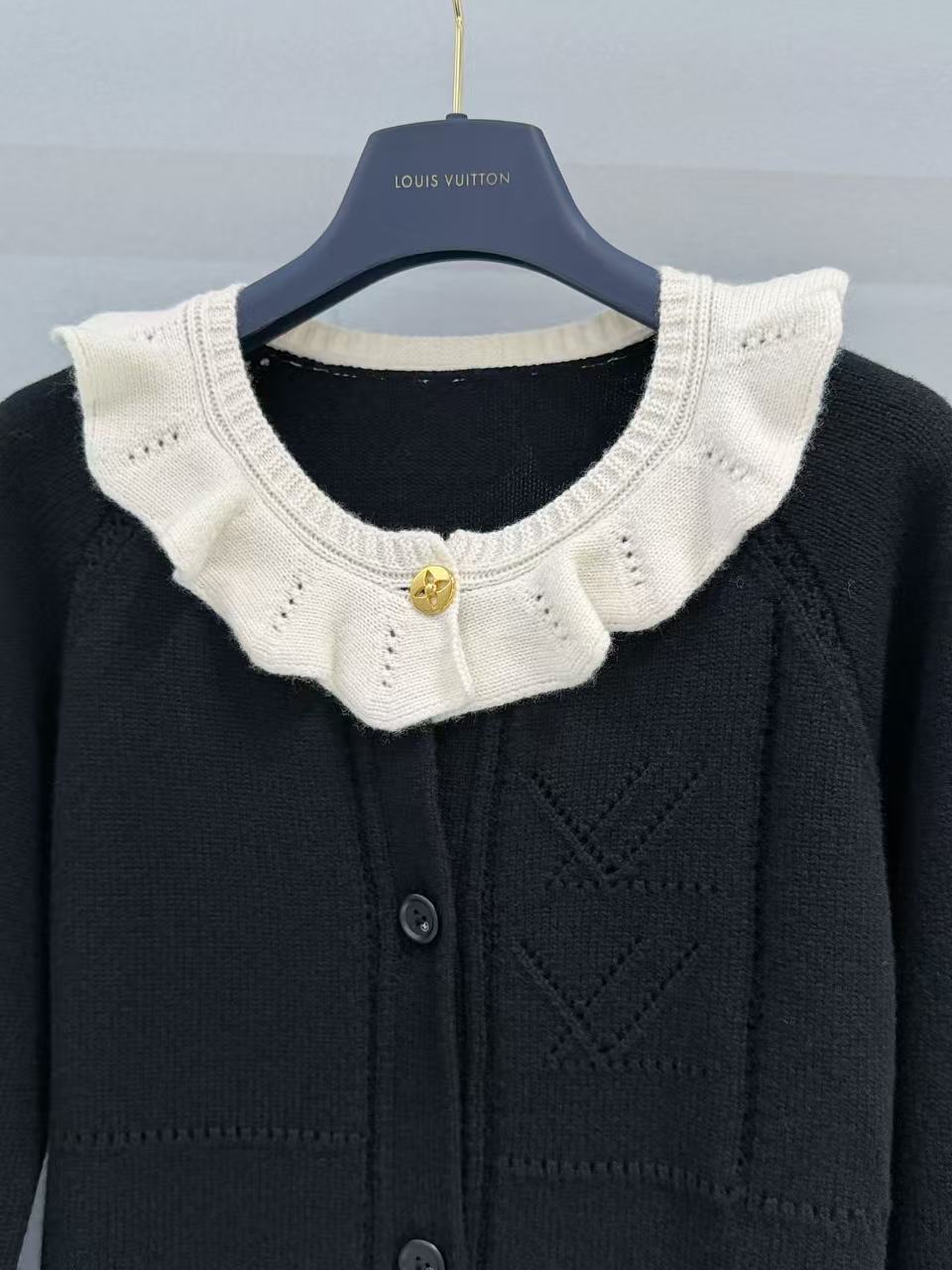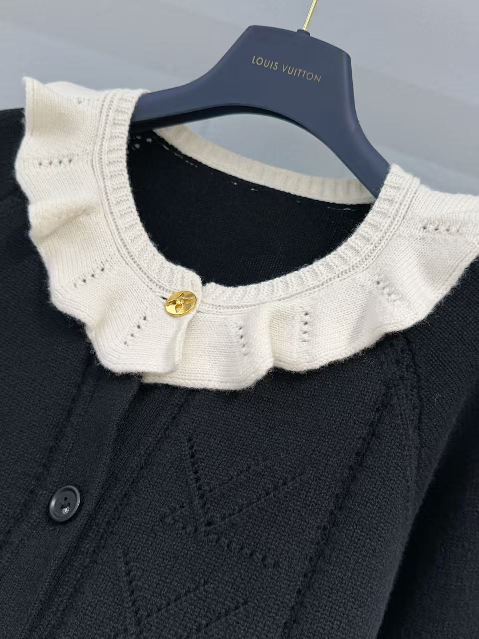 領口那圈奶白色的針織荷葉邊真的太美了,軟綿綿的褶皺帶來滿滿松弛感,再搭配金色 Monogram 紐扣,甜度剛好,不會過頭,瞬間提升整件衣服的精緻度。