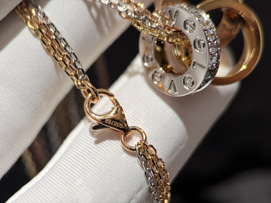 這條項鍊真的屬於那種一戴上就會被注意到的經典款。靈感來自LOVE 系列,將玫瑰金、白金、黃金三種色調巧妙融合,低調卻非常有存在感,是越看越耐看的設計。