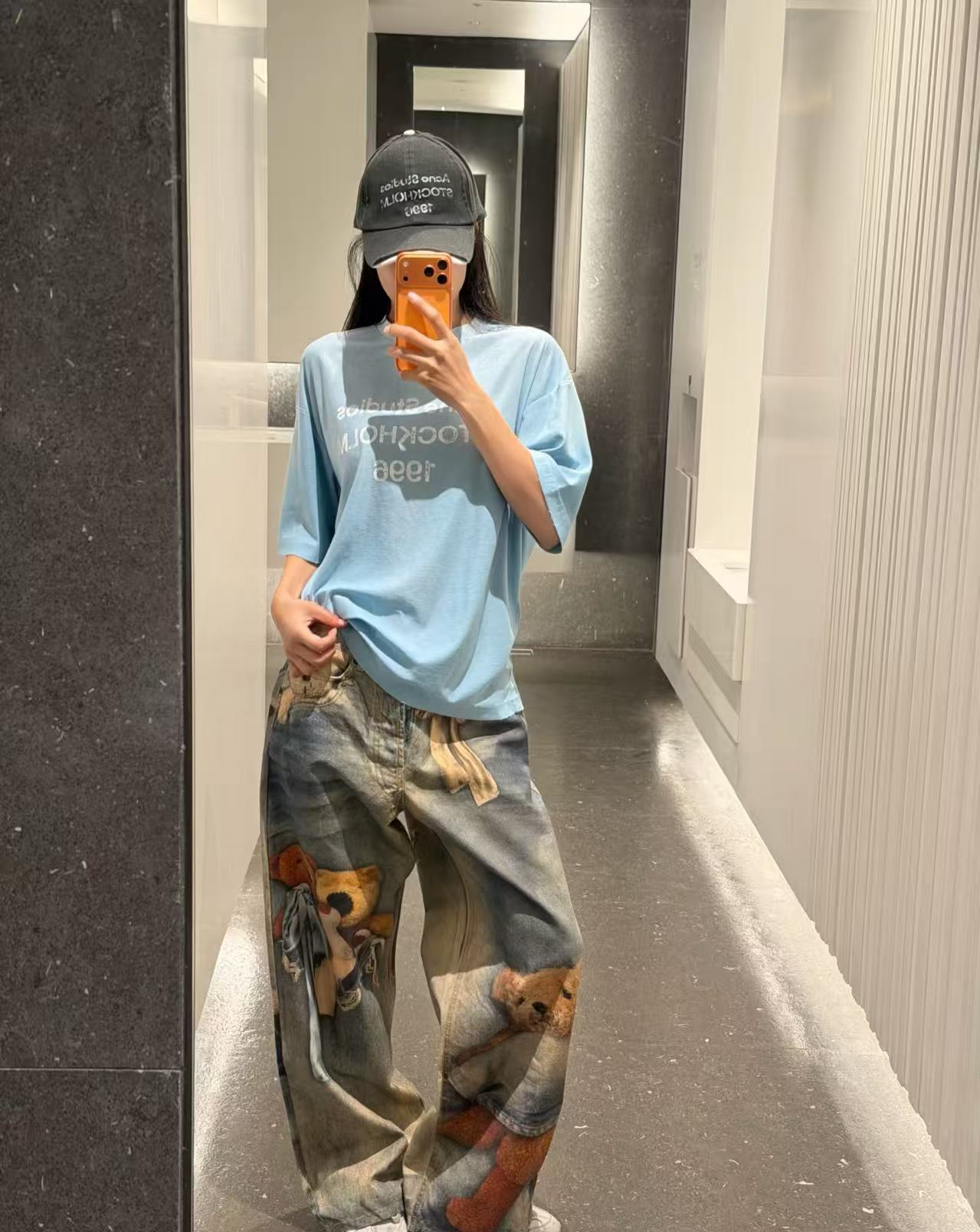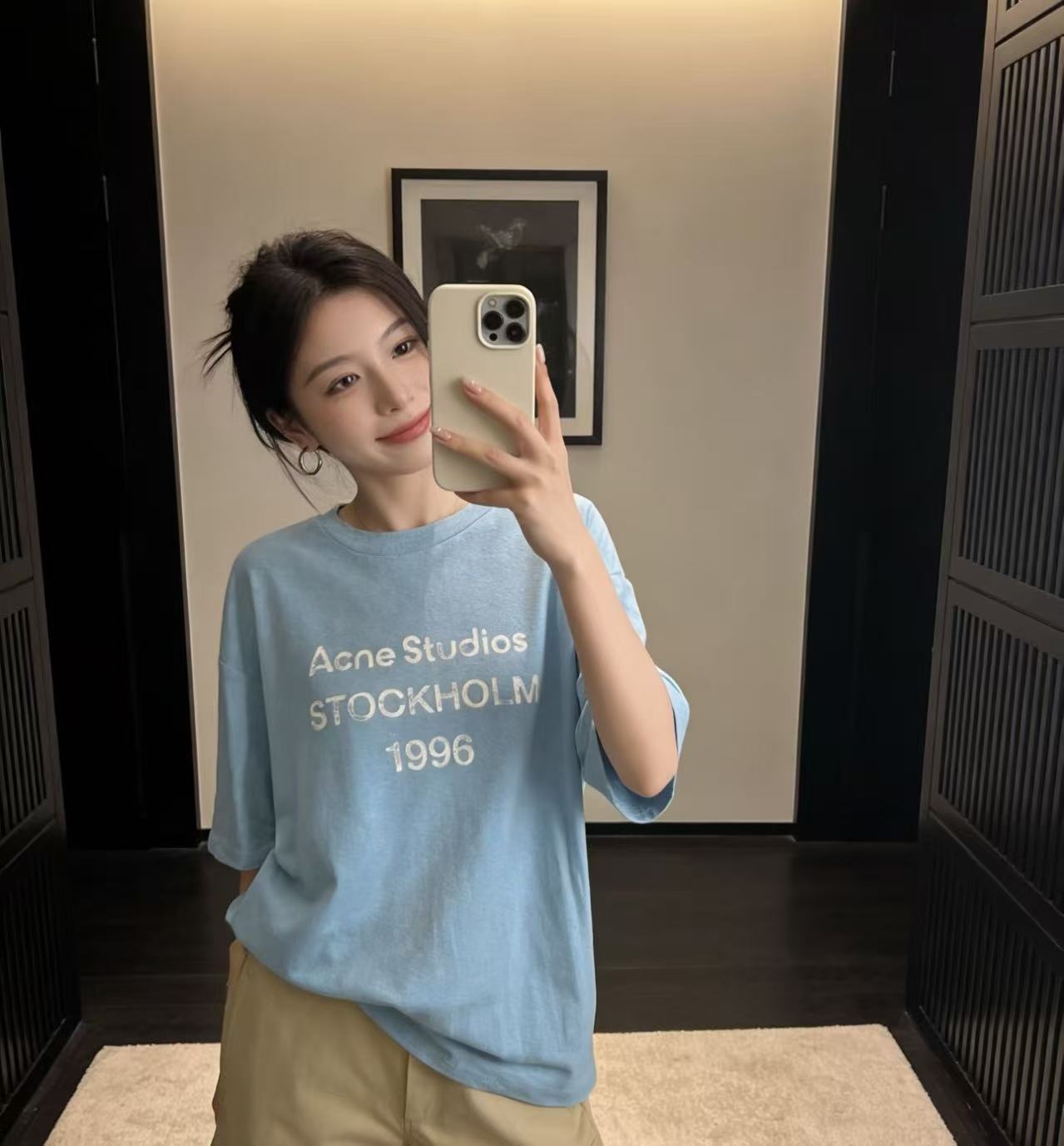除了單穿,這件輕薄的短 T 也非常適合疊搭在妳那件 Hermès 深靛藍牛仔夾克 裡面,露出胸口的 Stockholm 1996 字母細節,增加整體的視覺豐富度。
