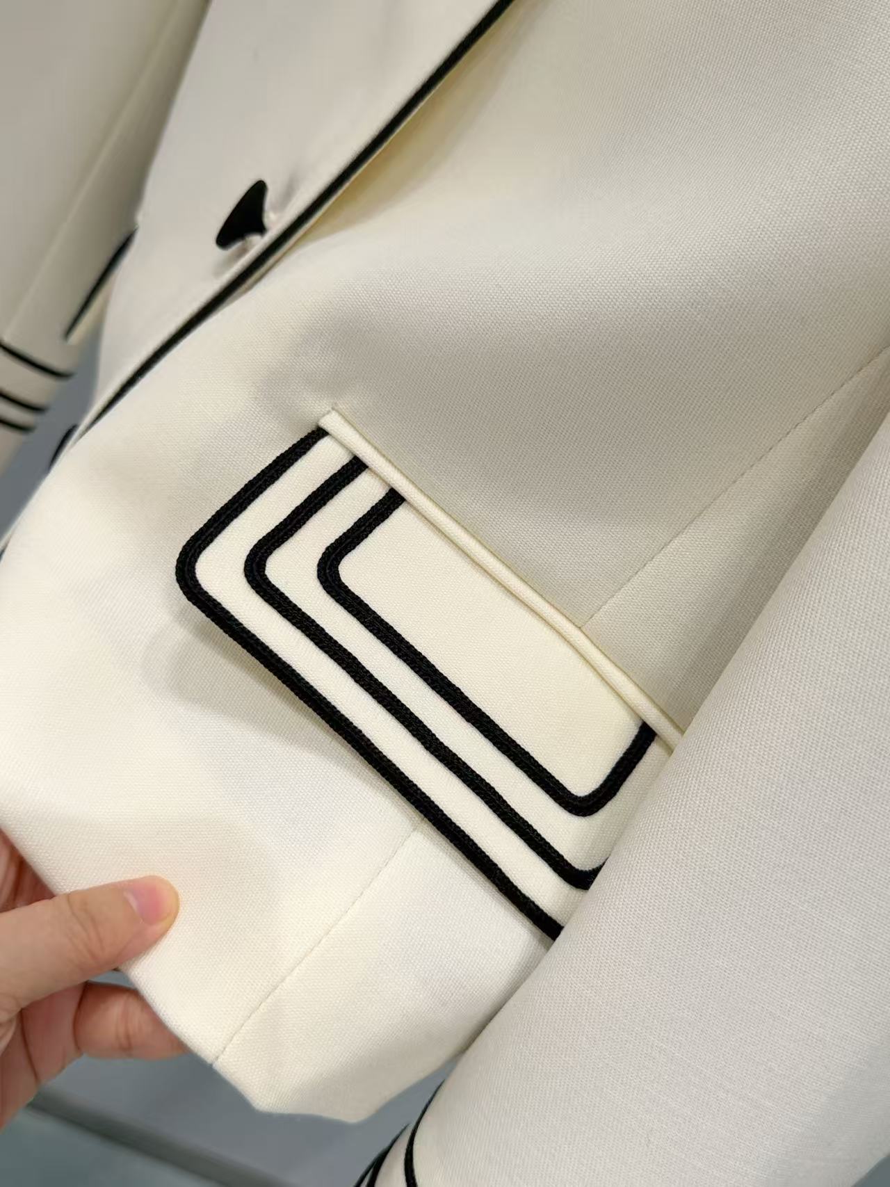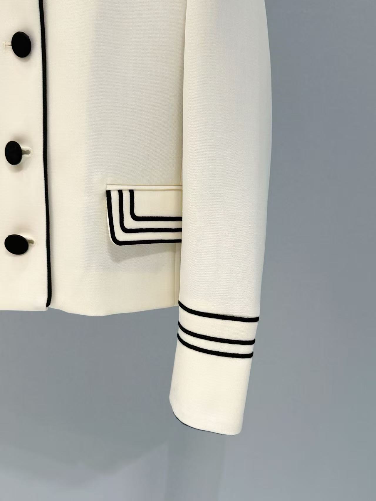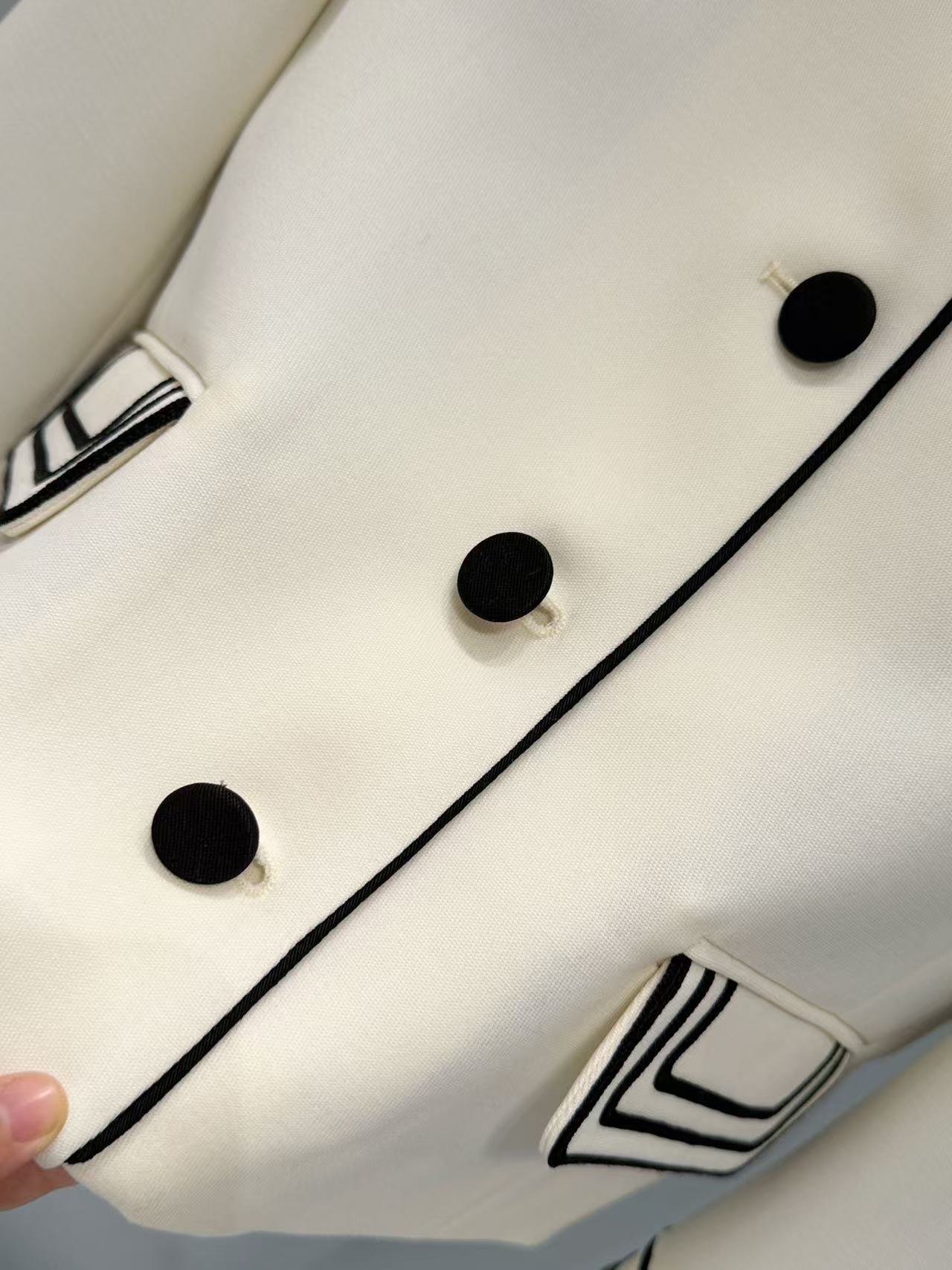 翻領採用經典海军領設計,立體貼合頸部線條,箭頭造型口袋與撞色織帶細節增添復古韻味,黑色雙排扣圓潤精緻,整體黑白配色簡約又有型,無論單穿或內搭都超級有氣場,姐妹們出門絕對是全場焦點!