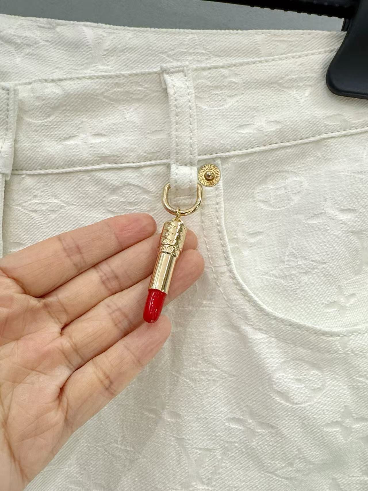 經典老花壓花圖案融入定制牛仔提花材質,搭配精緻小口紅吊墜裝飾,細節處盡顯品牌匠心。