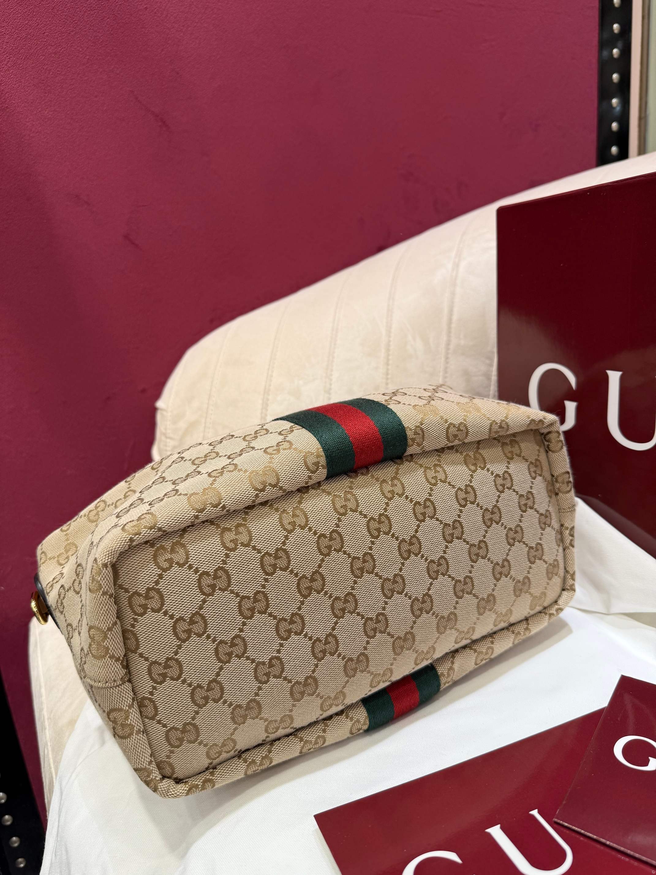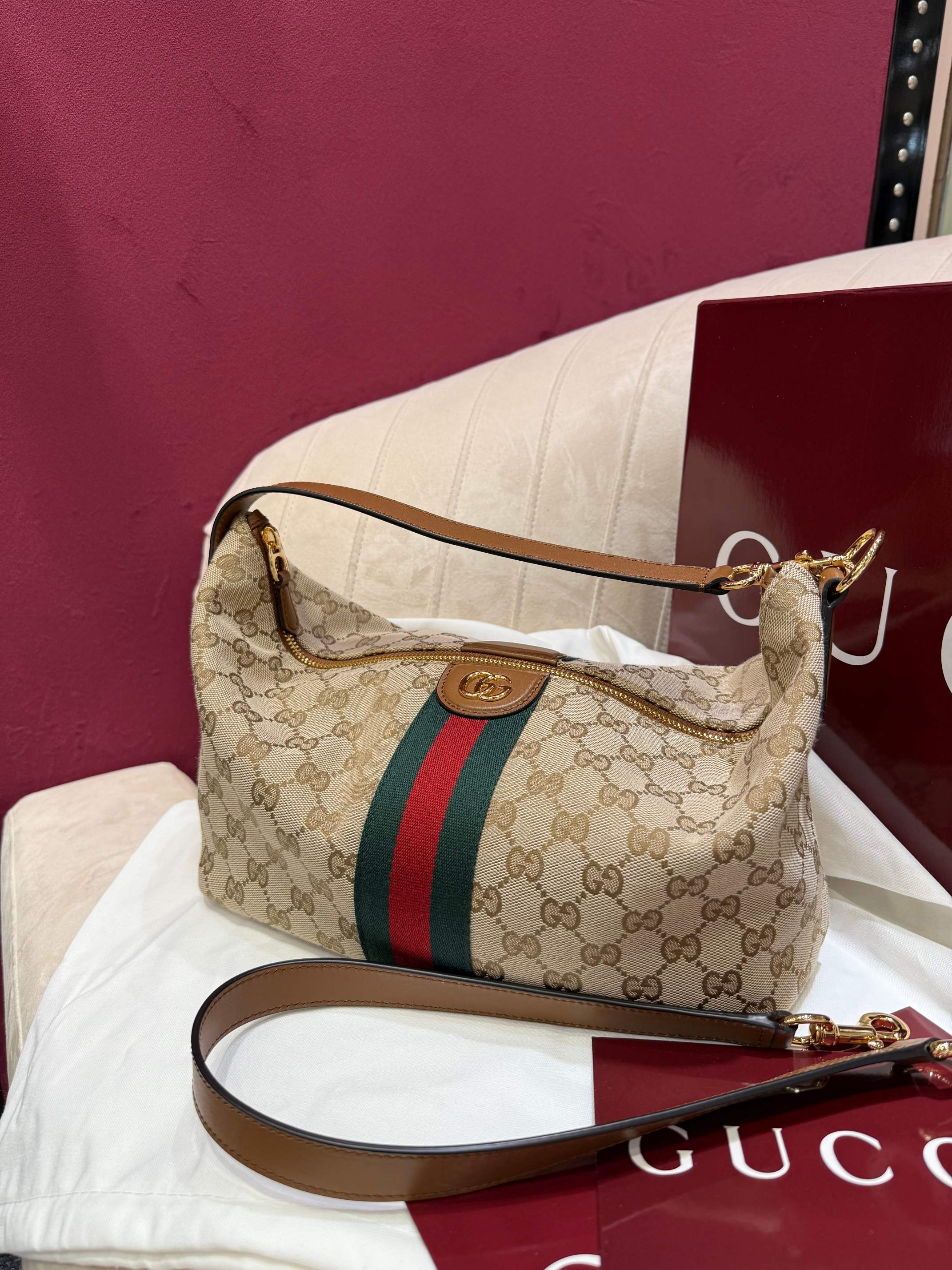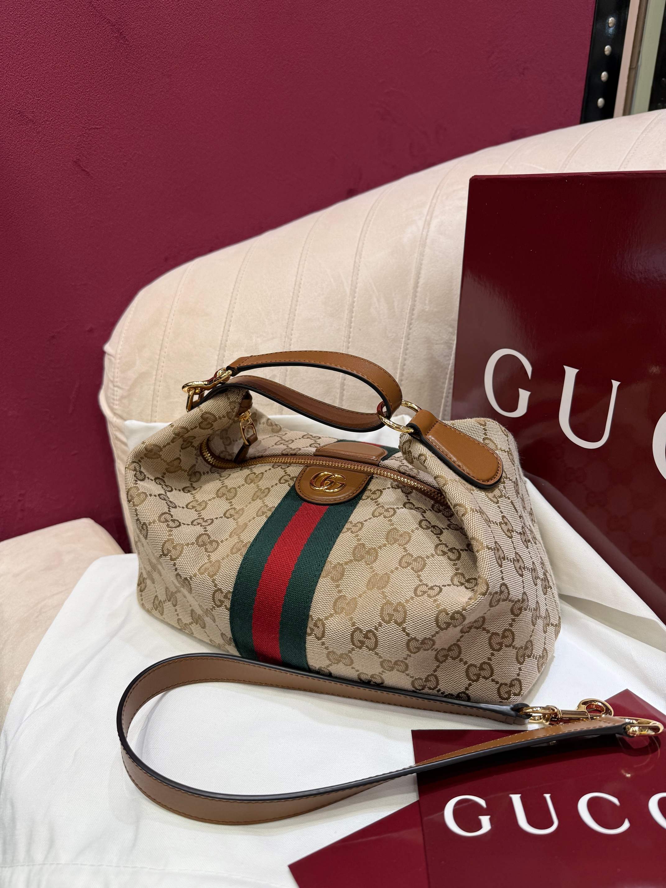 經典米色與棕色 GG 帆布搭配棕色皮革滾邊,整體視覺溫潤耐看,完全不挑季節、不挑穿搭。