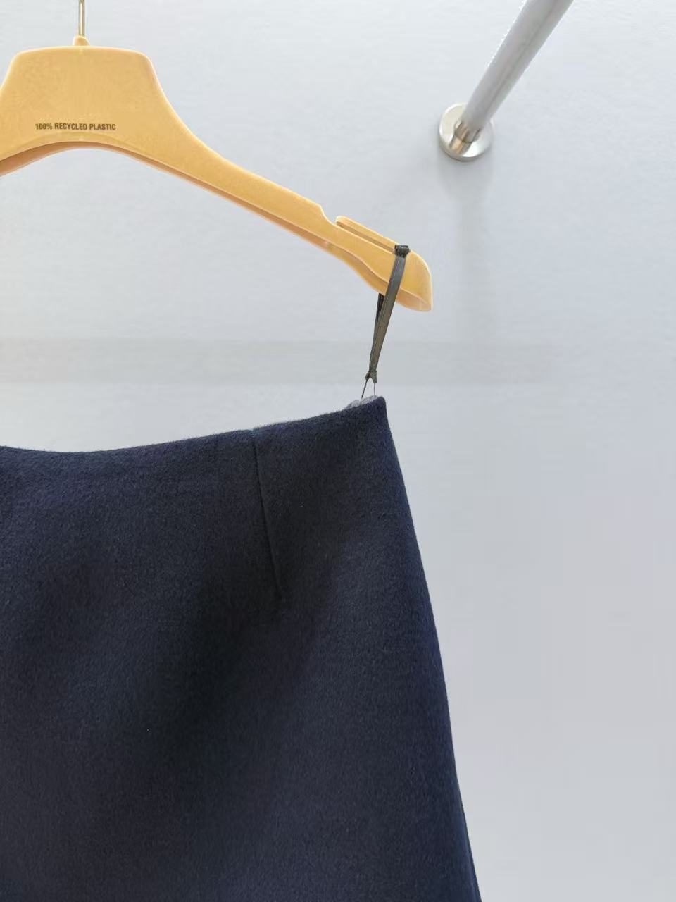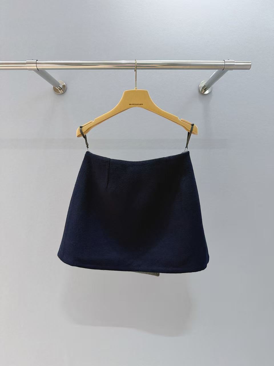 一面高级灰調羊毛呢,一面深邃藏青質感材質,同材質雙色調,一裙解鎖兩種風格。
