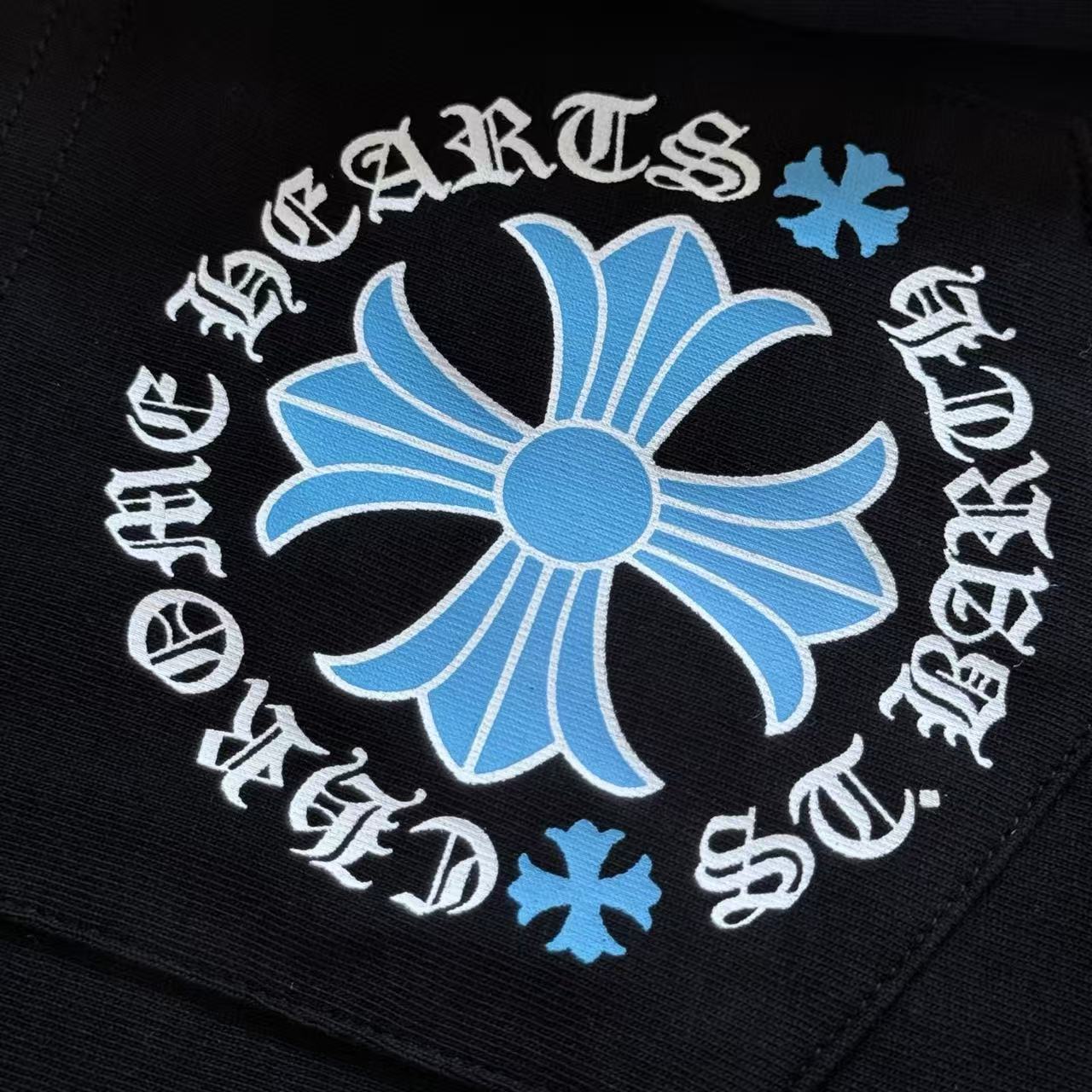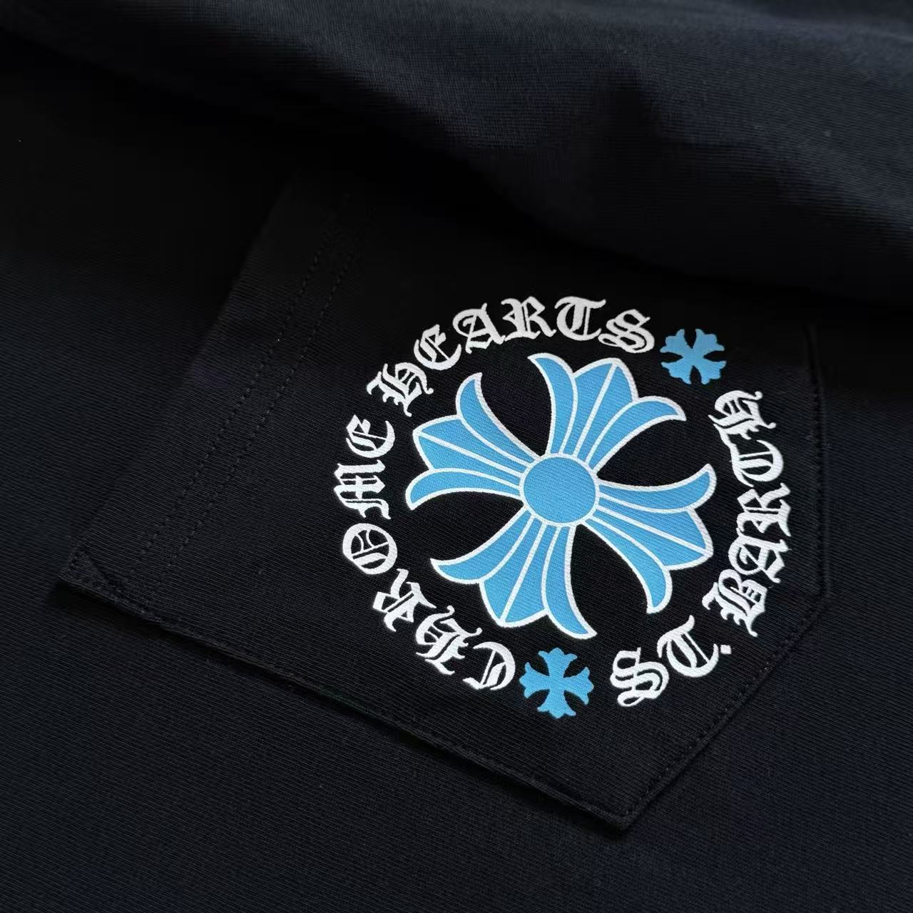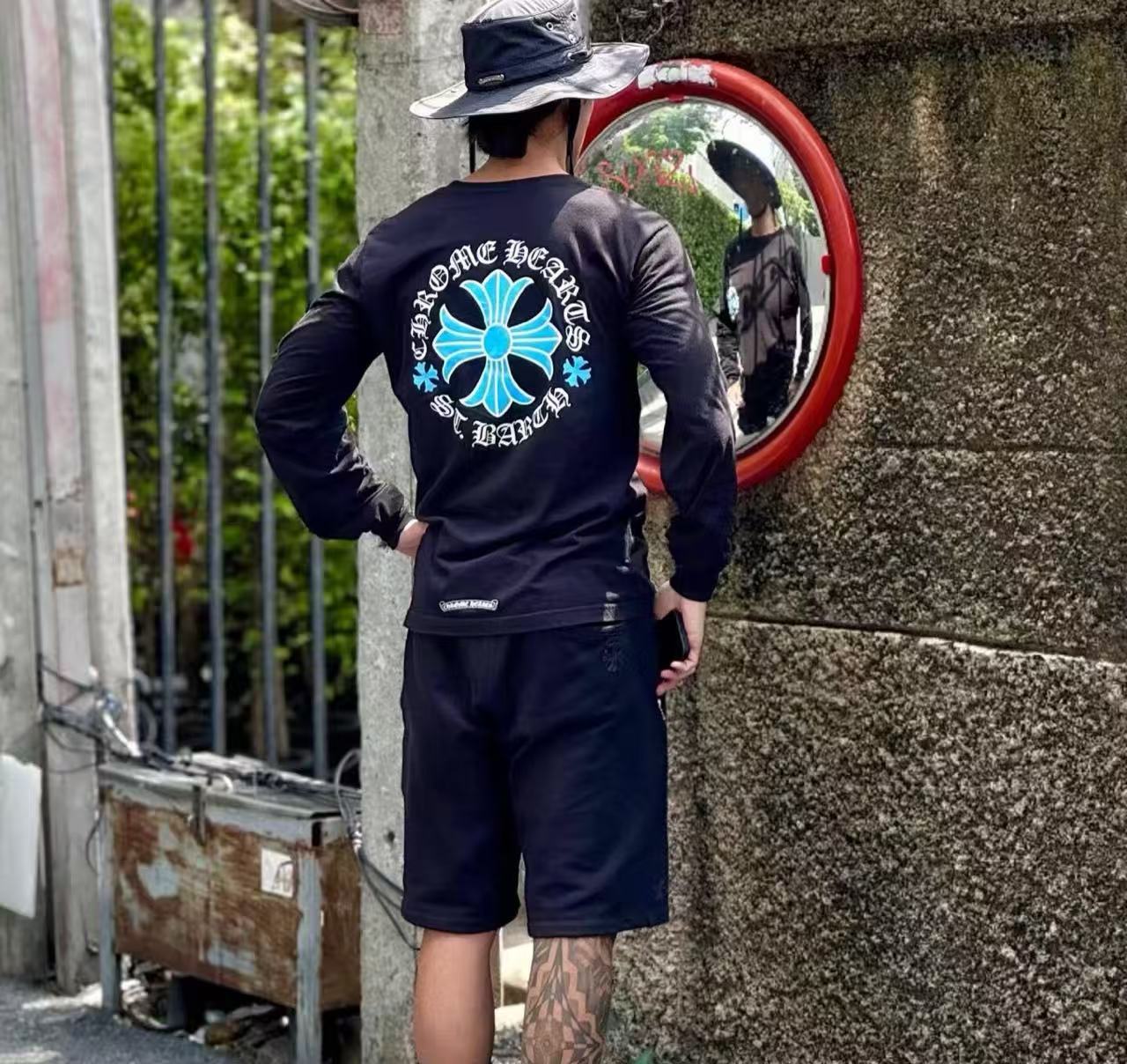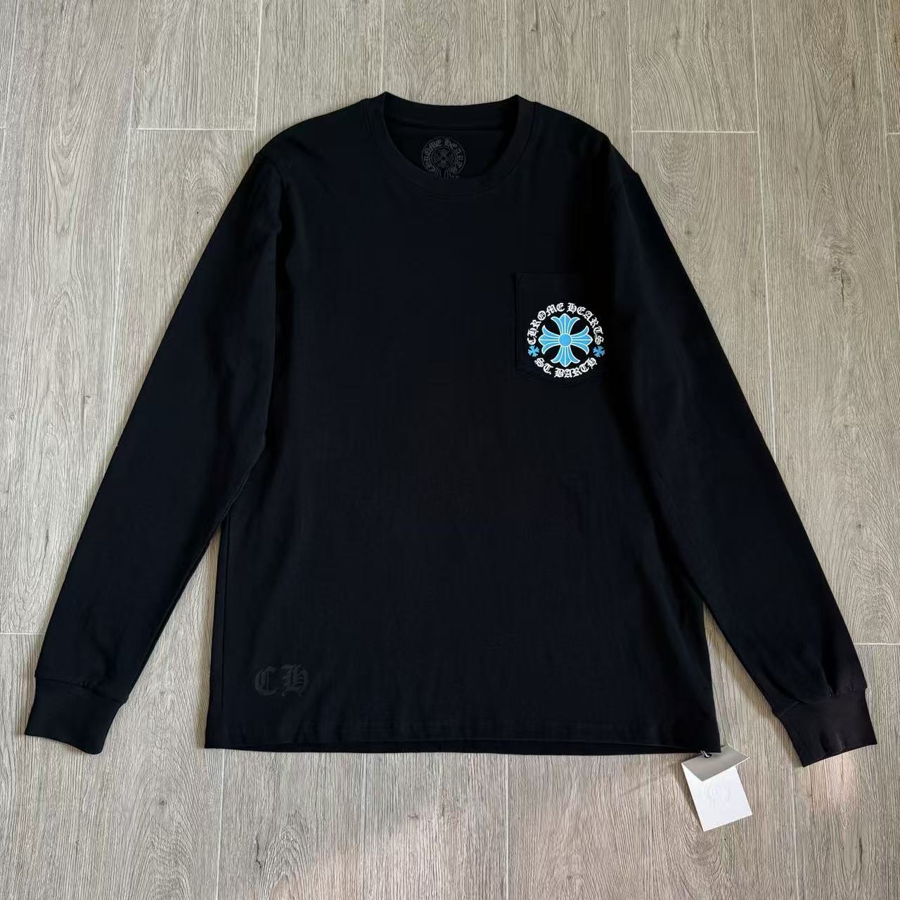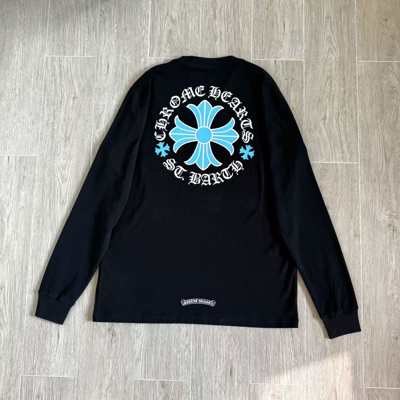這次分享的是來自加勒比海度假勝地的 St. Barth 聖巴托島限定款。不同於經典款的黑白配色,這款長袖 T 恤背後採用了極具度假氛圍的湛藍色十字花,在純黑的底色襯托下,散發出一種前衛且深邃的視覺衝擊感。