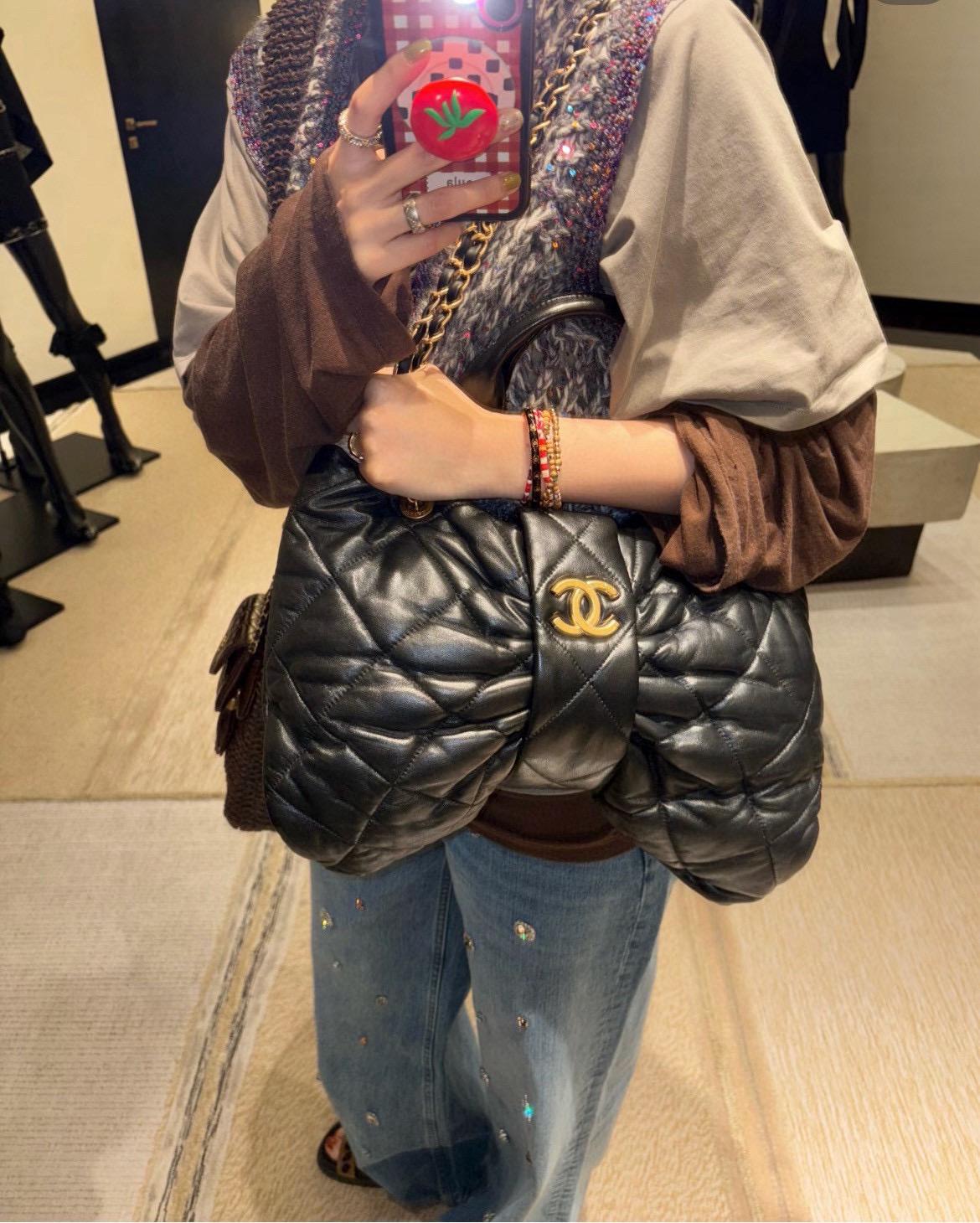 包身延續經典的菱格紋結構,視覺上立體又柔和,搭配金屬雙 C 扣細節,讓整體多了一份精緻與辨識度。