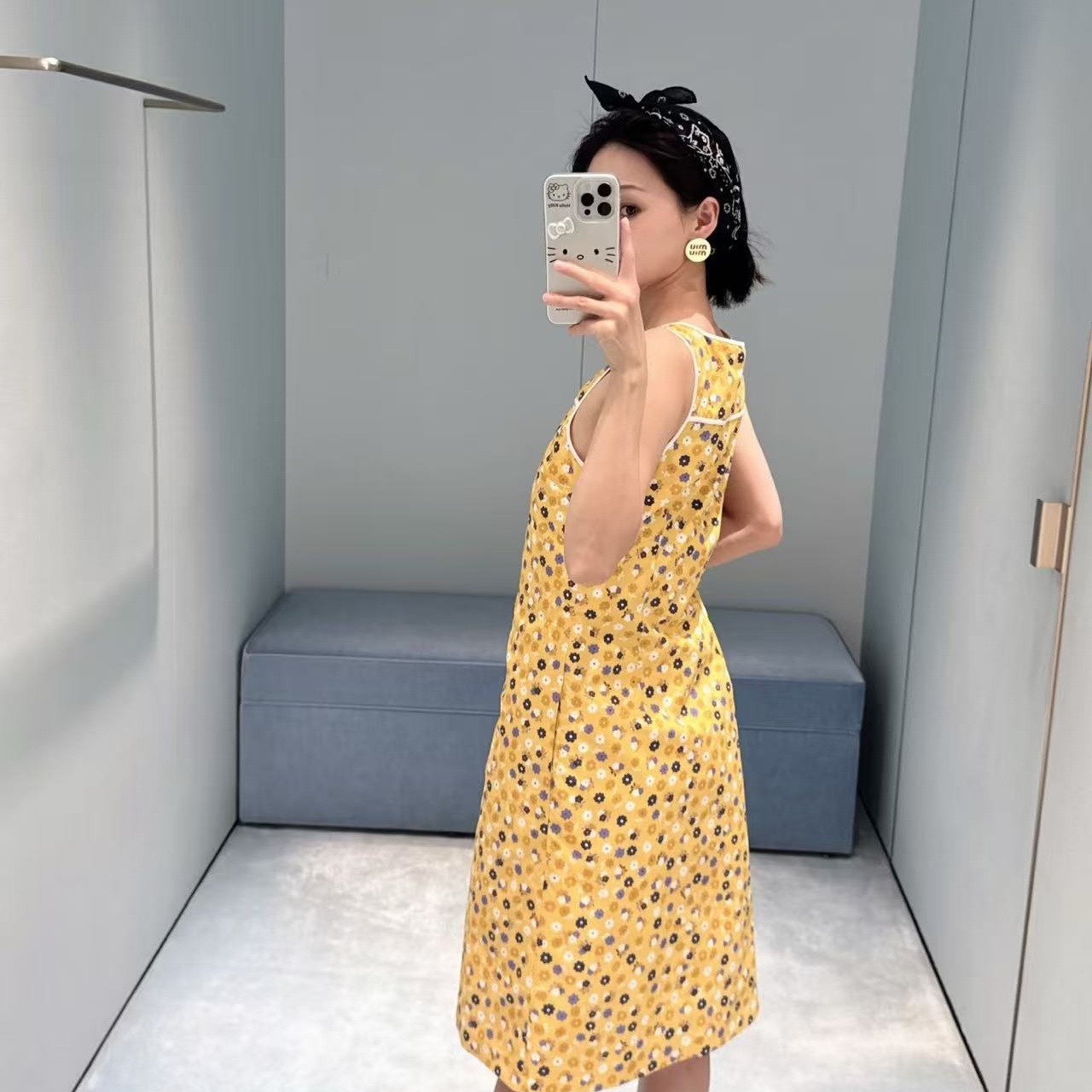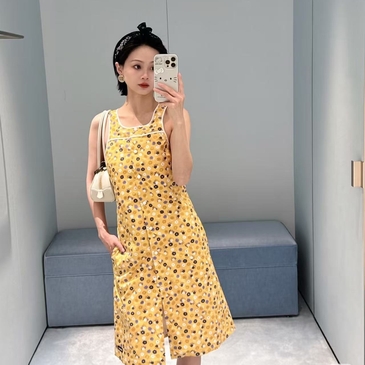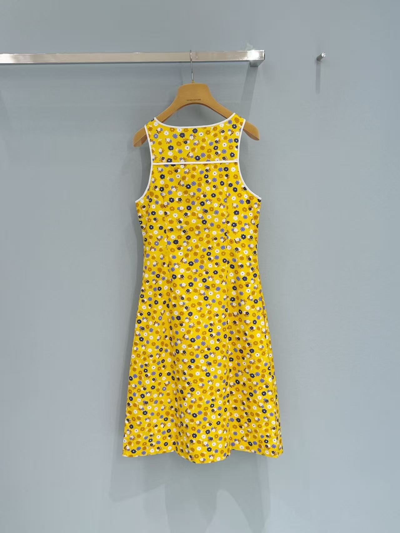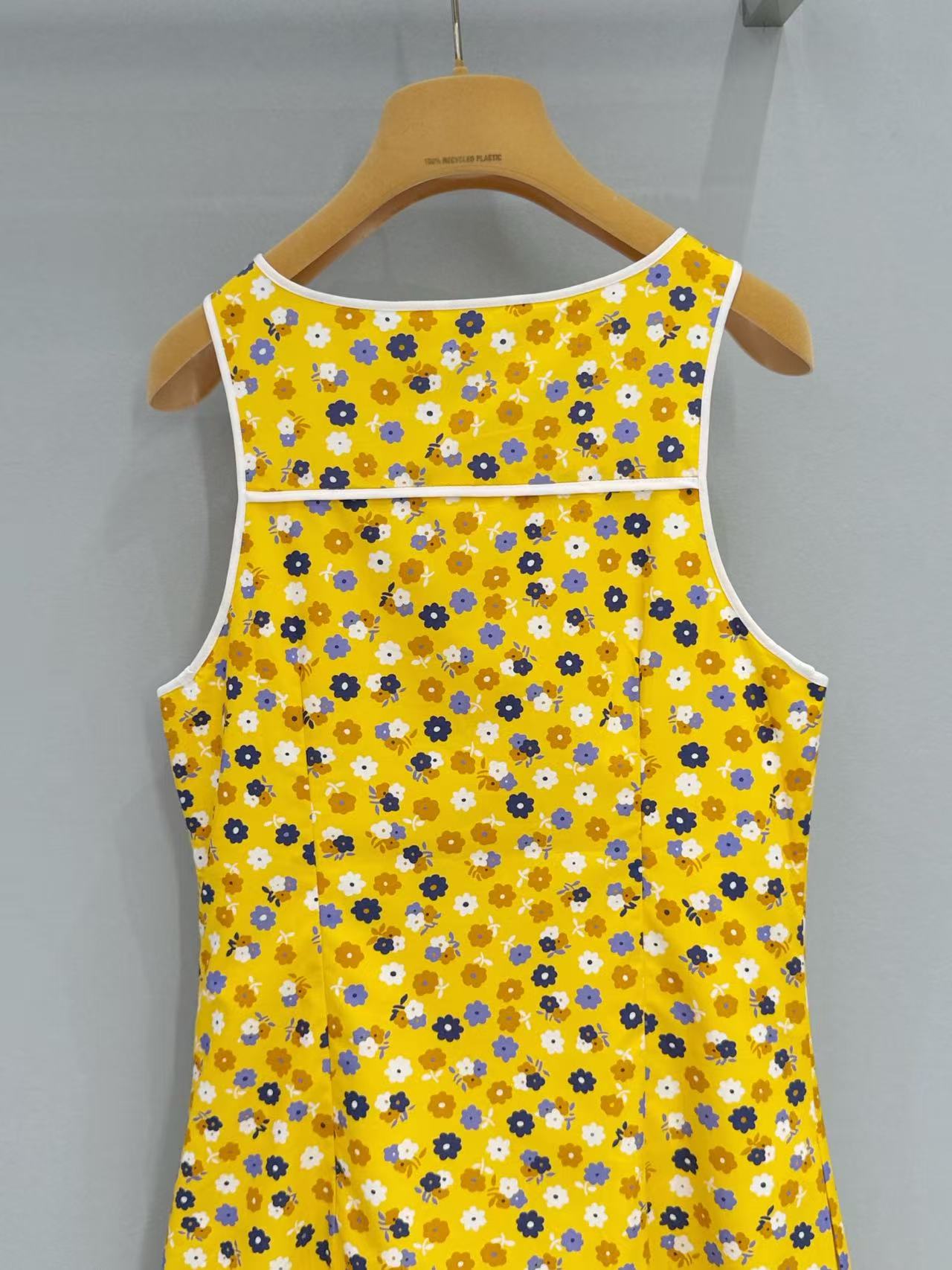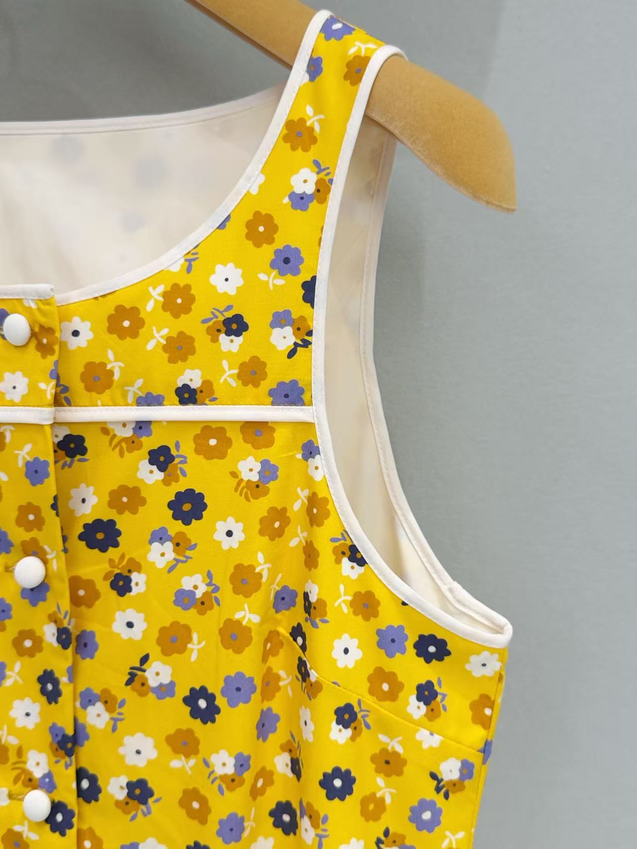 這款明黃色碎花無袖連衣裙絕對是夏天的亮點!明媚的黃色底色上,鋪滿了清新的小碎花,瞬間帶來活力四射的夏日氛圍。