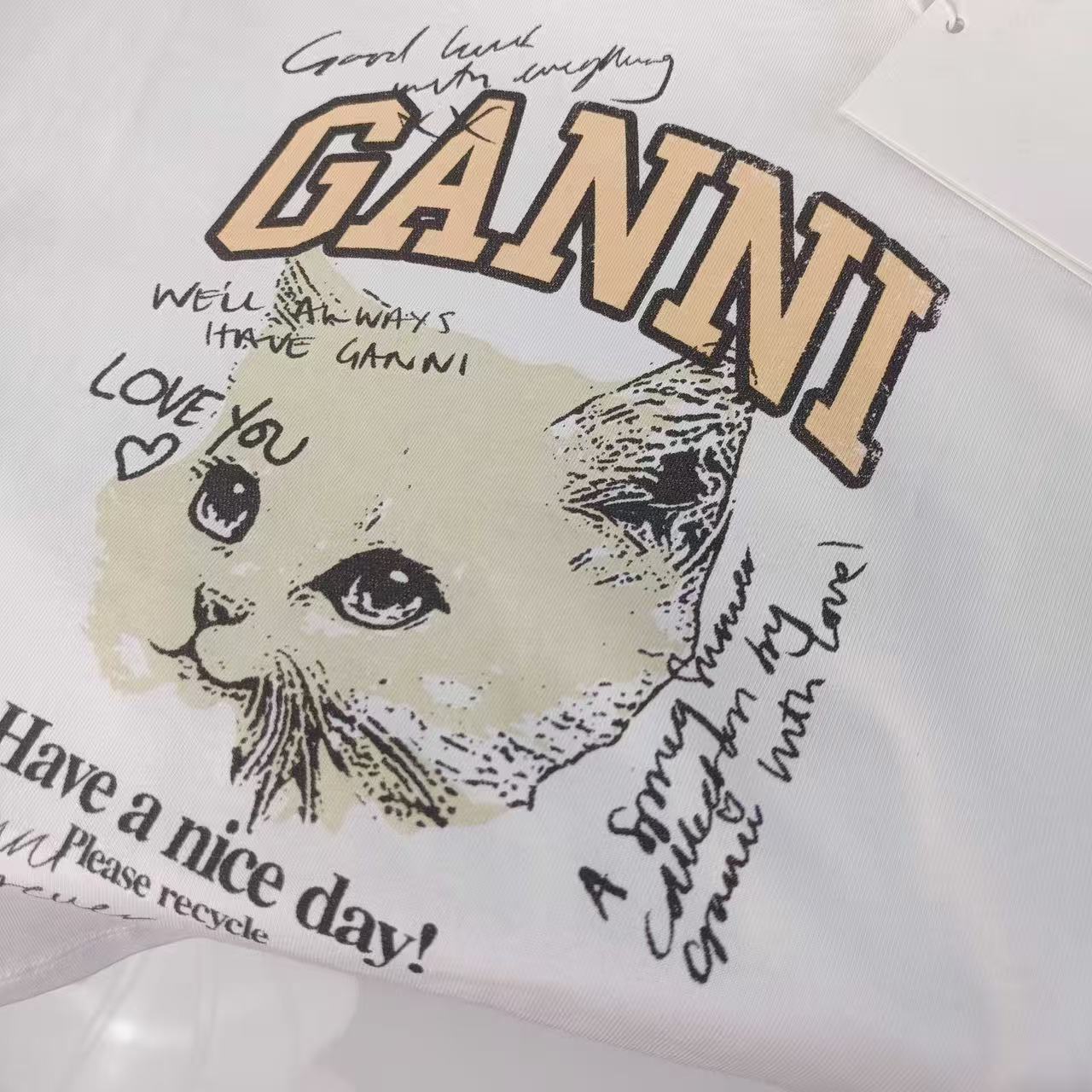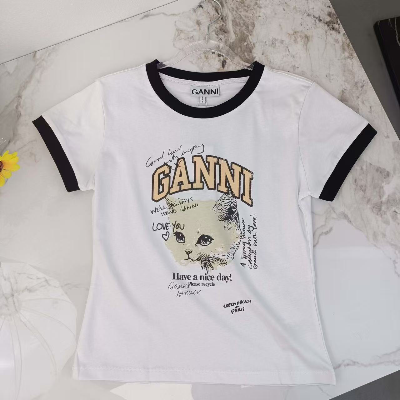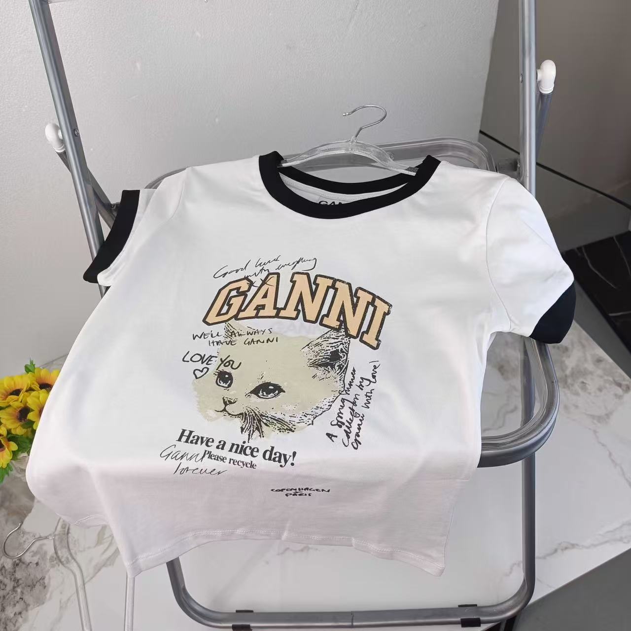 2025早秋新品 Ganni家 貓咪圖案撞色修身短袖