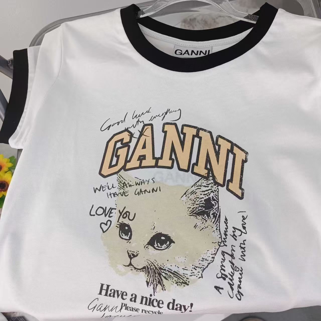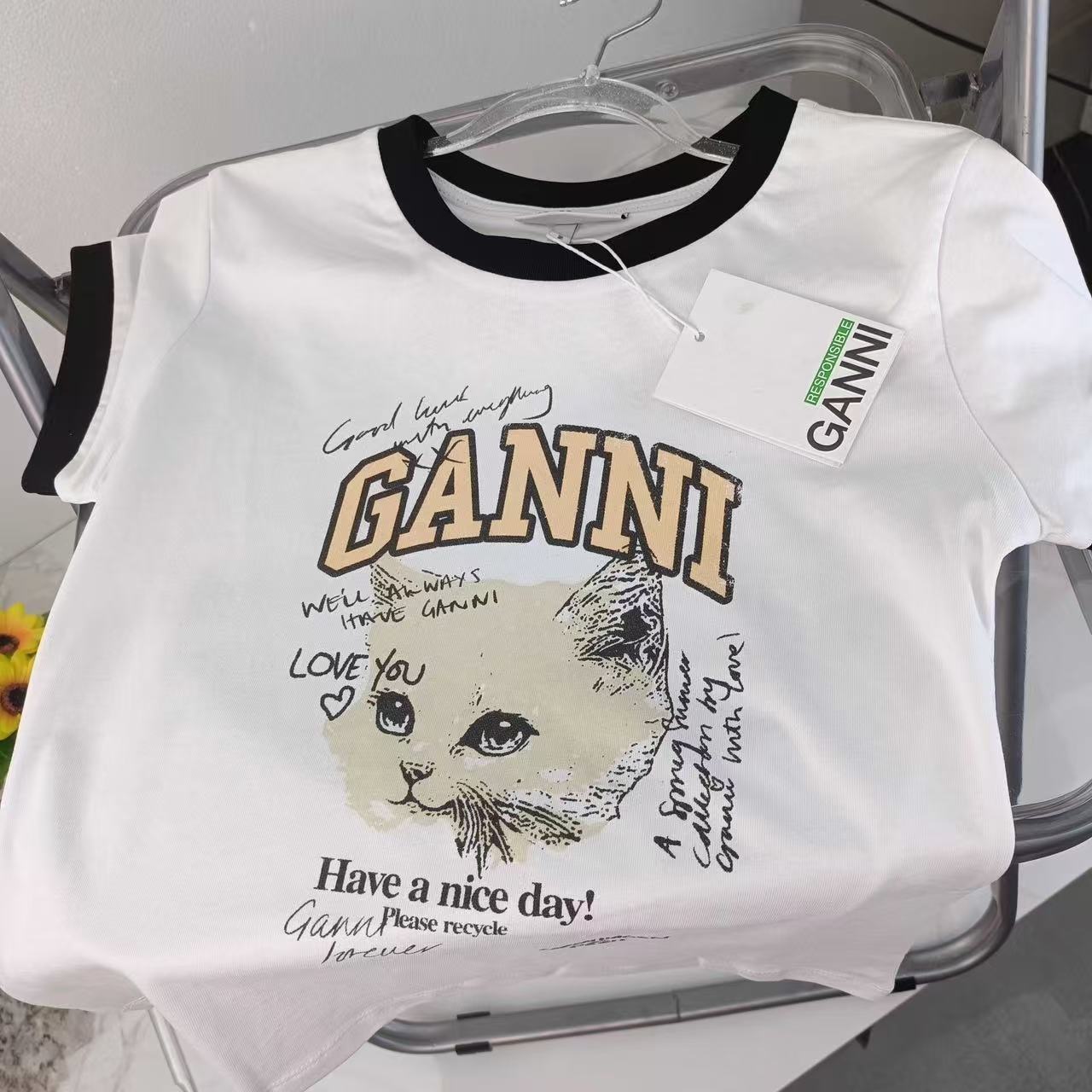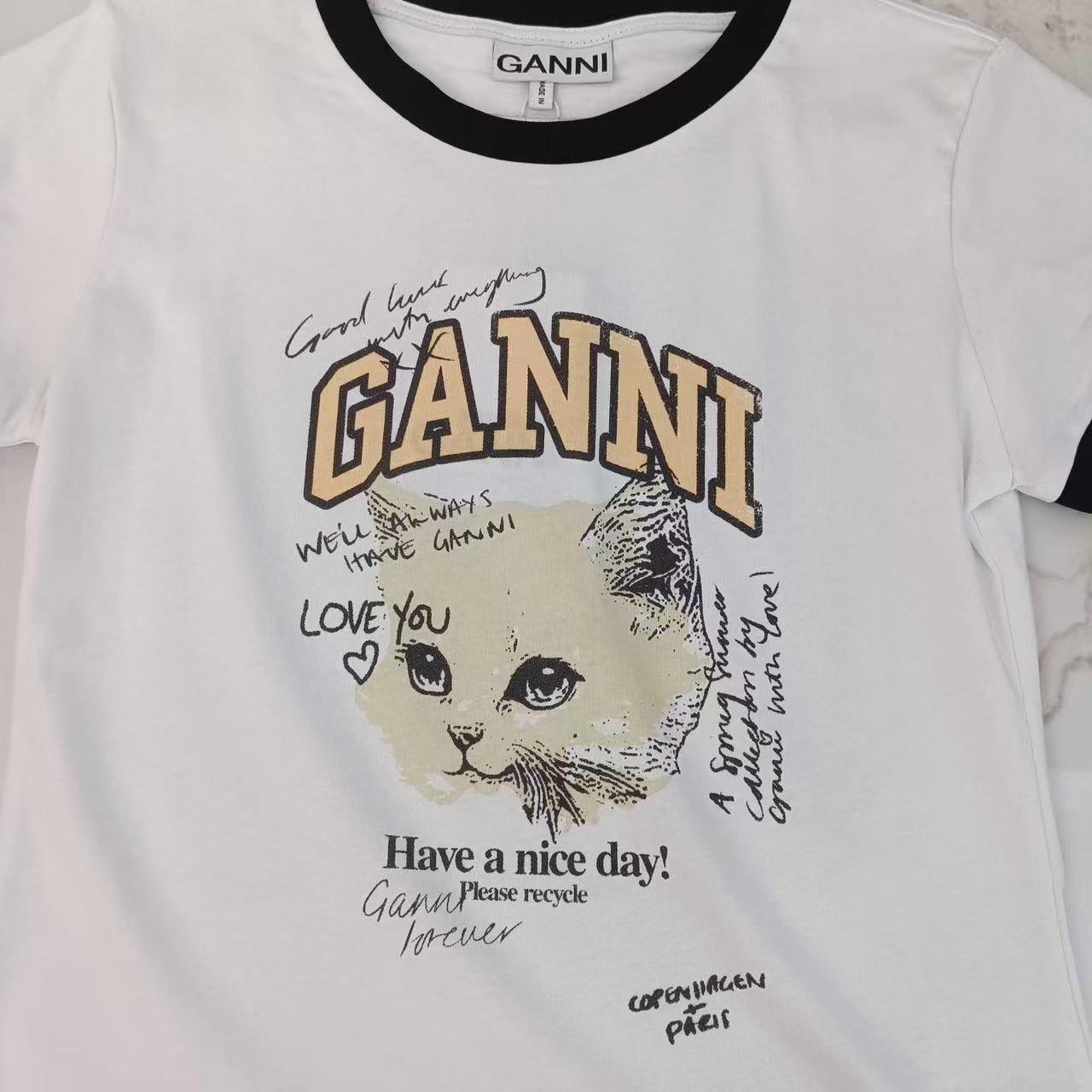 2025早秋新品 Ganni家 貓咪圖案撞色修身短袖