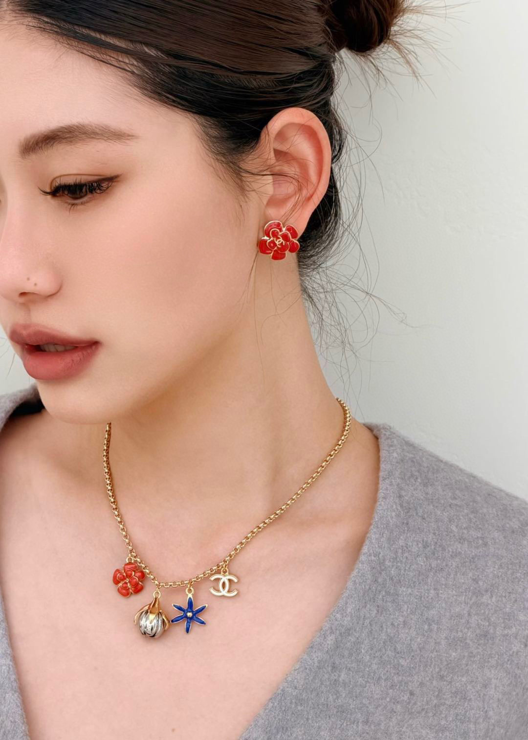 耳釘以立體山茶花造型呈現,搭配細緻的珐瑯工藝,整體光澤柔和又帶點高級感,細節處理非常精緻。