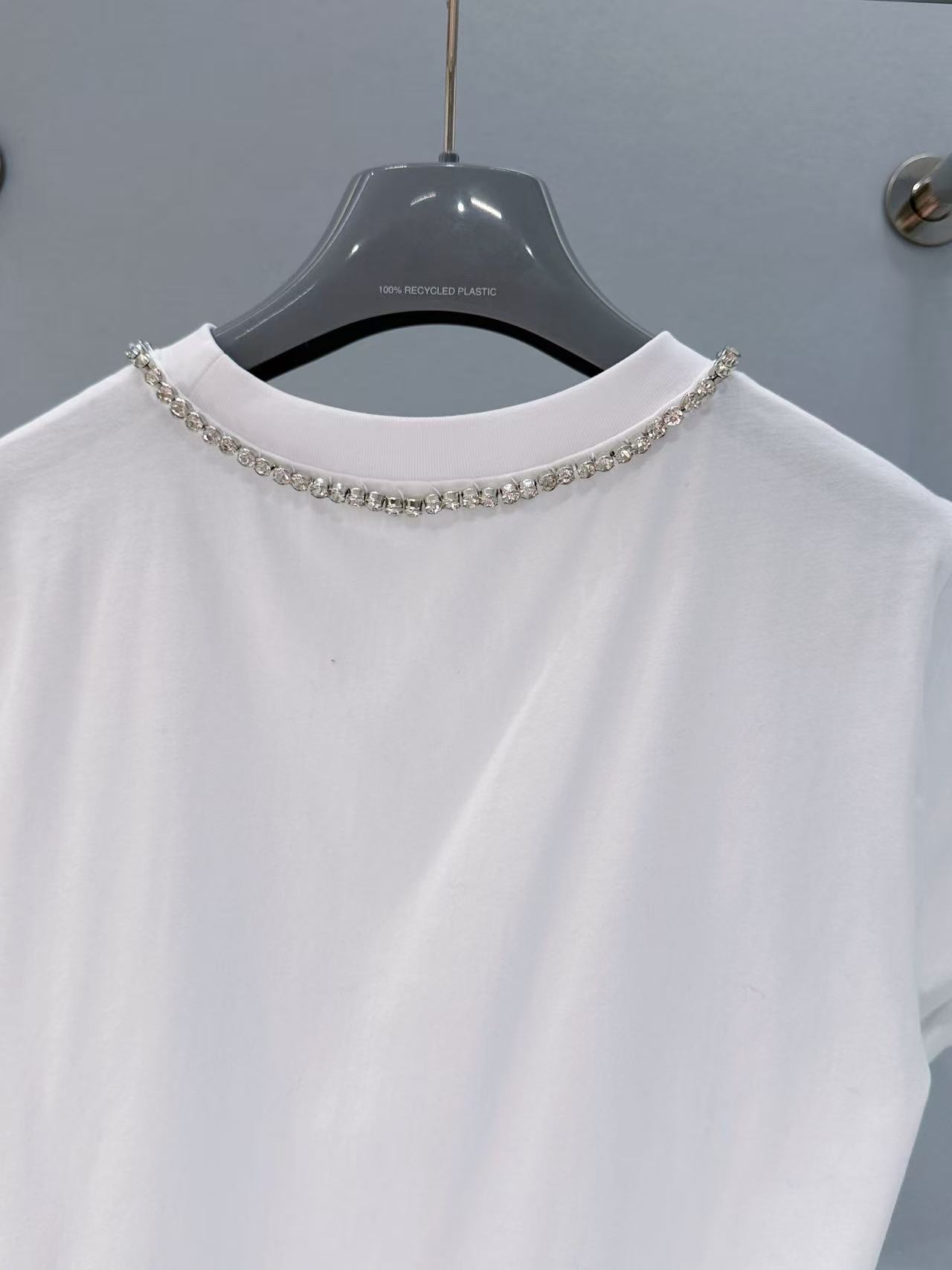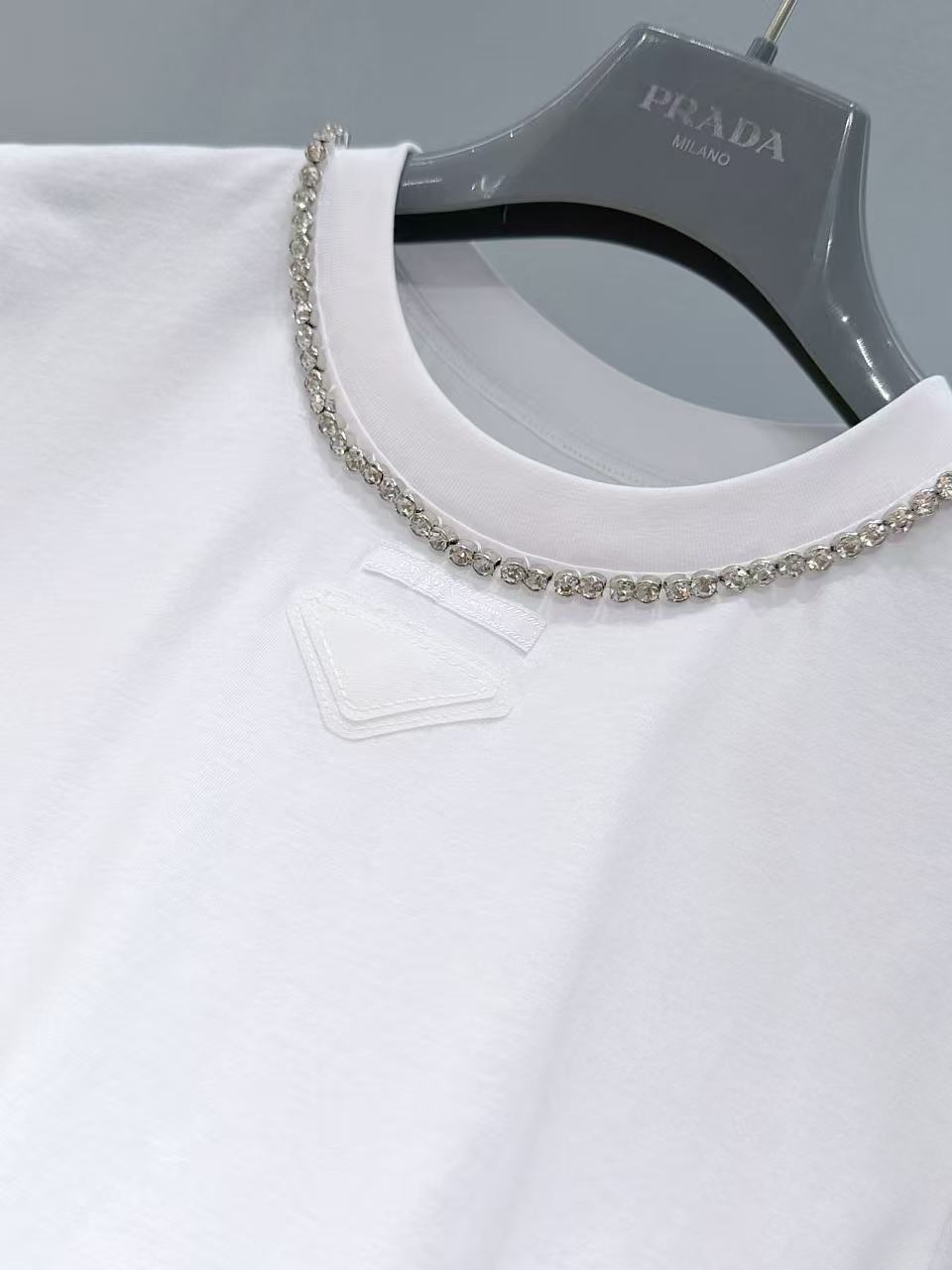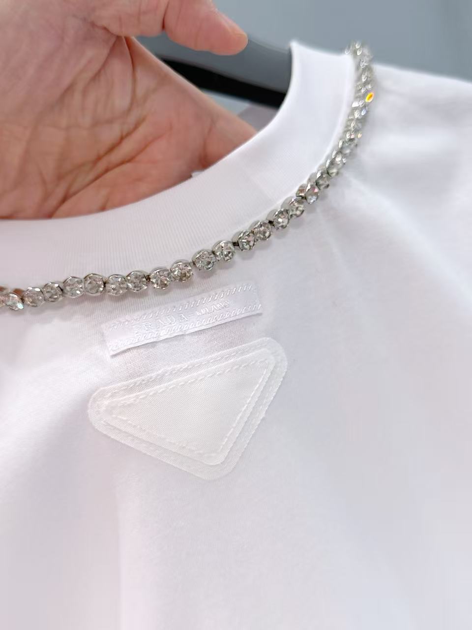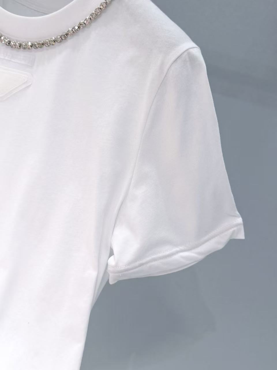 胸口裝飾織物三角形徽標,辨識度滿分;領口一圈鑲鑽點綴,精緻奢華感直接拉滿!
