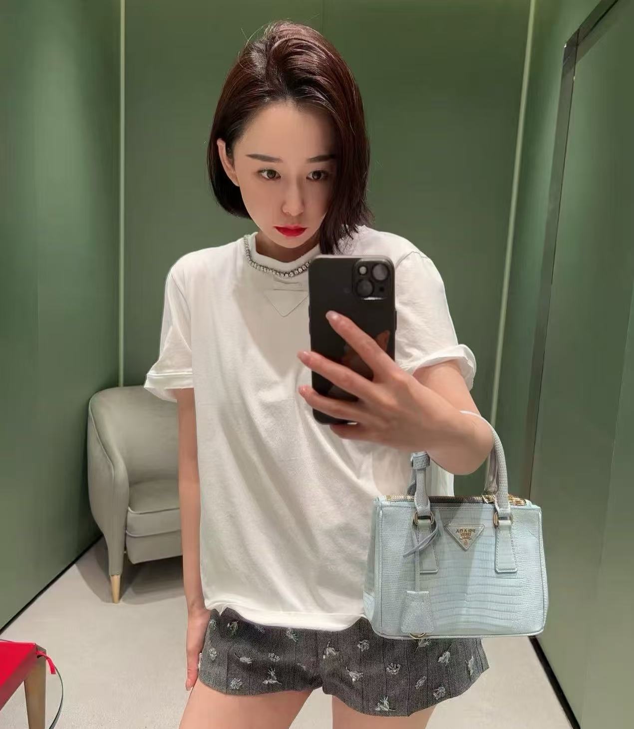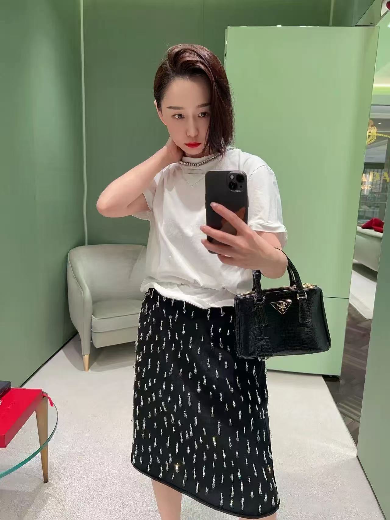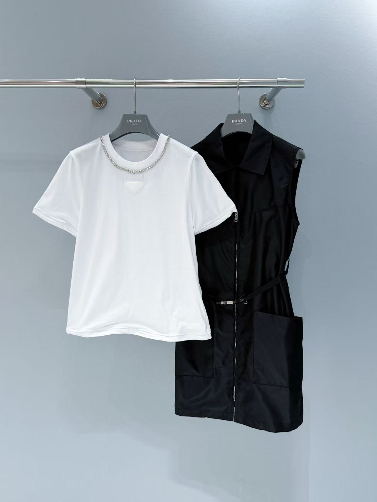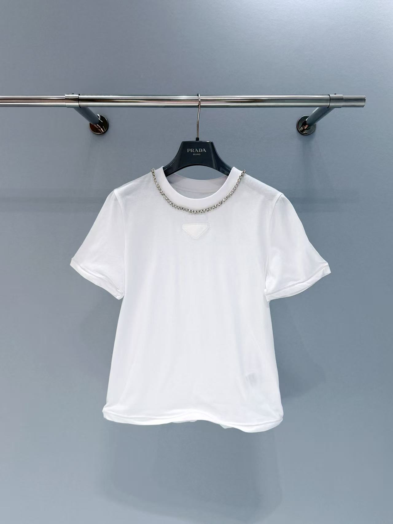 胸口裝飾織物三角形徽標,辨識度滿分;領口一圈鑲鑽點綴,精緻奢華感直接拉滿!