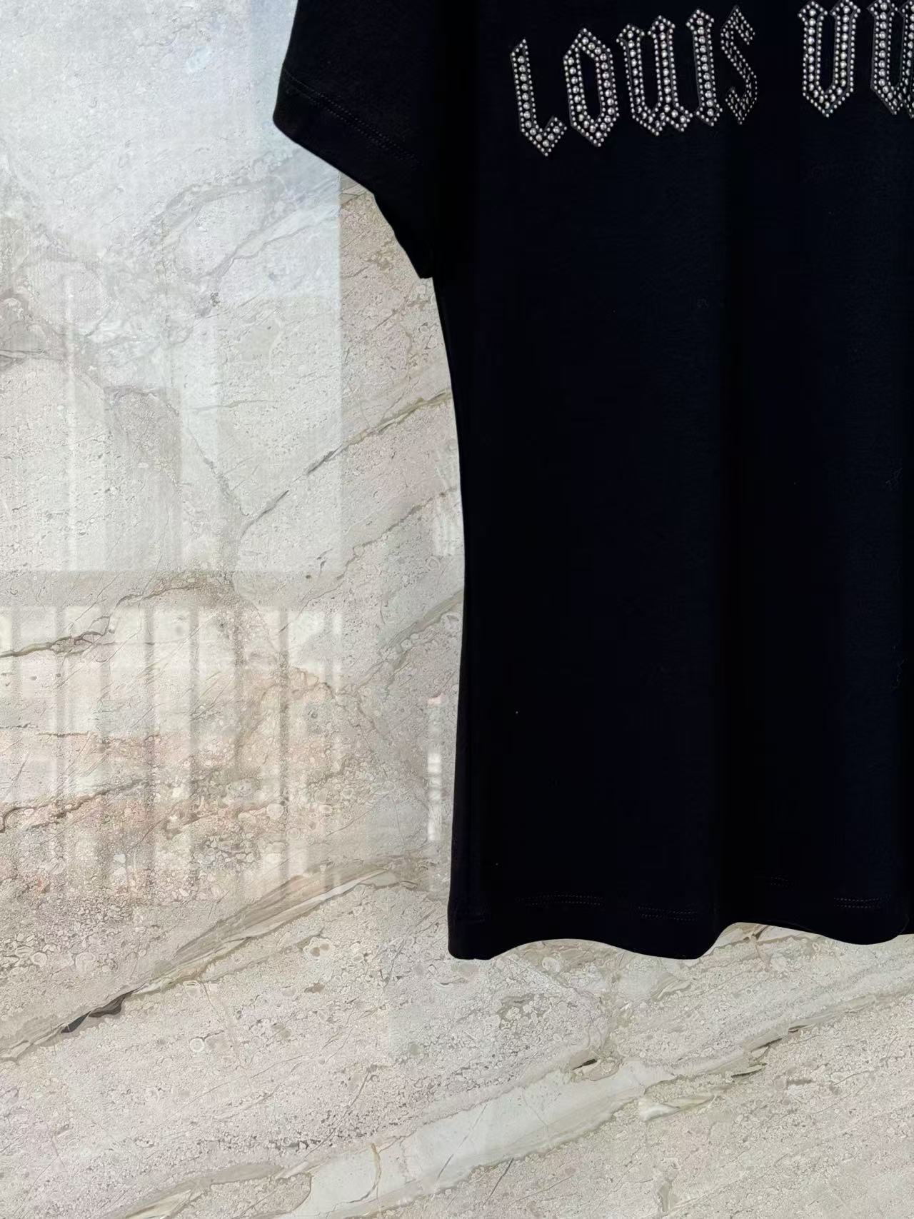 設計的核心聚焦於胸前那枚耀眼的水晶刺繡 Logo,不同於一般印花,手工鑲綴的水晶在光影下能隨著動作閃爍迷人光澤;搭配領口環繞的金屬鉚釘點綴,為經典的黑底 T 恤注入了獨特的層次感與細節美學。