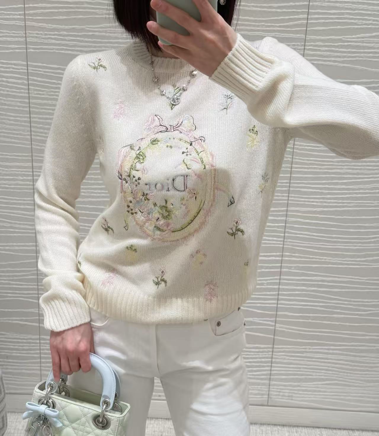 彩色的花卉刺繡並非平面的,而是帶有微立體感的電繡工藝,層次分明。蝴蝶結的線條流暢,將少女的甜美與精品的貴氣平衡得剛剛好。