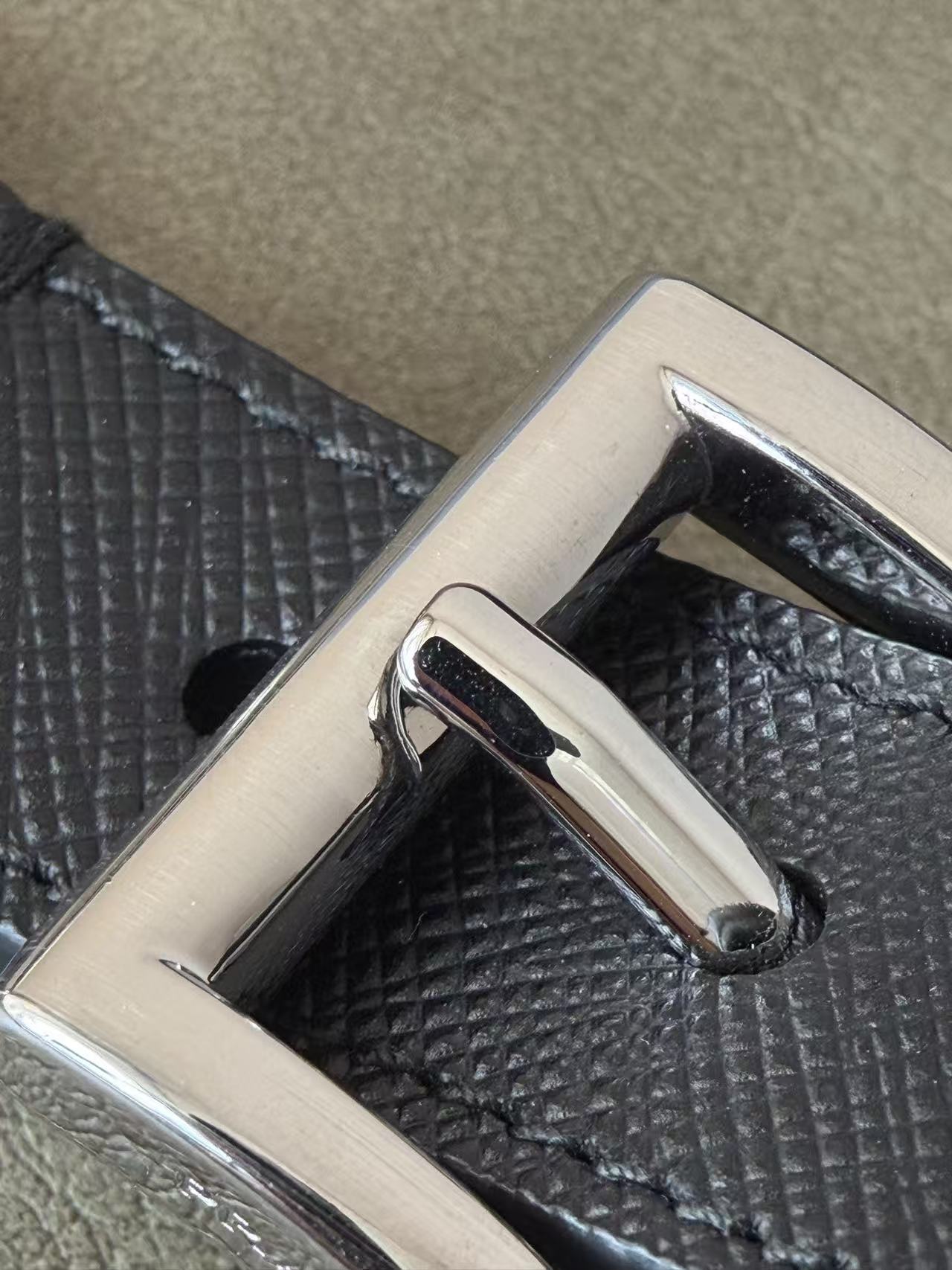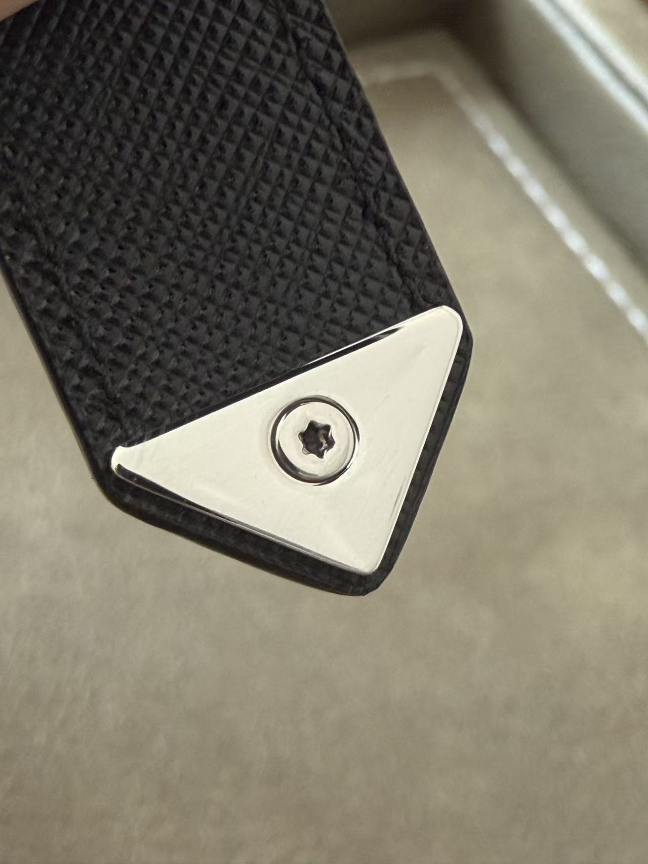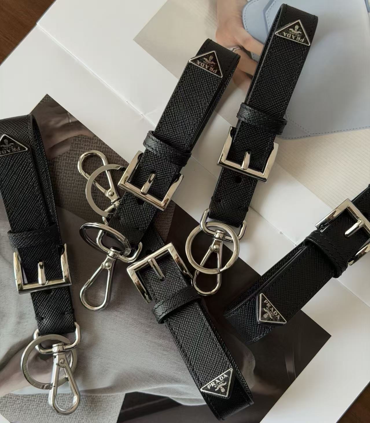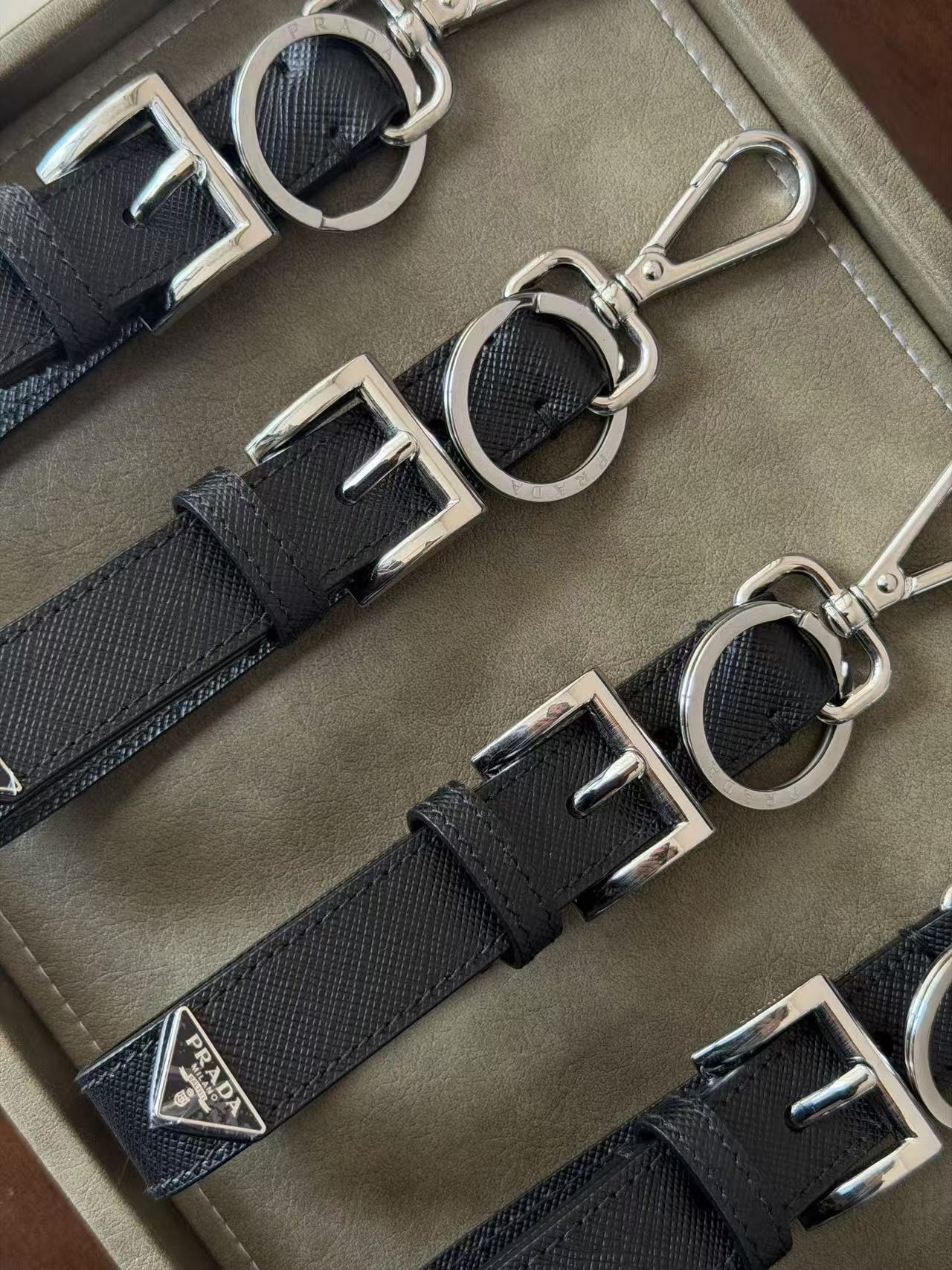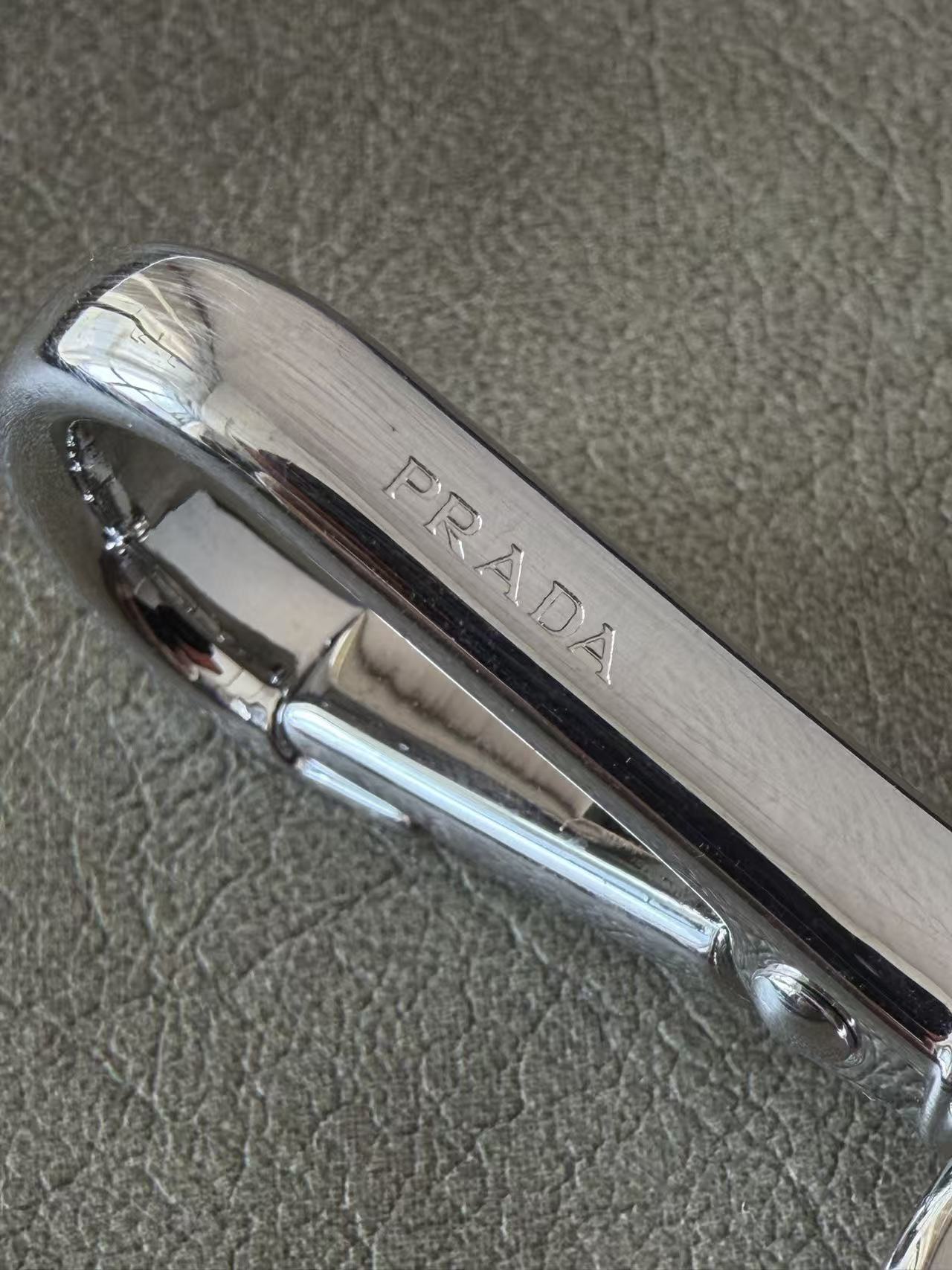 建築感冷冽五金配件: 選用高純度金屬打造環扣,色澤飽和且線條俐落,展現 Prada 一貫的現代都會美學。